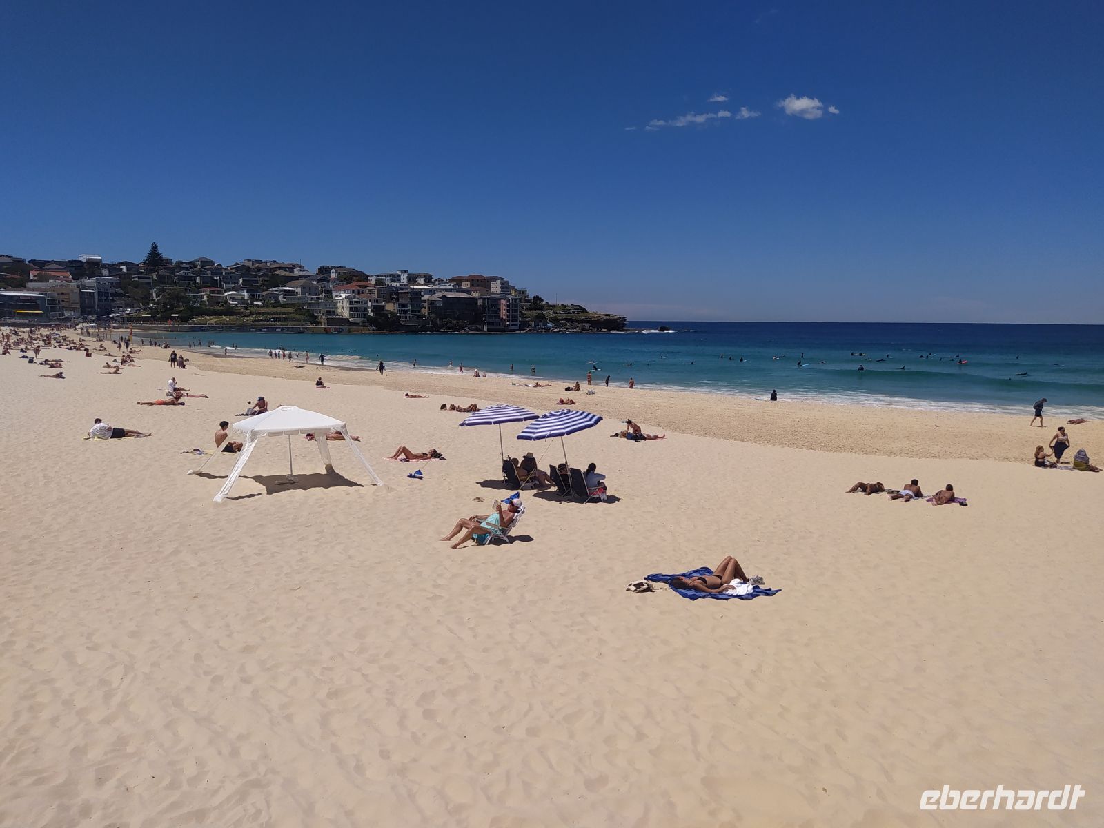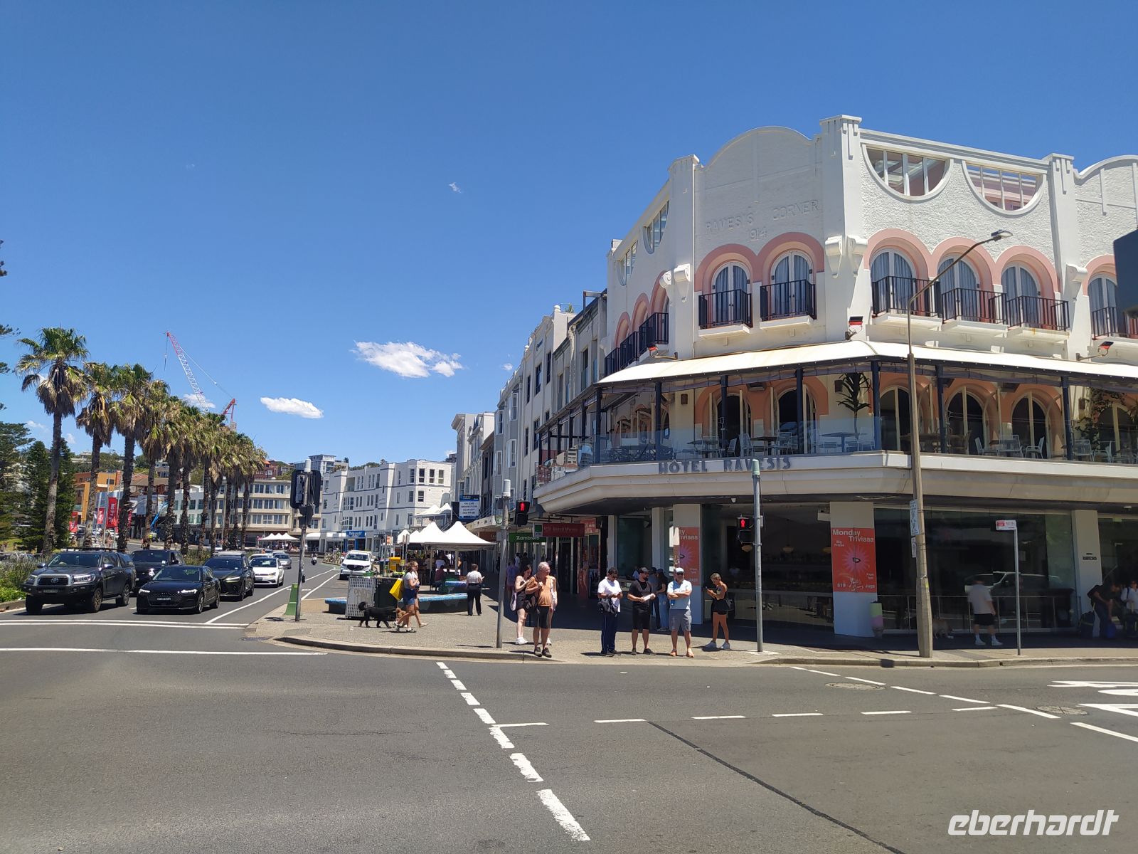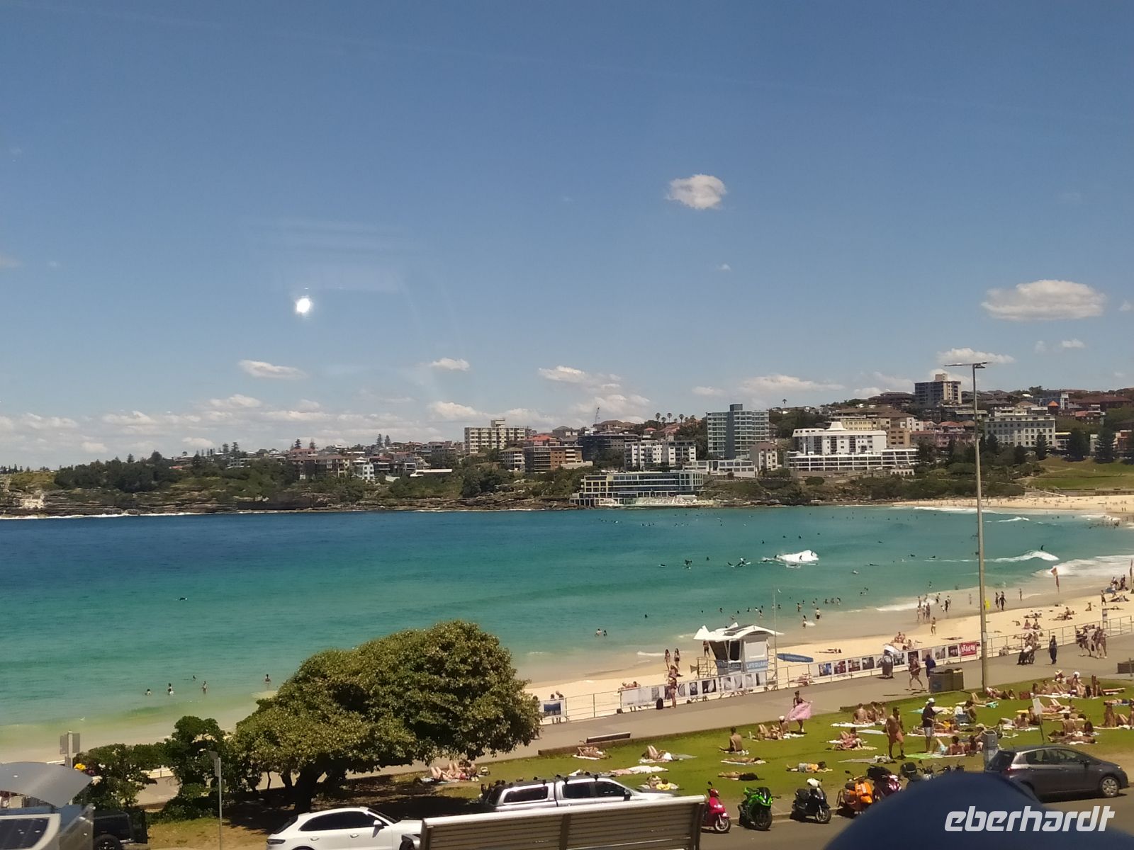 Weiter ging es zum berühmten Bondi Beach. Hier tummelten sich Surferinnen und Surfer im türkisfarbenen Wasser, während Sonnenanbeter das Strandleben genossen. Hätten wir unsere Badesachen dabeigehabt – wir wären sicher mit hineingesprungen!