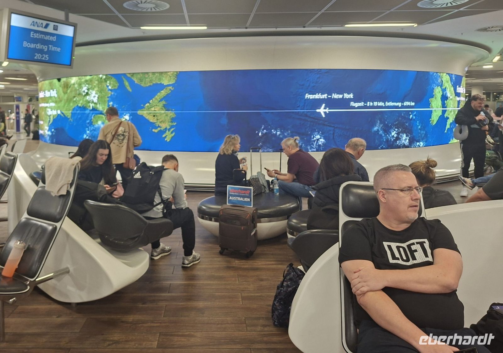 Nun ist es soweit, eine lange Reise beginnt, für mich mit der Bahn, denn ich treffe mich am Abend mit 4 Gästen auf dem Terminal 1 des Flughafens Frankfurt. Gemeinsam geben wir am Singapore-Arline-Schalter unser Gepäck auf und checken ein. Nach dem Sicherheits-Check gehen wir zum Gate B48 und treffen eine weitere Dame, die von Berlin geflogen war. Wir nehmen in den bequemen Lounge-Sesseln Platz und verfolgen die Präsentationen auf der riesigen Video-Wand. Schließlich werden wir nach neun Uhr abends zum Boarding aufgefordert. Da die Boeing 777-300 im hinteren Bereich nicht ganz ausgelastet ist, setzen wir uns etwas entspannter.