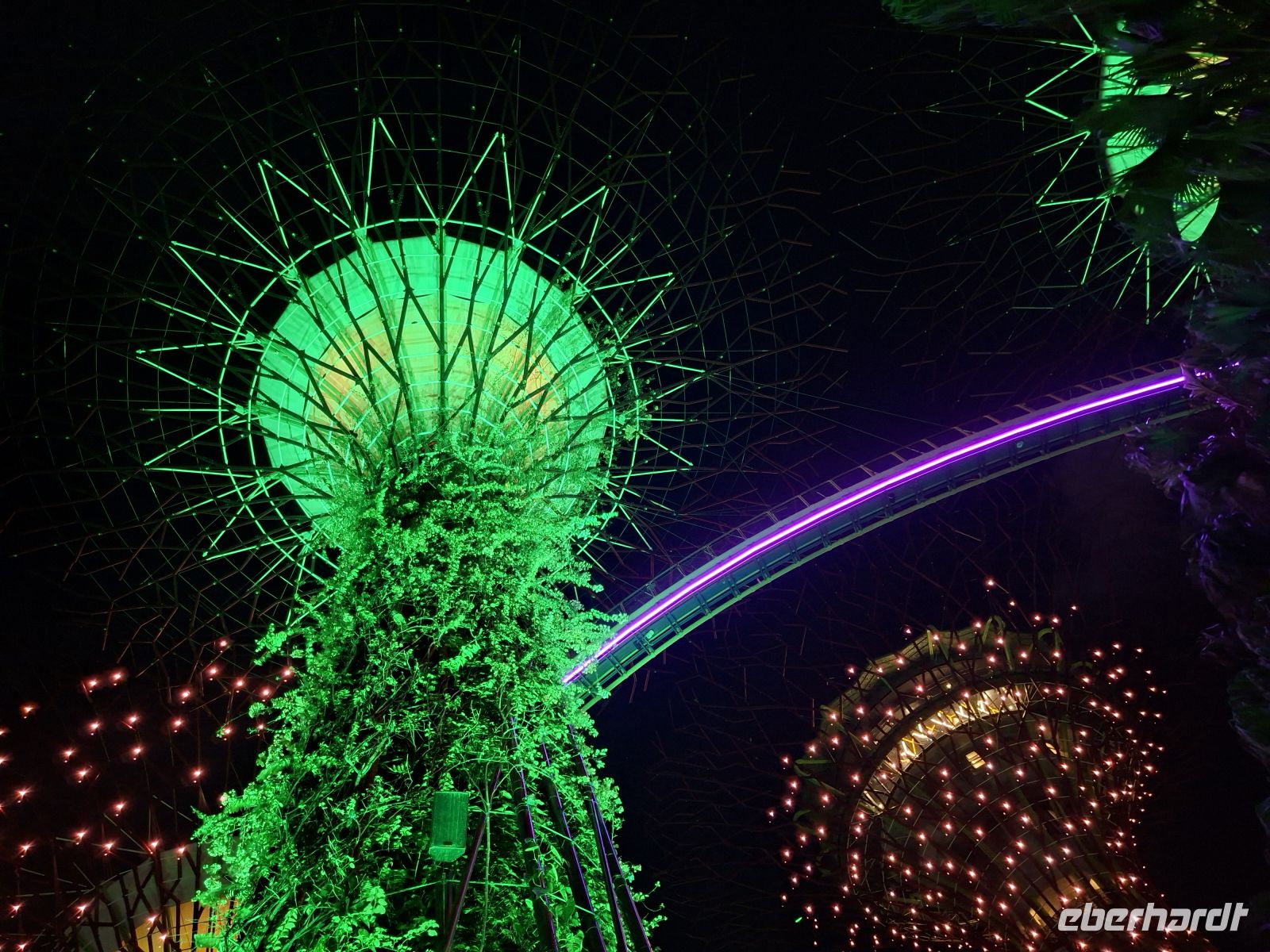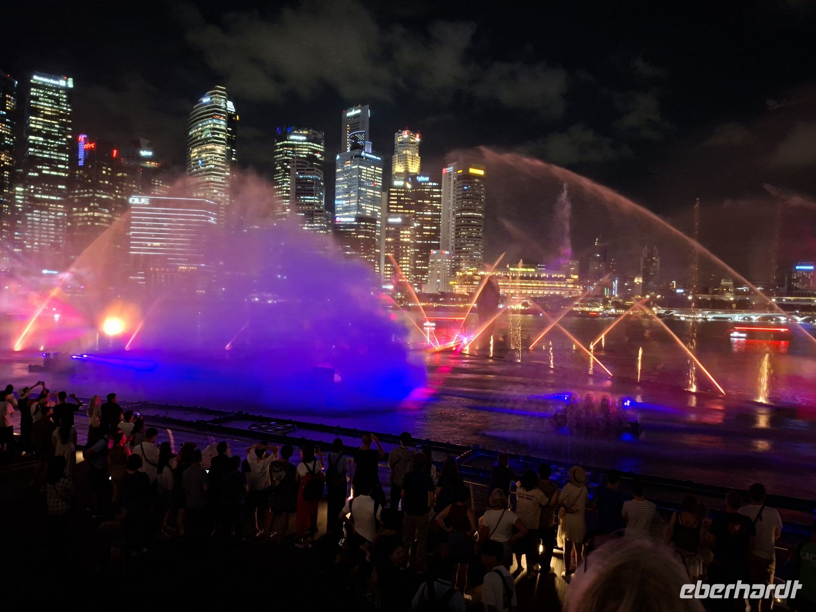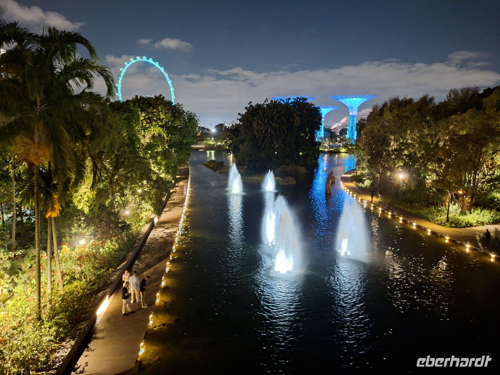 Wir treffen uns um 18:30 Uhr und fahren mit 2 Taxis zum Marina Bay Sands-Komplex, um dort im 2. Untergeschoss (B2) im Food-Court zu essen. Eine Vielzahl von Einheimischen sind um diese Zeit auf der Suche nach dem richtigen Speiseangebot der vielen Imbiss-Küchen. Auch wir werden schnell fündig und satt. Da pünktlich 20 Uhr die „Spectra Light & Watershow“ vor dem Marina Bay Sands-Komplex beginnt, laufen wir eilig durch den Einkaufstempel und erreichen rechtzeitig den Eventplatz vor dem Hotelkomplex. Es ist bereits dunkel und wir mischen uns unter die vielen Menschen. Gemeinsam filmen und bewundern wir die Lichtershow, die von lauter Musik untermauert wird. Nach 15 Minuten findet diese Show ein spektakuläres Ende und auch wir finden uns, um nun zur nächsten Show zu gelangen. Dazu folgen wir den Wegweisern „Gardens by the Bay“, die uns durch den Hotel-Einkaufs-Komplex zur anderen Seite führen und auch von dort weiter über und unter Straßen hindurch zum Gartenkomplex mit den künstlichen Superbäumen bringen. Unterwegs stoppen wir oft, um Fotos vom beleuchteten Marina Bay Sands Gebäude oder der gut ausgeleuchteten Umgebung zu machen. Um 20:45 Uhr beginnt die Rhapsodie der illuminierten Supertrees, dieses Mal wurde sehr romantische asiatische Musik gespielt. Nach diesem entspannten Ereignis sind wir uns einig, dass wir den Abend noch weiter genießen möchten. Mit einem Großraumtaxi fahren wir 6 Personen zum Raffles-Hotel, um den typischen Cocktail „Singapore-Sling“ zu probieren. Der nette Fahrer macht mit uns eine kleine Lichterfahrt durch die Stadt und setzt uns, wie gewünscht am Raffles-Hotel ab. Wir gehen zur „Long Bar“ des Hotels, wo schon einige Menschen warten. Nach kurzer Zeit bekommen wir einen Tisch zugewiesen und wenig später steht auch der Singapur-Sling vor uns. Zum Drink gibt es gratis Erdnüsse dazu und nur hier darf man die Schalen auf den Boden werfen. (Sonst wird das Herunterwerfen von Müll oder Abfällen in Singapur hart geahndet.)