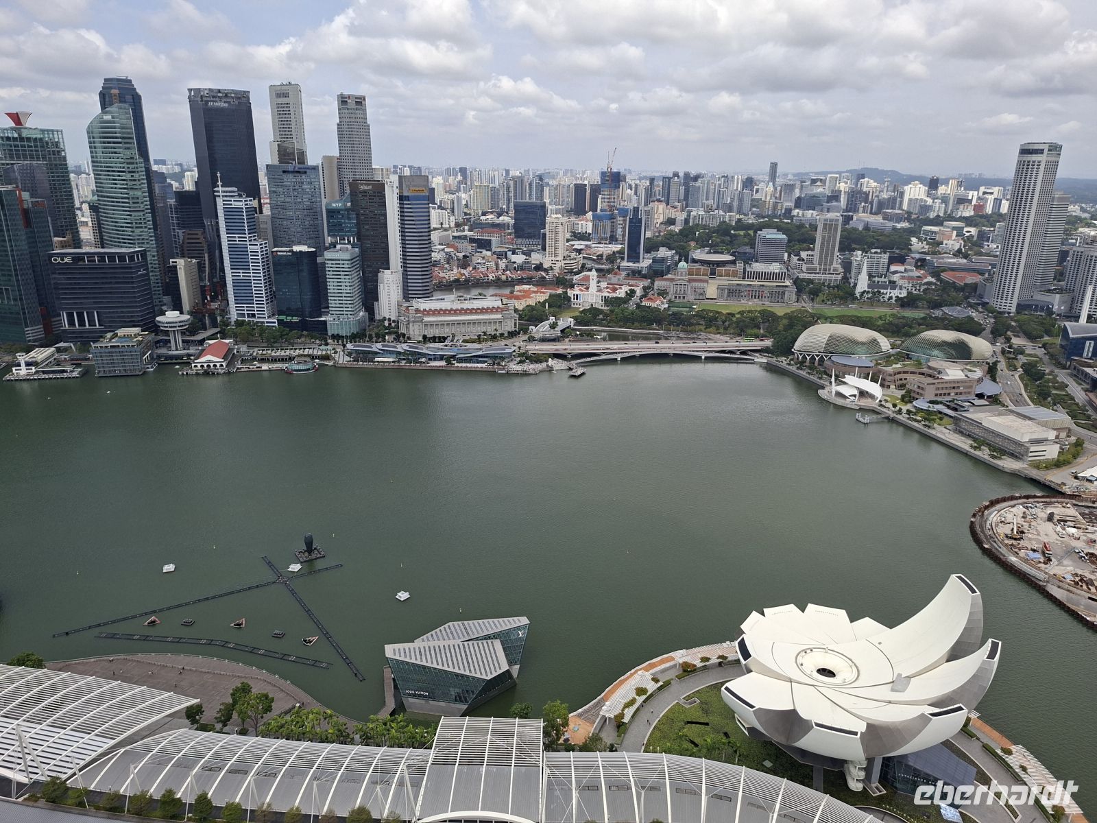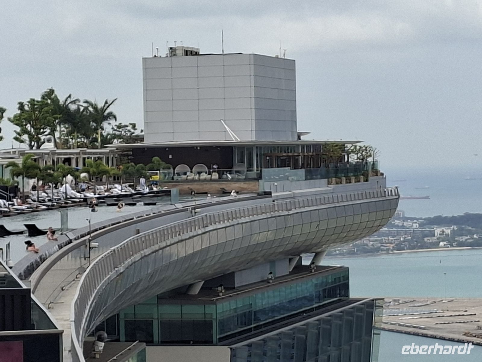 Mittags checken wir aus und beginnen mit unserem örtlichen Reiseleiter Achim den Tag in Singapur. Da das Wetter gut ist, beginnen wir gleich mit der Auffahrt im Tower 3 des Marina Bay Sands. Ein Lift bringt uns in 30 Sekunden in die 56. Etage, wo sich in 200 m Höhe die Aussichtsplattform des Hotelkomplexes befindet. Wir können weiter links den Hotelpool „Infinity“ sehen, dessen Nutzung aber nur Hotelgästen vorbehalten ist.