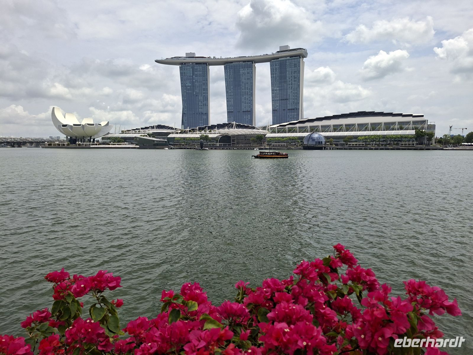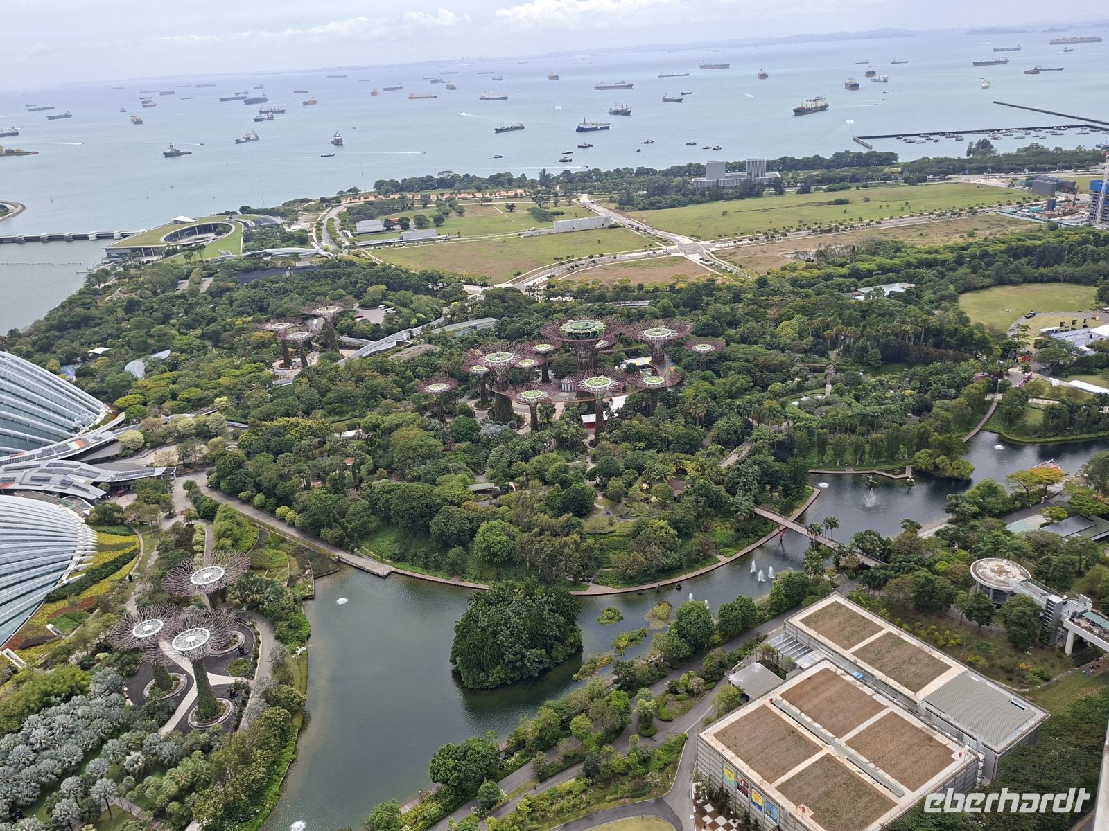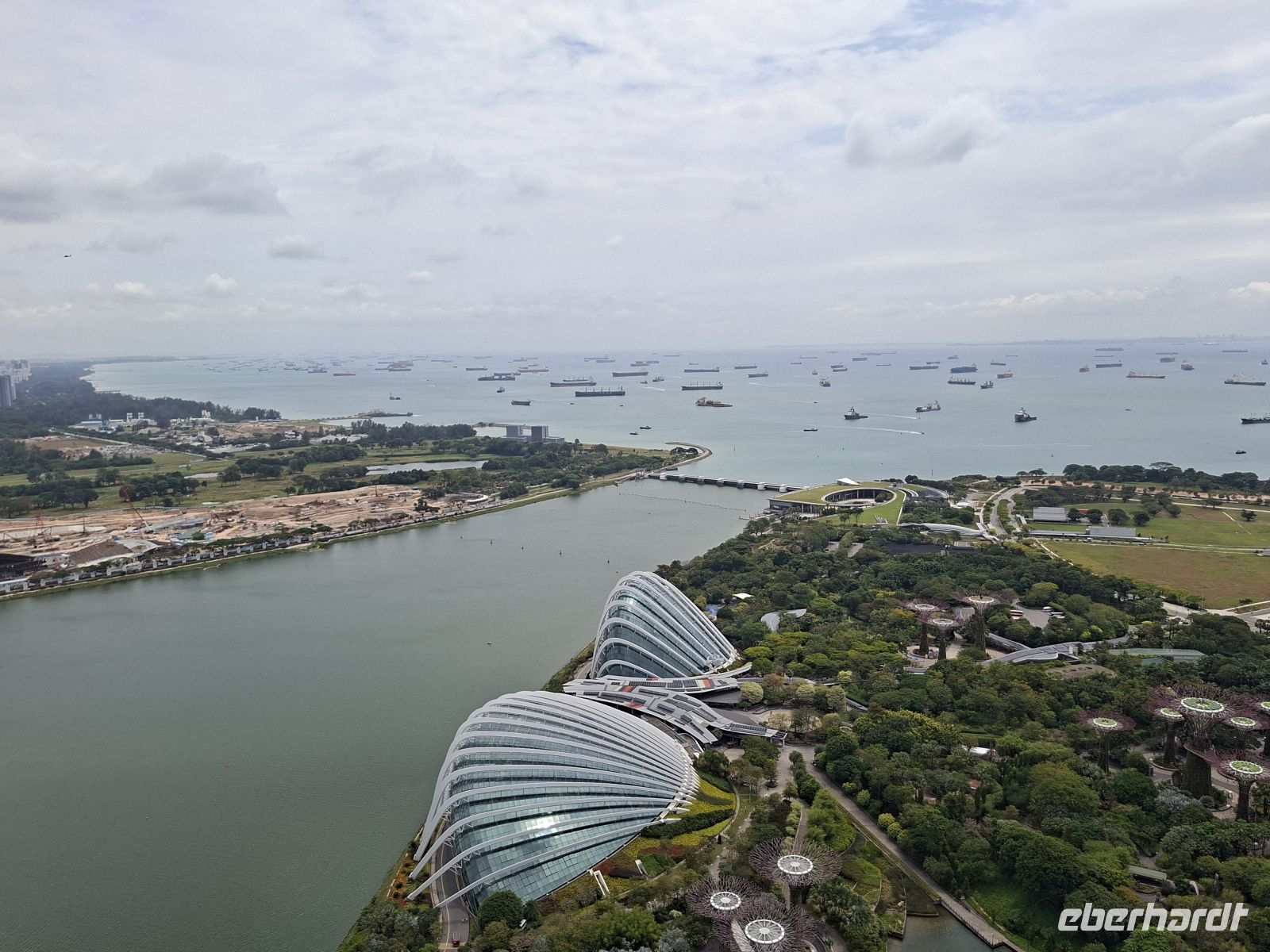 Mit den guten Sichtverhältnissen können wir bis Indonesien und Malaysia schauen, sehen aber auch das nahe Bankenviertel und die vielen Schiffe, die auf Ihre Abfertigung im Überseehafen Singapore warten. Als uns der Fahrstuhl nach einer Stunde wieder nach unten bringt, erläutert uns Achim, dass die Sands-Group für mehrere Milliarden Singapur-Dollar einen 4. Tower für das Marina Bay Sands plant. Dieser Firma gehört auch das Casino, dass jährlich Milliarden Dollar für den Stadtstaat erwirtschaftet. Übrigens ist nirgends auf der Welt die Dichte an Milliardären so groß wie hier.