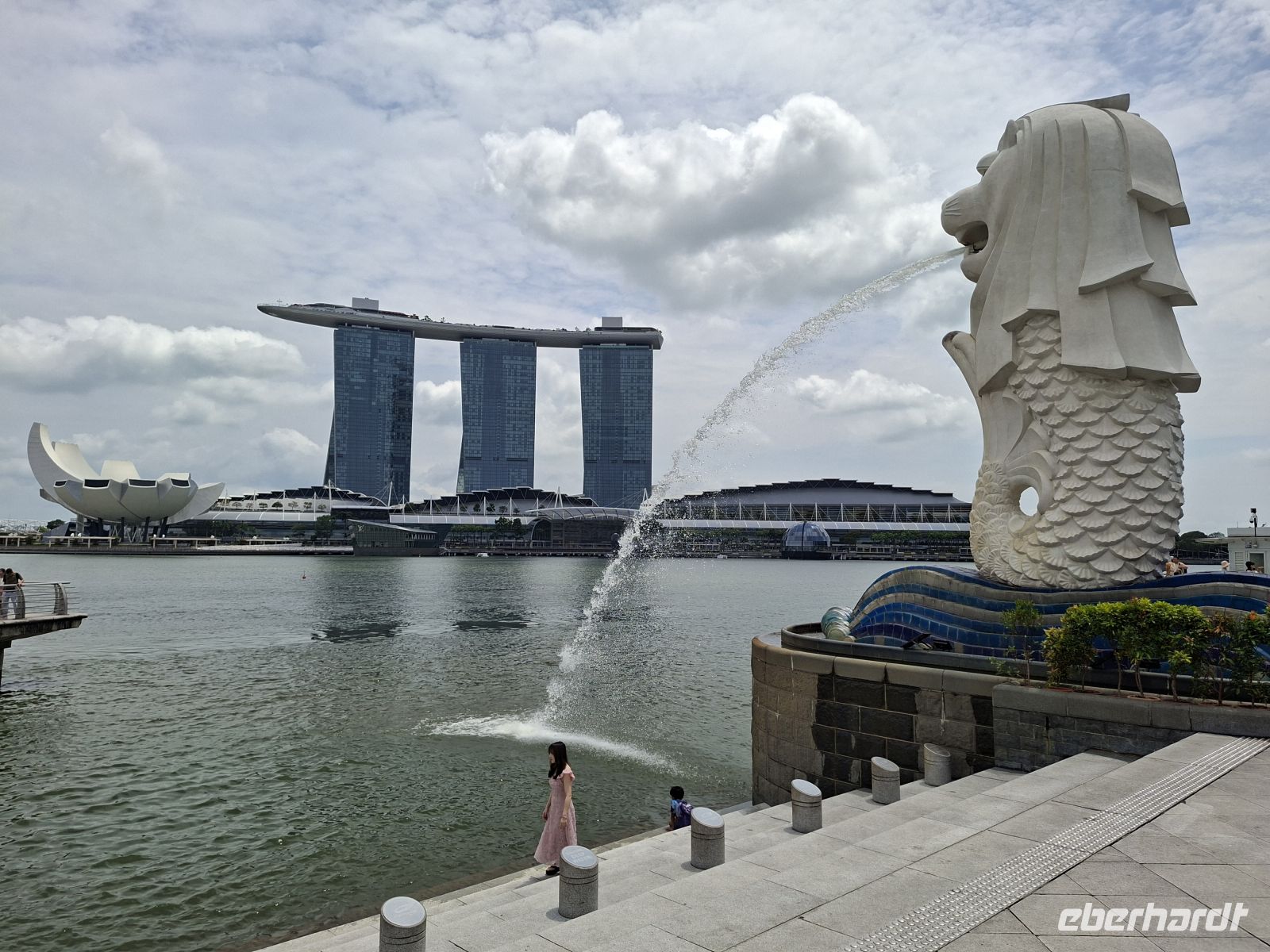 Nun steigen wir in den klimatisierten Bus und bekommen vom Fahrer eine Flasche Wasser. Nach kurzer Fahrt erreichen wir das Bankenviertel und steigen aus. Bei einem kleinen Spaziergang entlang der Waterfront zum Wahrzeichen Singapurs, den Merlion, bieten sich zahlreiche Fotomotive. Der wasserspeiende Löwe mit Fischschwanz verspricht Macht und Reichtum.