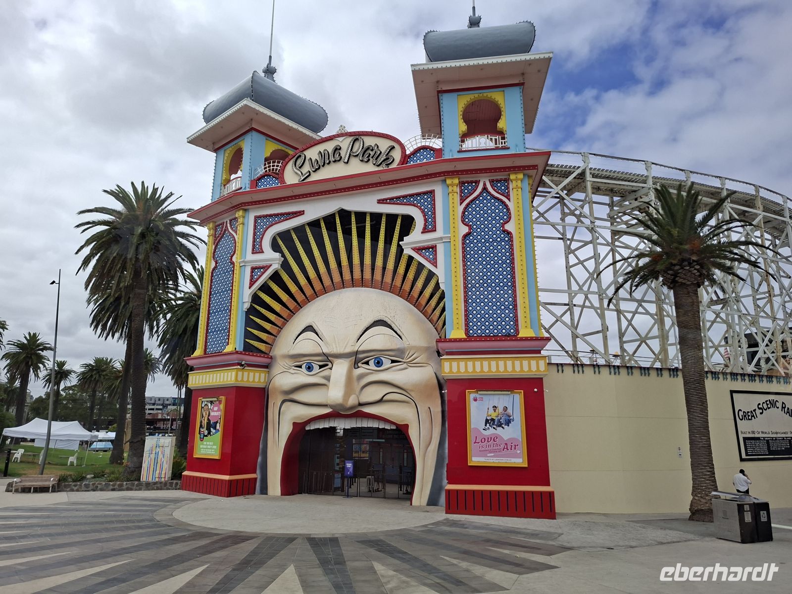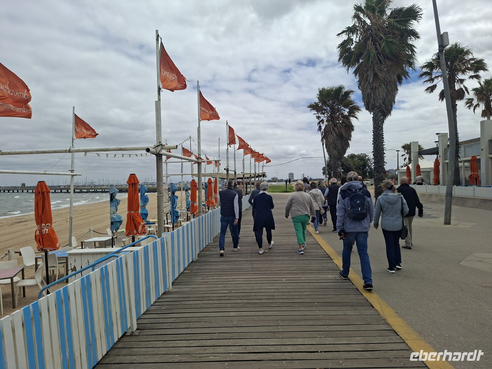Weiter geht die Fahrt nach St. Killda, ein neu erwachtes Szeneviertel Melbournes. Auch hier wird für das bevorstehende Wochenende alles für ein Festival hergerichtet. An der Uferpromenade steigen wir aus und laufen gemütlich ca. 2 km entlang der Esplanade. Am Ende unseres Spaziergangs wartet bereits Fionas Bus. Nun fahren wir ins Business-Zentrum von Melbourne, über die Prachtstraße Collins Street weiter zum Bankenviertel bis zum Paris End. Immer erläutert uns Liz im perfekten Deutsch die Sehenswürdigkeiten und die Geschichten dazu.