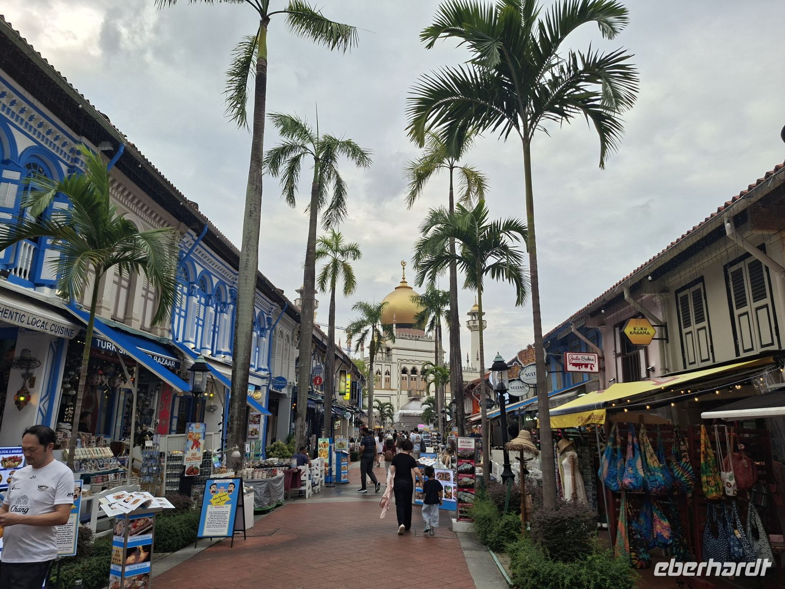 Wir nutzen unsere Kreditkarten lieber dazu, in einem Chinarestaurant ein spätes Lunch einzunehmen und hoffen so, bis zur Bordverpflegung heute Nacht ausgesorgt zu haben. Anschließend fahren wir zur letzten Station unseres Singapur-Besuches, dem arabischen Viertel „Kampong Glam“. Die Sultans-Moschee mit goldener Kuppel und goldenem Minarett protzt in den sonst engen und geschäftigen Gassen. Viele Shops bieten Stoffe und Kleidung, Souvenirs und Kosmetika an. Aber auch Restaurants haben exotische Speisen im Angebot. Wie in 1000 und 1 Nacht wimmelt und duftet es in den Gassen. Auf dem Platz um die Moschee bereitet man sich auf die Feier zum Beginn des Fastenmonats Ramadan vor. Mit diesen Eindrücken vom Leben in einer multikulturellen Stadt starten wir in Richtung Flughafen.
