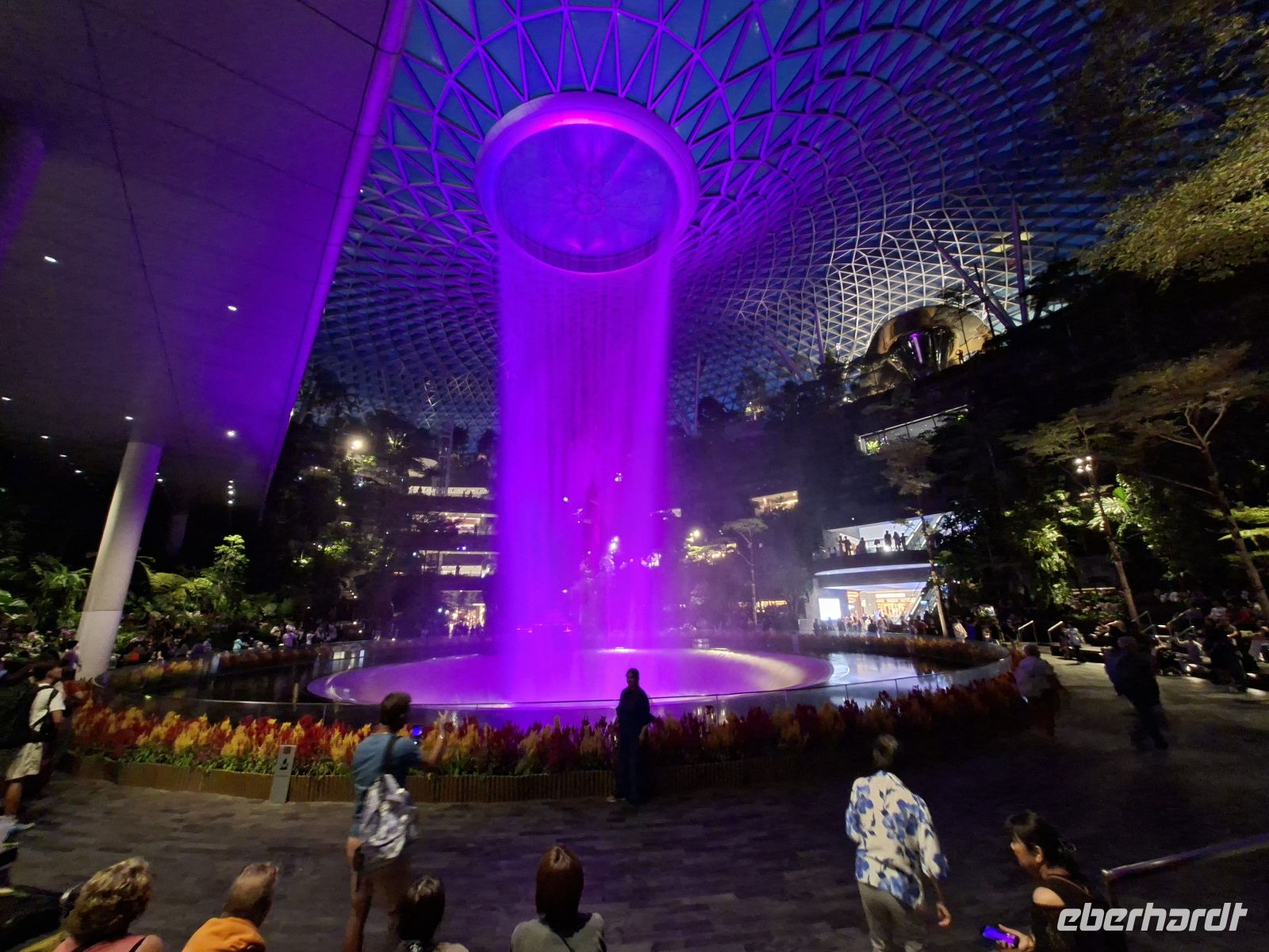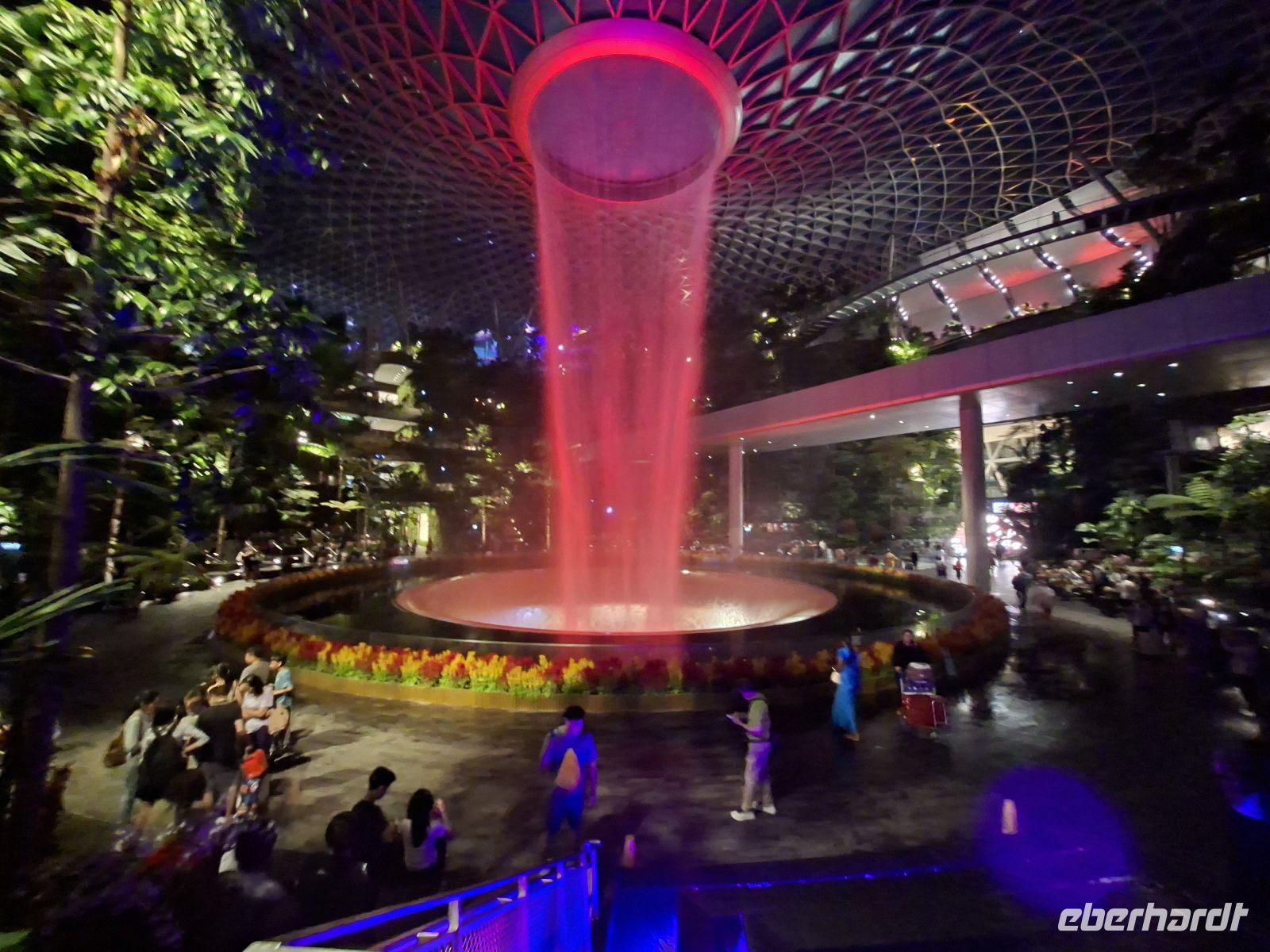 Gemeinsam mit Reiseleiter Achim fahren wir mit dem kostenlosen Sky-Train zum Terminal 1, um zum künstlichen Wasserfall „The Jewel“ zu gelangen. Nach der Verabschiedung vom Reiseleiter Achim bewundern wir in der riesigen Halle den 30 m hohen, beleuchteten Wasserfall und vergessen fast die Zeit. Um 20:00 Uhr starten wir zum Gate C1 im Terminal 1 und füllen in Ruhe die Einreiseanmeldungen für Australien aus. Nachdem alle Passagiere an Bord der Boeing 777 sind, startet der Flug-Nr. SQ227 pünktlich um 21.50 Uhr in Richtung Melbourne. Nach Erreichen der Flughöhe bringt uns das nette Bordpersonal unser Abendessen und Getränke. Satt und zufrieden, aber voller Erwartungen, fliegen wir durch die kurze Nacht und finden hier und da vielleicht auch etwas Ruhe und Schlaf.