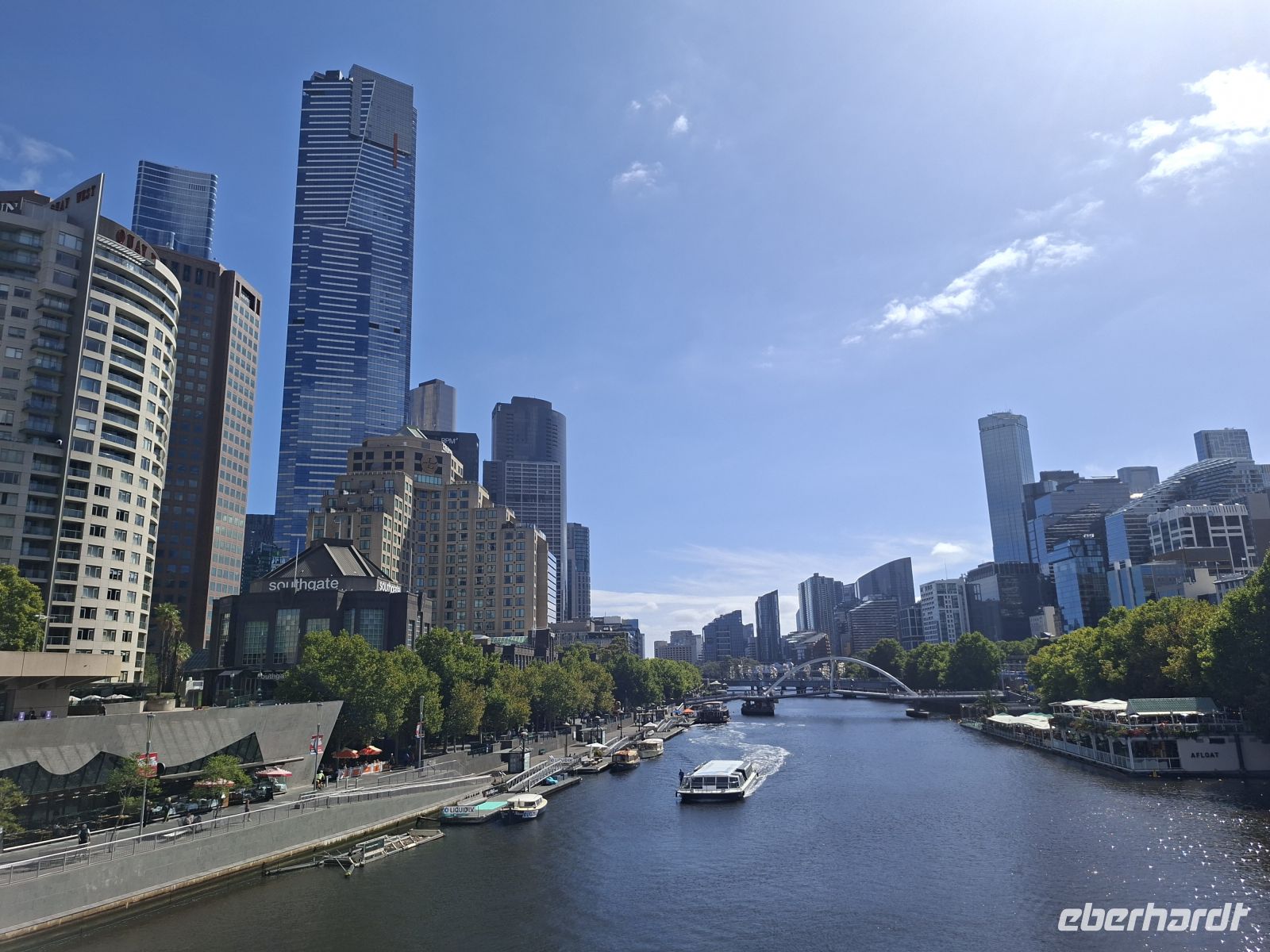 Um 09.30 Uhr starten wir in Richtung Hotel und Liz zeigt uns auf der linken Seite der Flughafenstraße eine große Herde Kängurus, die in der Ferne am Hang friedlich grasen. Während der Fahrt erläutert Liz einige Details zum Leben in Melbourne, aber auch den weiteren Tagesverlauf. Nach 45 Minuten erreichen wir unser Hotel im Zentrum Melbournes. Nach dem Empfang unserer Frühstücksboxen und dem Zimmerbezug haben wir etwas Freizeit. Ich nutze die Zeit, um in das nahegelegene Einkaufszentrum „Southgate“ zu gehen.