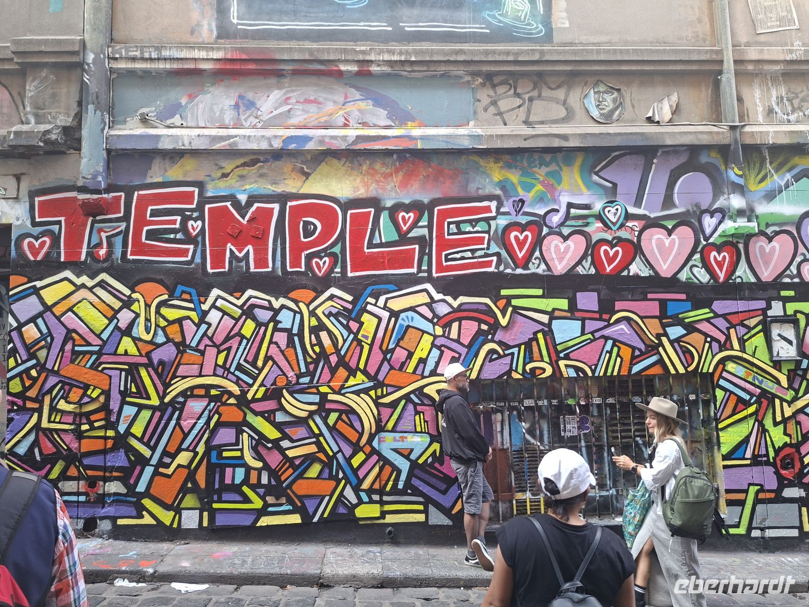 Einen letzten Stopp legt Fiona zum Ausstieg am „Königlichen Botanischen Garten“ ein. Von dort spazieren wir zum Memorial „Shrine of Remembrance“, von wo wir den freien Blick auf die Skyline Melbournes genießen. Pünktlich um 16 Uhr hat unsere Fahrerin Fiona Feierabend, sie bringt uns noch ins Zentrum. Von hier erkunden wir die Stadt zu Fuß. Wir überqueren den Yarra-Fluss und gelangen zum Federation Square, wo gerade eine Laiengruppe einen Tanz aufführt. Das darf dort zu jeder Tageszeit gemacht werden und ist erlaubt. Liz erläutert uns die besondere Beschaffenheit des Platzes, der auch Rollifahrern gute Akustik und Sicht bietet. Wir gehen weiter zur Hosier Lane, einem Eldorado für Graffiti-Künstler. Schließlich gelangen wir ins Einkaufsviertel und Liz führt uns durch die wunderschönen Jugendstil-Arcaden, die Royal Arcade und die Block-Arcade, wo wir um 17 Uhr den Trompetenbläser-Figuren der Spieluhr zusehen. Zu Fuß erreichen wir unser Holiday-Inn-Hotel, wo wir uns kurz frisch machen, um 18:00 Uhr zum Restaurant „Meat & Wine“ am Yarra-Fluss zu gehen. Dort erwartet man uns um 18:15 Uhr zum fakultativen Abendessen. Wie viele anderen Restaurants, die wir unterwegs gesehen haben, ist auch dieses gut besucht. Es ist Freitag und viele Australier verabschieden sich mit einer After Work Party von Ihren Kollegen ins Wochenende.