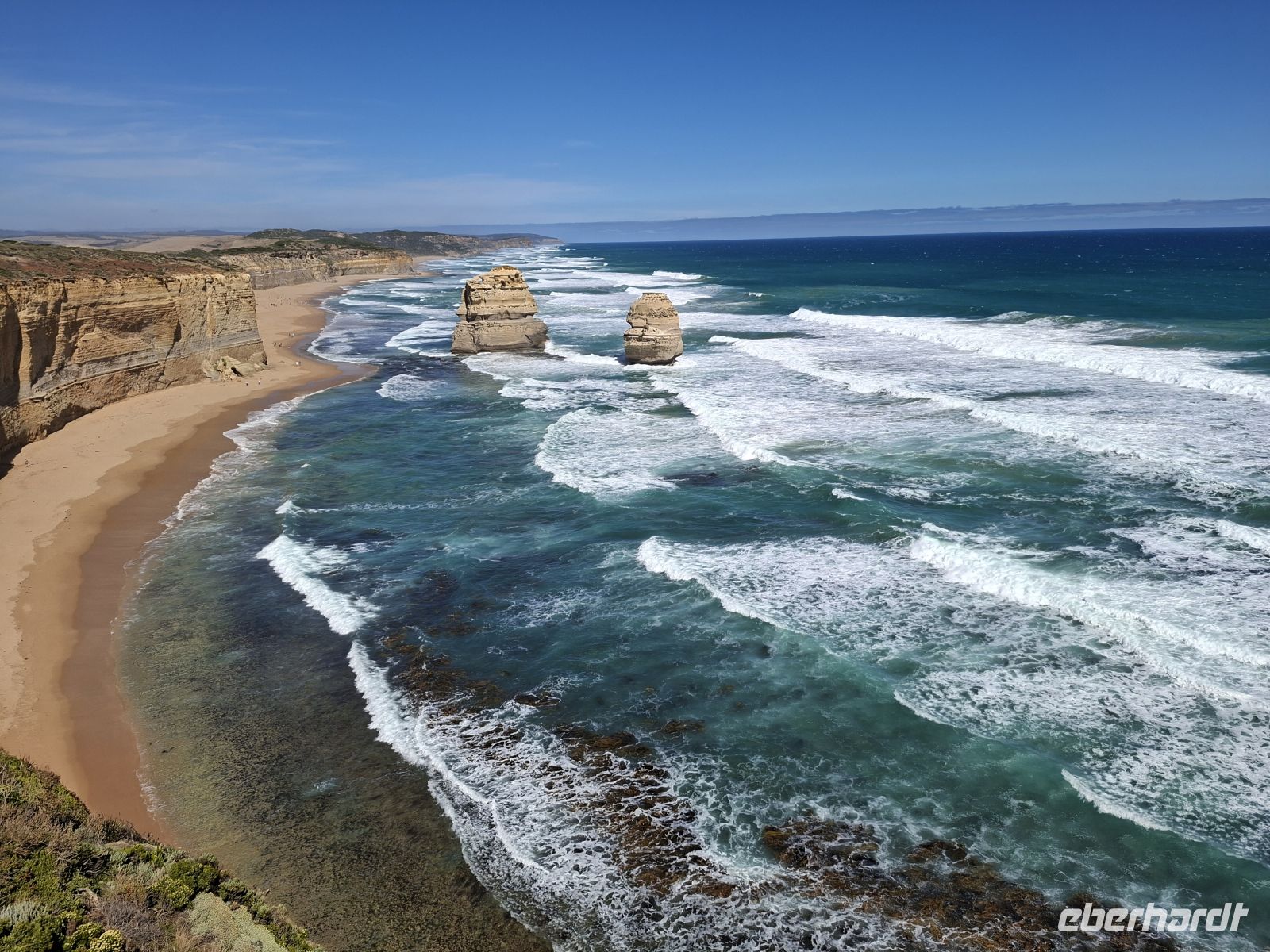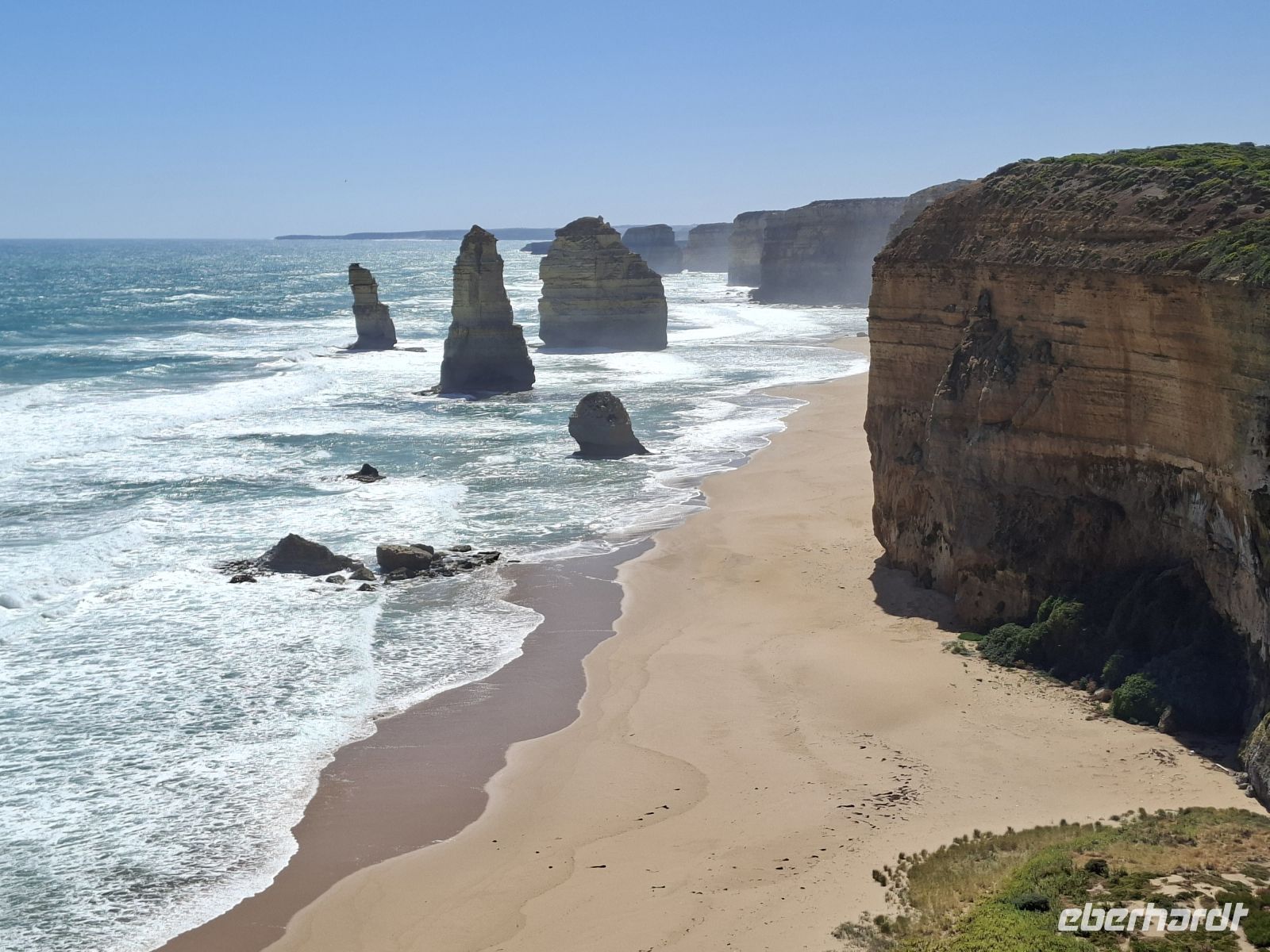 Auf unserer weiteren Reise verlassen wir die Great Ocean Road für eine Weile und fahren bergauf durch das Landesinnere. Hier müssen sich die Wolken abregnen und so finden wir hier den gemäßigten Regenwald. Später wird die hüglige Landschaft offener und wir sehen riesige Farmen für die Rinderzucht. Wieder zurück auf der Great Ocean Road stoppen wir an deren höchsten Punkt (500 m) um eine technische Rast zu machen. Noch ein kleines Stück mit dem Bus, dessen Fahrer uns schließlich am Info-Center der 12 Apostel aussteigen lässt. Diese Sandsteinformationen an der Abbruchkante des Kontinents sind ein Besuchermagnet hier in Victoria und so wird diese Anlage und das Besucherzentrum erneuert und erweitert. Wir starten unseren Rundgang bei sonnigem Wetter und lichten, wie viele andere Touristen, die noch stehenden 8 Sandsteinformationen bestmöglich ab.