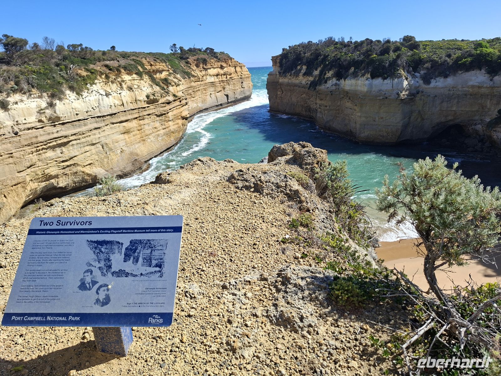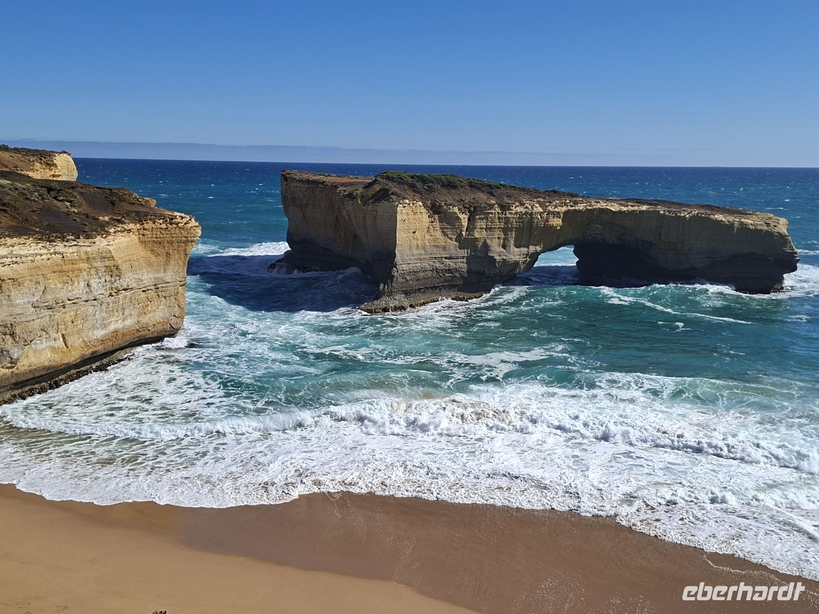 Weiter fahren wir durch den Port Campbell Nationalpark zur nächsten Sehenswürdigkeit, dem „Loch Arge George“. Hier führt uns ein kleiner Rundweg zum Aussichtspunkt, von wo aus wir die beeindruckende Bucht sehen. Weiter geht die Reise in das kleine Fischerdorf „Port Campbell“, wo wir einen letzten Toiletten-Stopp planen. Eine letzte Attraktion ist die Felsformation „London Arch“, ein Sandsteinfels, der bis 1990 durch eine Felsbrücke mit dem Festland verbunden war und damals noch „London Bridge“ hieß. Am 15.01.1990 brach das Verbindungsstück zusammen und verbannte ein Liebespärchen auf den abgeschnittenen Felsen. Mit viel Medien- und TV-Rummel wurden schließlich der verheiratete Mann und seine Angestellte gerettet, was das heimliche Date natürlich verriet.