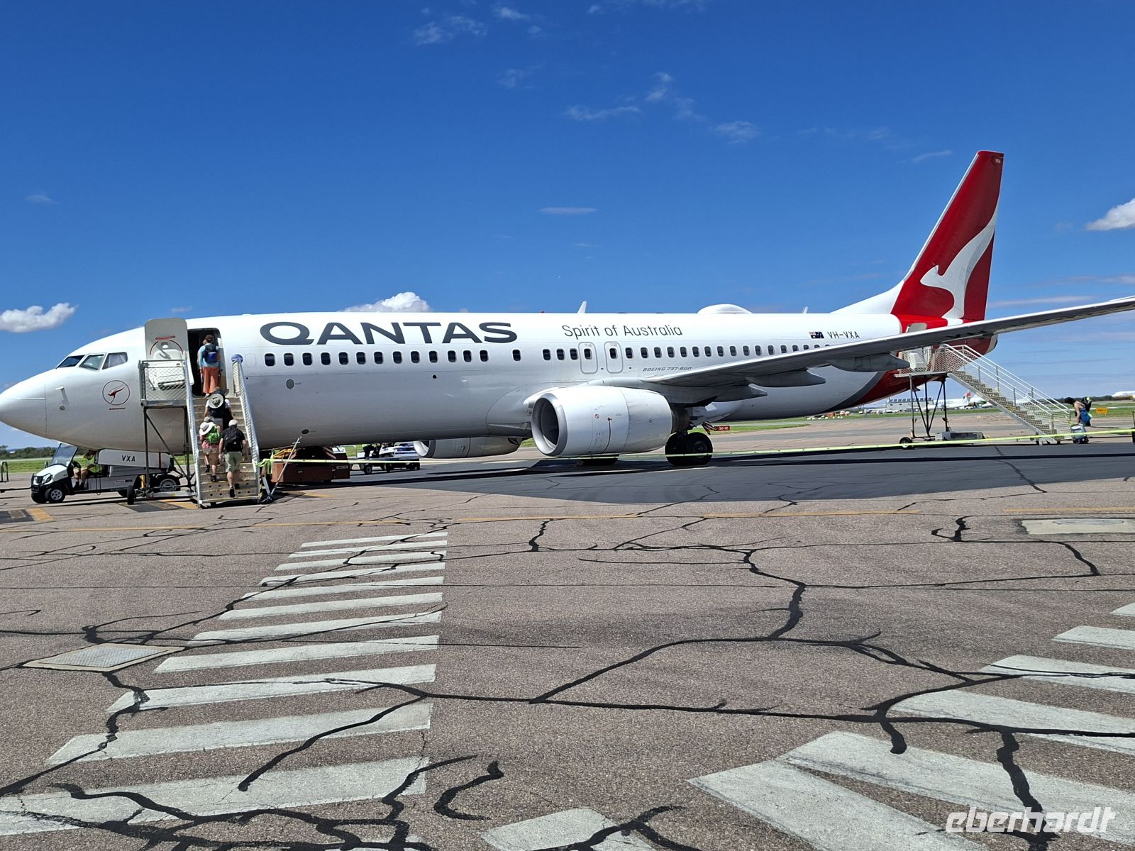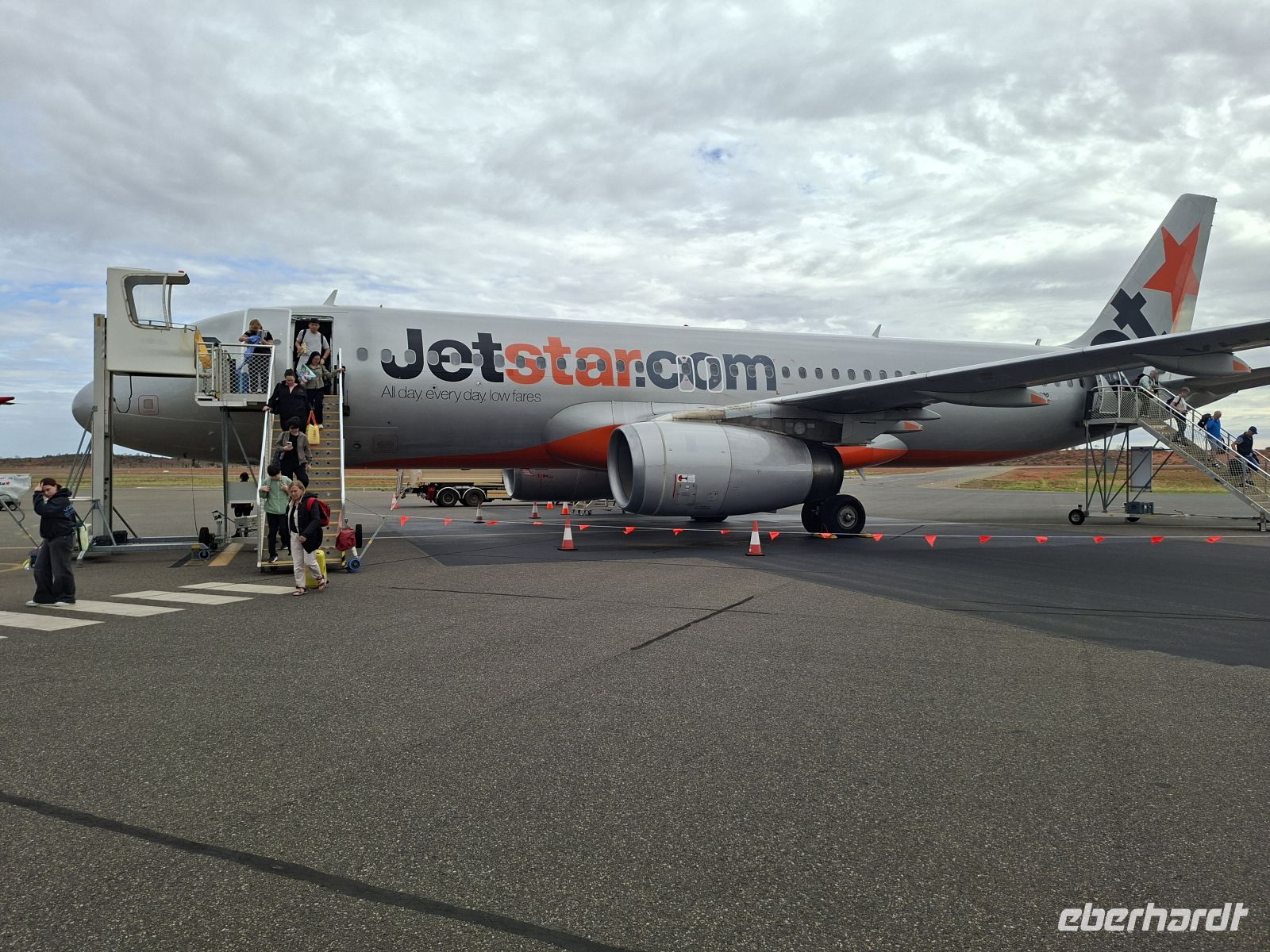 Nach der Ankunft am Terminal 4 checken wir uns und unser Gepäck an Automaten der Airline StarJet ein. Ein weiter Weg führt uns zum Gate 50, wo das Boarding bereits im vollen Gange ist. Wie geplant startet der Flug-Nr.: JQ664 um 07:45 Uhr in Richtung Ayers Rock.