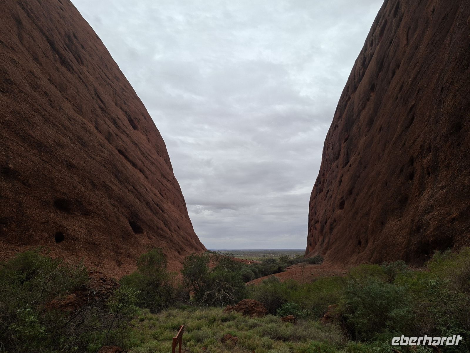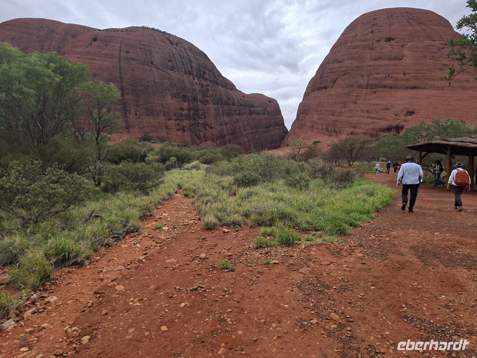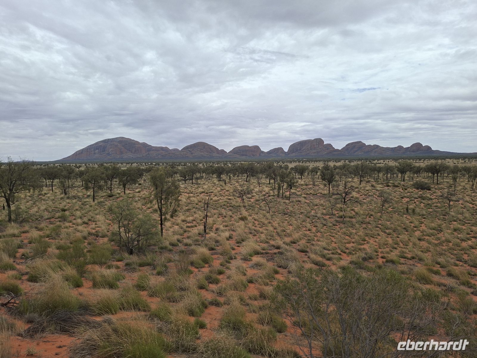 Während der Fahrt erläutert uns Eve in perfektem Deutsch den Ablauf des heutigen Tages, dessen Programm vielversprechend ist. Alle sind wir schon neugierig auf den Sonnenuntergang am Uluru, aber zuerst fahren wir zum anderen bekannten Monolithen, den Kata Tjutas oder früher Olgas genannt. Obwohl beide Felsformationen ca. 40 Kilometer voneinander entfernt sind, soll es wohl eine unterirdische Verbindung geben. Schließlich passieren wir den Eingang zum Uluru – Kata Tjuta Nationalpark und fahren noch ein Stück. Immer näher kommen wir an die Felsformation mit den 45 Köpfen (kugelartige Felsen), deren höchste Erhebung 648 m hoch ist.