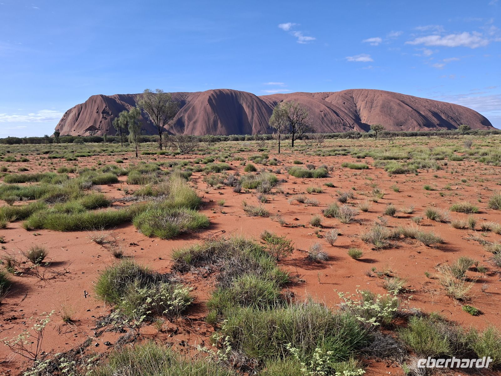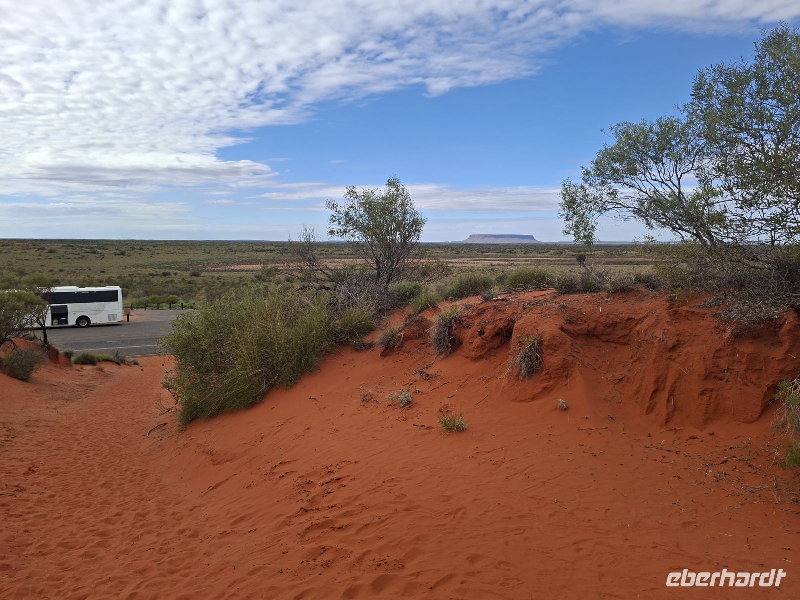 Nach der Landung laufen wir über das Rollfeld zur überschaubaren Empfangshalle, wo wir unsere Reiseleiterin für das Outback, Frau Eve Wilhelm, begrüßen. Eve ist eine pensionierte Lehrerin aus Adelaide, die vor über 30 Jahren aus Deutschland ausgewandert war und nun öfters und gern Gruppen durch das Outback führt. Mit unserem Gepäck gehen wir gemeinsam zum Bus, wo uns der Fahrer für die nächsten Tage erwartet. Sein Name ist Jim und ich helfe ihm gern beim Verladen der Koffer. In Yulara ist es bewölkt, aber dennoch sehr heiß und trocken.