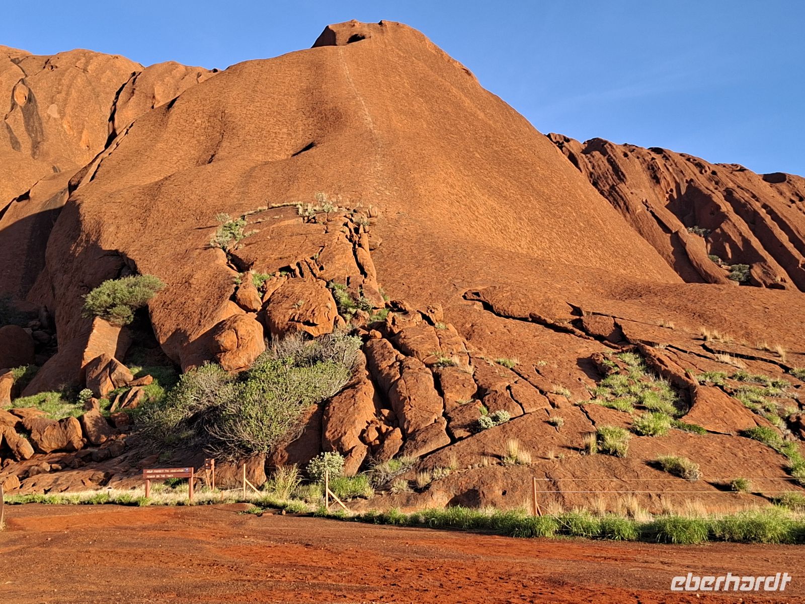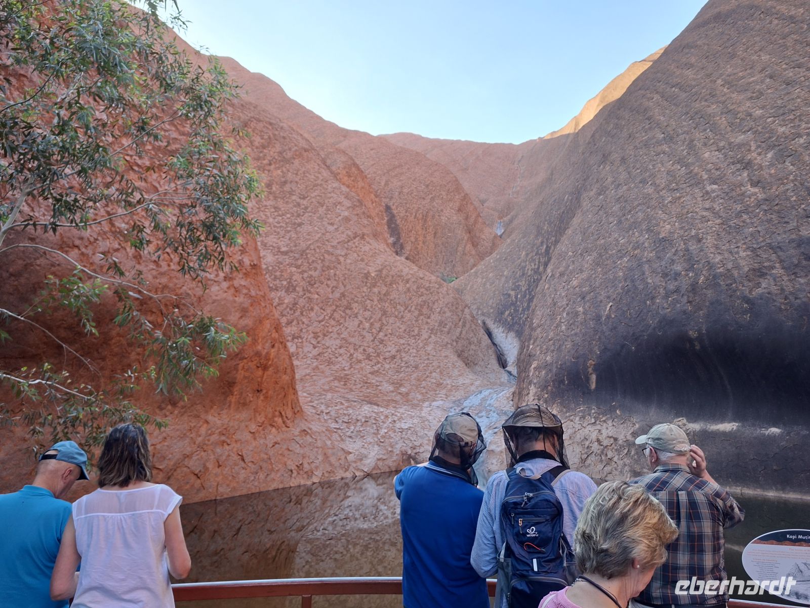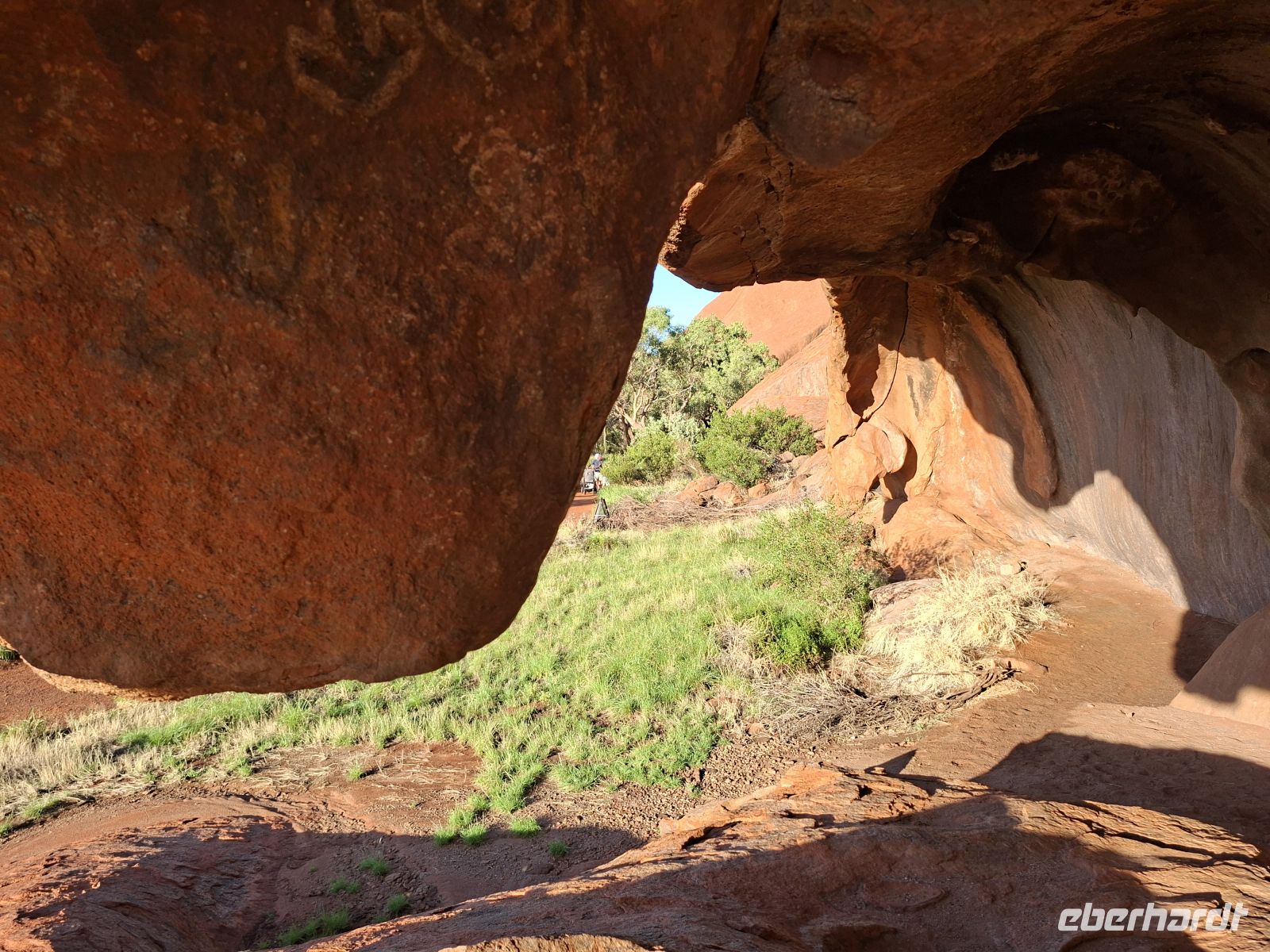 Nach diesem mystischen Ort bringt uns der Bus in die Nähe einer Höhle am Fuß des Uluru, die durch die Anangu-Frauen als Küchenhöhle genutzt wurde. Uralte Felsmalereien zeugen von einer langen rituellen Bedeutung dieses Ortes. Unsere Reiseleiterin erzählt uns, dass viele Anangu sich am Uluru verewigt haben, aber auch Steine, Pflanzen und Samen können von Toten „beseelt“ sein und dürfen deshalb nicht mitgenommen werden. Damit wäre der Übergang dieser Toten in eine andere Welt blockiert. Gleiches können ungewollte Fotos von Aborigines bewirken. Heute wird der Uluru von einem Gremium verwaltet, dass aus 3 Männern und 3 Frauen der Anangu sowie 3 Vertretern der Northern Territory-Verwaltung besteht. So wurde 2019 beschlossen, das Besteigen des Uluru zu verbieten. Bis dahin gab es wohl 60 Todesopfer zu beklagen, die wegen der raschen Dehydrierung oder an Hitzeschlägen starben. Das seitdem die Besucherzahlen am Uluru um ein Drittel zurück gegangen sind, kann aber auch an der Corona-Pandemie und der damit einsetzenden Preisentwicklung liegen.