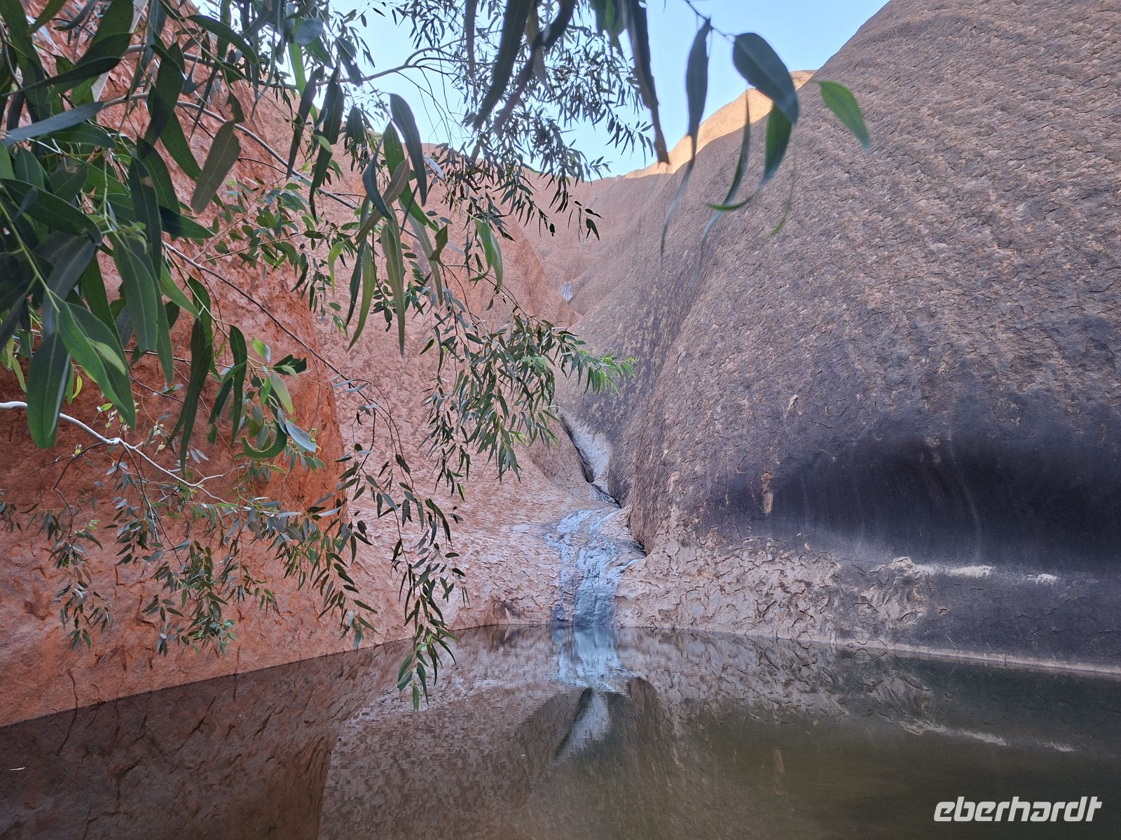 Anschließend fahren wir nur ein kleines Stück, bevor wir wieder aussteigen und zu einer natürlichen Wasserstelle am Fuß des Uluru laufen. Hier erzählt uns Eve ihre Version der heiligen Geschichte der Ahnenwesen, zeigt uns die riesige Mutter Schlange und deren hinterlassenes Nest mit Eiern. Sie schildert mit großer Dramatik, wie ein böses Wesen den Sohn der Schlange verletzt und ohne Hilfe hat sterben lassen. Am Uluru selbst findet man dazu die Spuren des Kampfes und andere Hinweise. Das ist der Spirit dieser heiligen Stätte und das Volk der Anangu erzählt sich diese und andere Geschichten schon über 10.000 Jahre.