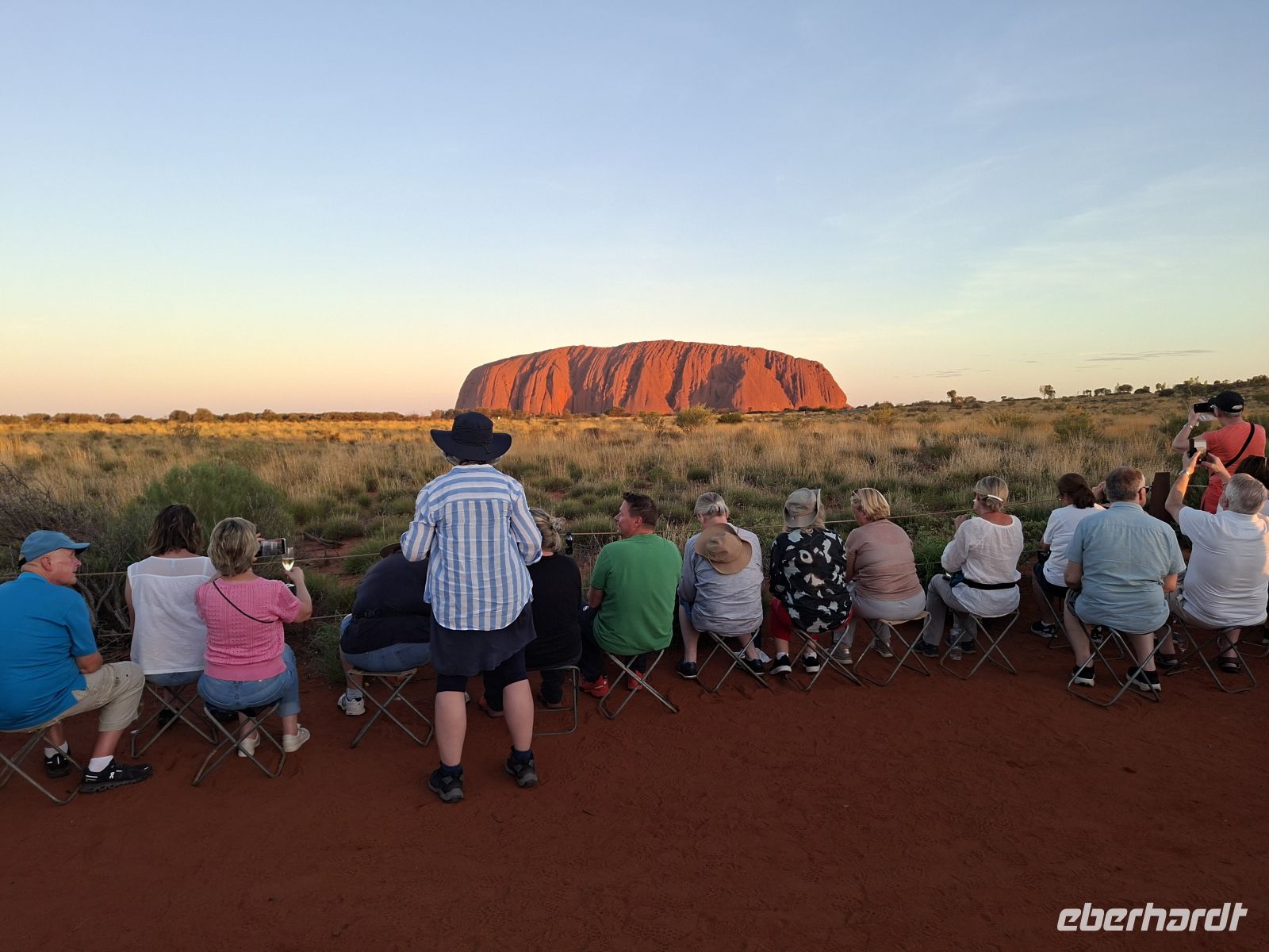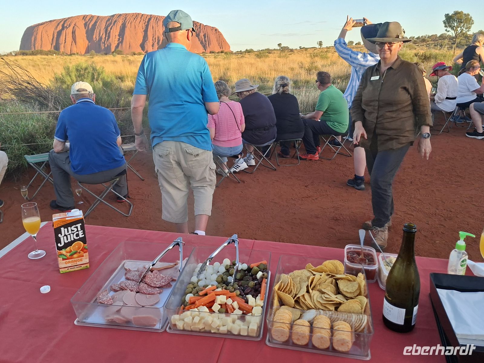 Wir steigen aus und werden zu einem Tisch geführt, auf dem Saft, Sekt und Snacks für unsere Gruppe bereitstehen. Unser Fahrer Jim hat Klappstühle für uns mitgebracht und so genießen wir bei einem Glas Sekt den Farbwechsel am Uluru und stoßen auf eine schöne Reise an. Da es hier nach dem Sonnenuntergang, heute um 19:28 Uhr recht schnell dunkel wird, brechen wir um 19.45 Uhr auf. Der Bus bringt uns zurück zum Ressort. Hier erwartet uns heute ein BBQ der australischen Art. Bei etwas zu lauter Livemusik/Karaoke grillen wir selbst unser Fleisch oder unsere Würste. Zur Auswahl gehören sowohl das traditionelle Rindersteak oder Fischfilet, als auch Würste gefüllt mit Schwein, Emu, und Känguru. Dazu gibt es ein Buffet mit Salaten, Brot und Soßen. Bei sternklarem Himmel begeben wir uns in unsere separat stehenden Unterkünfte.