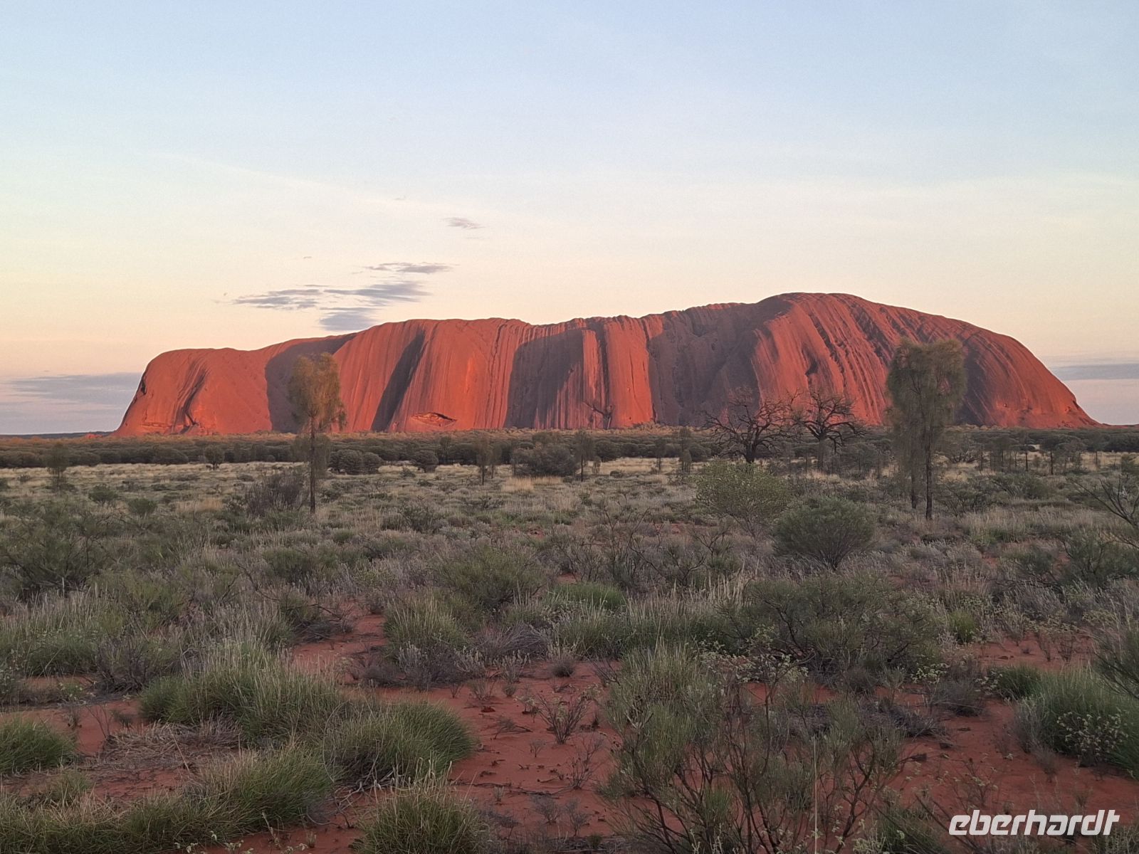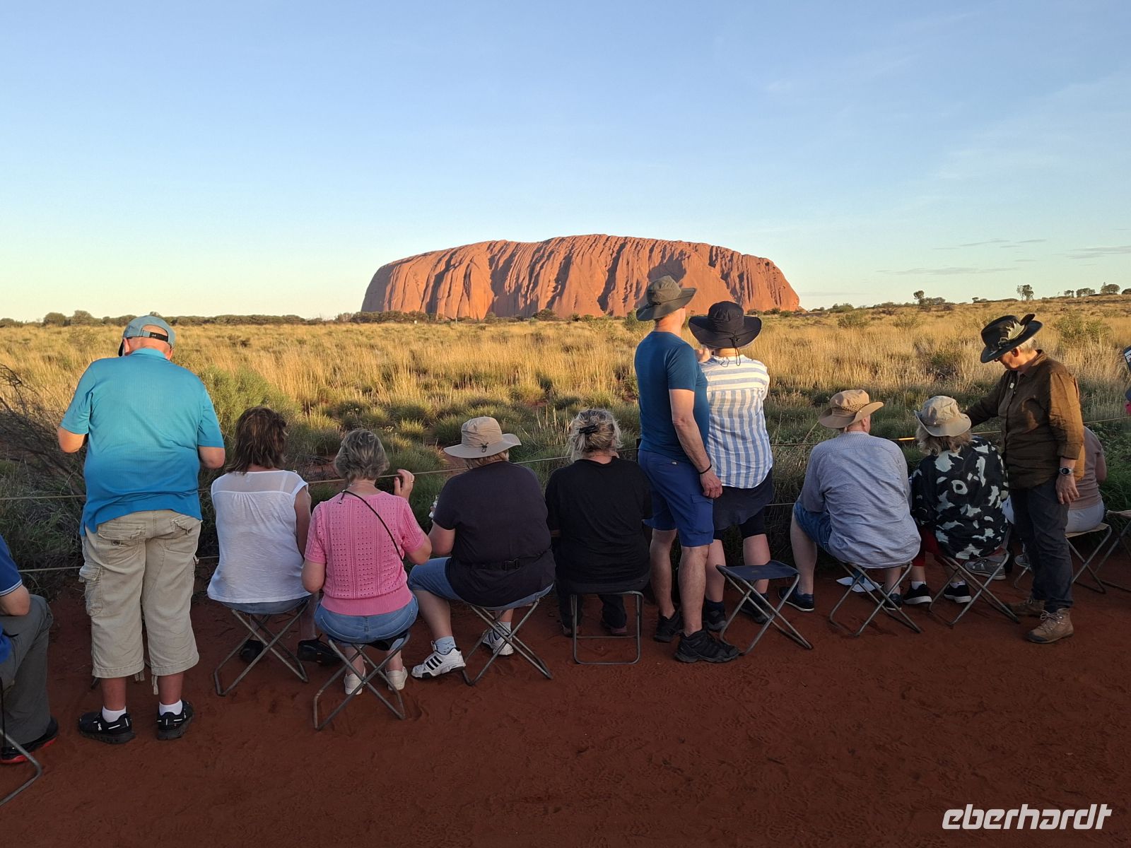 Schon um 05:30 Uhr bringt uns unser Bus zum Parkplatz für den Sonnenaufgang am Uluru, den wir nach einer 30-minütigen Fahrt erreichen. Zügig wird es heller, bis die Sonne schließlich um 06:32 Uhr aufgeht und den 368 m hohen Uluru in immer andere Farben taucht. Nach diesem Spektakel fahren wir zurück zum Hotel, wo wir unser Frühstück einnehmen.