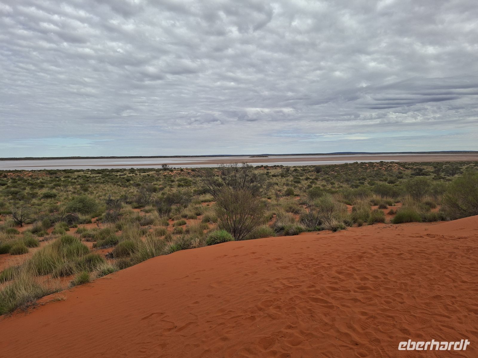 Auf der Fahrt durch das Outback erläutert uns unsere Reiseleiterin, dass hier in den Northern Territories die Bevölkerungsdichte nur 80 Einwohner pro km² beträgt. Wir reisen durch eine endlose Halbwüste mit verschiedenen Akazien und Wüsteneichen, die ein stahlhartes Holz haben. Wir passieren die Farm „Curtains Springs“, mit einer Größe von 5.000 km². Es ist die einzige Farm, die der Familie schon immer gehört. Sonst kann man nur für die Dauer von 99 Jahren pachten. Freilaufende Rinder am Straßenrand gehören zu dieser Farm. Ihre 6.000 Rinder entfernen sich niemals weiter als 20 km von ihrer Wasserstelle. Sie werden nur einmal jährlich gezählt und sind sonst frei oder werden lebend exportiert. Rechts erblicken wir in der Ferne den riesigen 500 Mill. Jahre alten Tafelberg „Mount Conner“, der ebenfalls Privatbesitz der Familie ist. Nach einer reichlichen Stunde Fahrt stoppen wir an einer Toilettenmöglichkeit und erklimmen mit wenigen Schritten eine Düne. Oben angekommen, haben wir einen Blick auf einen Salzsee.