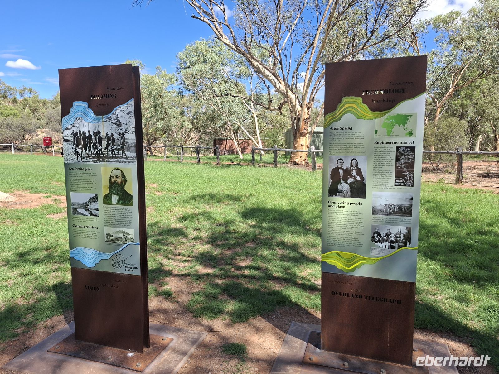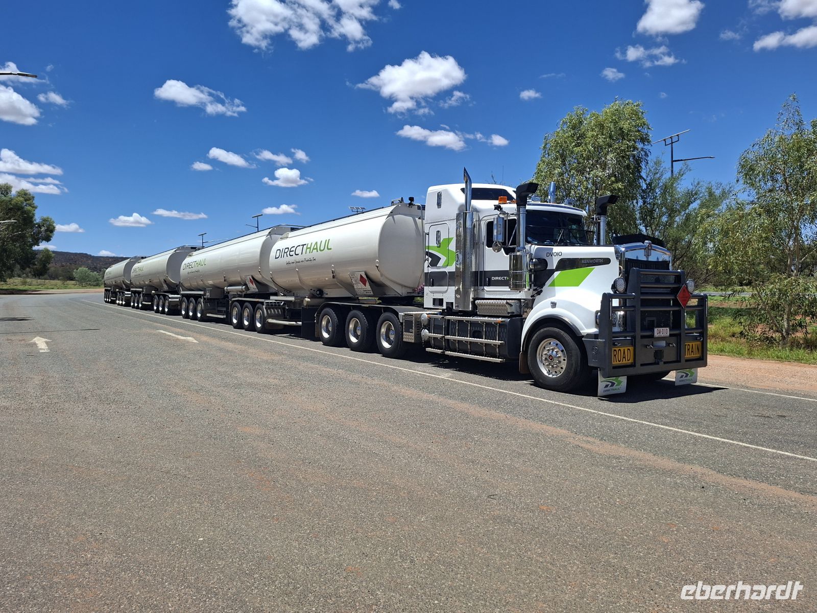 Um 11 Uhr rasten wir kurz im Roadhouse „Erldunda“ und fahren anschließend weiter auf dem Suart-Highway nach Norden. Dieser Highway ist die durchgängig asphaltierte Straße, die Darwin im Norden mit Adelaide im Süden des Kontinentes verbindet und hat eine Länge von 2.800 km. Dem Namensgeber, John McDouall Stuart, gelang 1862 erstmalig die Durchquerung des Kontinents von Süd nach Nord. Im Roadhaus „Stuarts Well“ machen mir unsere Mittagspause. Es gibt gute Burger und hausgemachte Kuchen. Insgesamt versetzt uns das antike Interior in die 1950er Jahre zurück. Auch ein australischer Road-Train-Fahrer legt hier eine Pause ein und so bietet sein Lastzug, bestehend aus einer verchromten Zugmaschine und 4 Edelstahl-Kesselwagen, ein tolles Fotomotiv mit einer Gesamtlänge von 54 m!