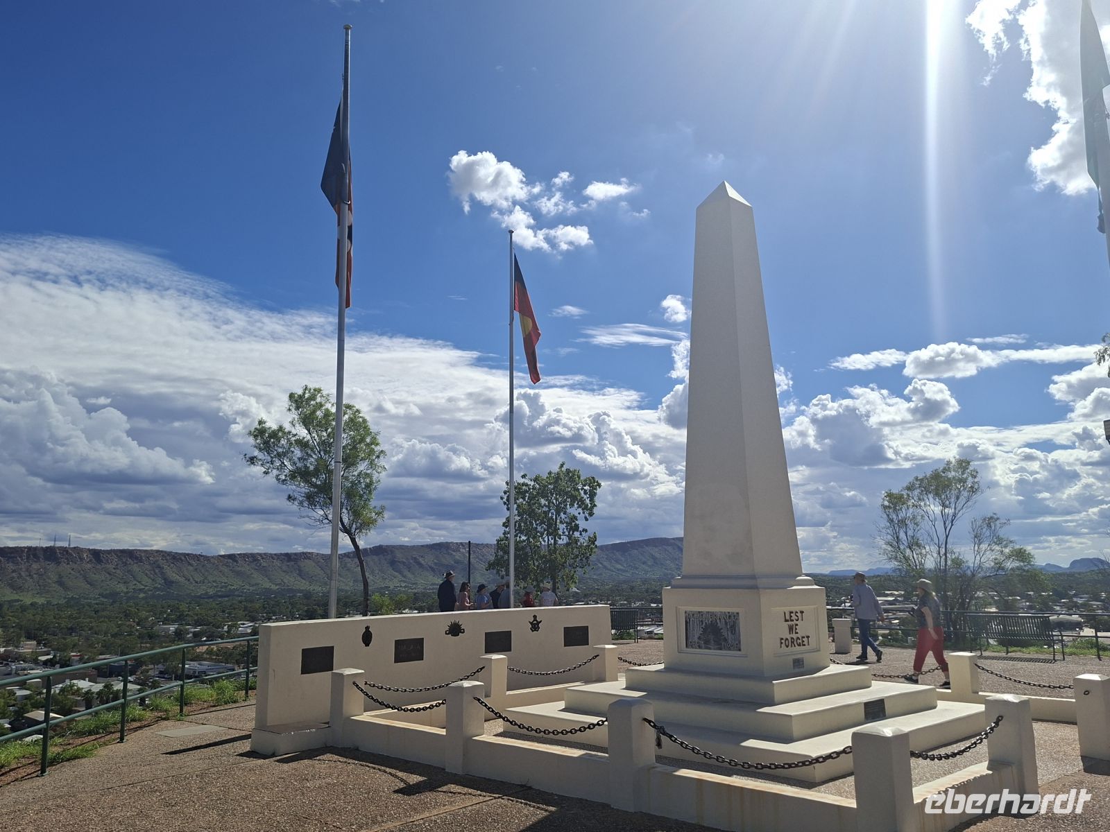 Nach einer Stunde Fahrt auf dem Stuart-Highway erreichen wir Alice Springs. Hier hat es in den letzten Tagen stark geregnet und so erleben wir die Halbwüste links und rechts der Straße in saftigem Grün. Auch der Finke- und der Todt-River führen seit 5 Jahren mal wieder viel Oberflächenwasser. In Alice Springs steuern wir die Station der Royal Flying Doctors an. Nach der Begrüßung schauen wir uns einen Film in deutscher Sprache an, der uns die Anfänge und die heutige Arbeit der fliegenden Ärzte näherbringt. Anschließend streifen wir durch die Ausstellung und den Shop. Weiter fahren wir zur alten Telegraphenstation. Wegen eines Unwetters vor 2 Tagen sind jedoch alle Gebäude und auch der Kiosk geschlossen. Wir unternehmen einen Rundgang und Eve erläutert uns alles über die Geschichte Telegraphenstation und die spätere Funktion dieser Einrichtung als Internat und Umerziehungsstätte für Kinder der Aborigines, der sogenannten „Lost Generation“. Nun bringt uns der Bus zum Anzac Hill, der als Gedenkstätte für die Gefallenen der beiden Weltkriege dient. Von hier oben haben wir einen guten Rundblick auf die Stadt Alice, wie die ca. 26.000 Einwohner Ihre Stadt nennen. Wir sehen auch einen Teil der 600 km langen Gebirgskette „Macdonnel Ranges“, die Alice Springs nahezu einschließt. Die Sonne brennt und die Luft ist trocken. Nach kurzer Weiterfahrt erreichen wir um 16 Uhr unser Hotel für eine Nacht, das „Crown Plaza“. Nach dem Zimmerbezug treffen wir uns wieder im Hotelpool oder an der Bar. Vor dem fakultativen Abendessen verabreden wir uns auf der Hotelanlage und stoßen gemeinsam mit einem Glas australischem Weißwein auf die Gesundheit und unsere Reise an.