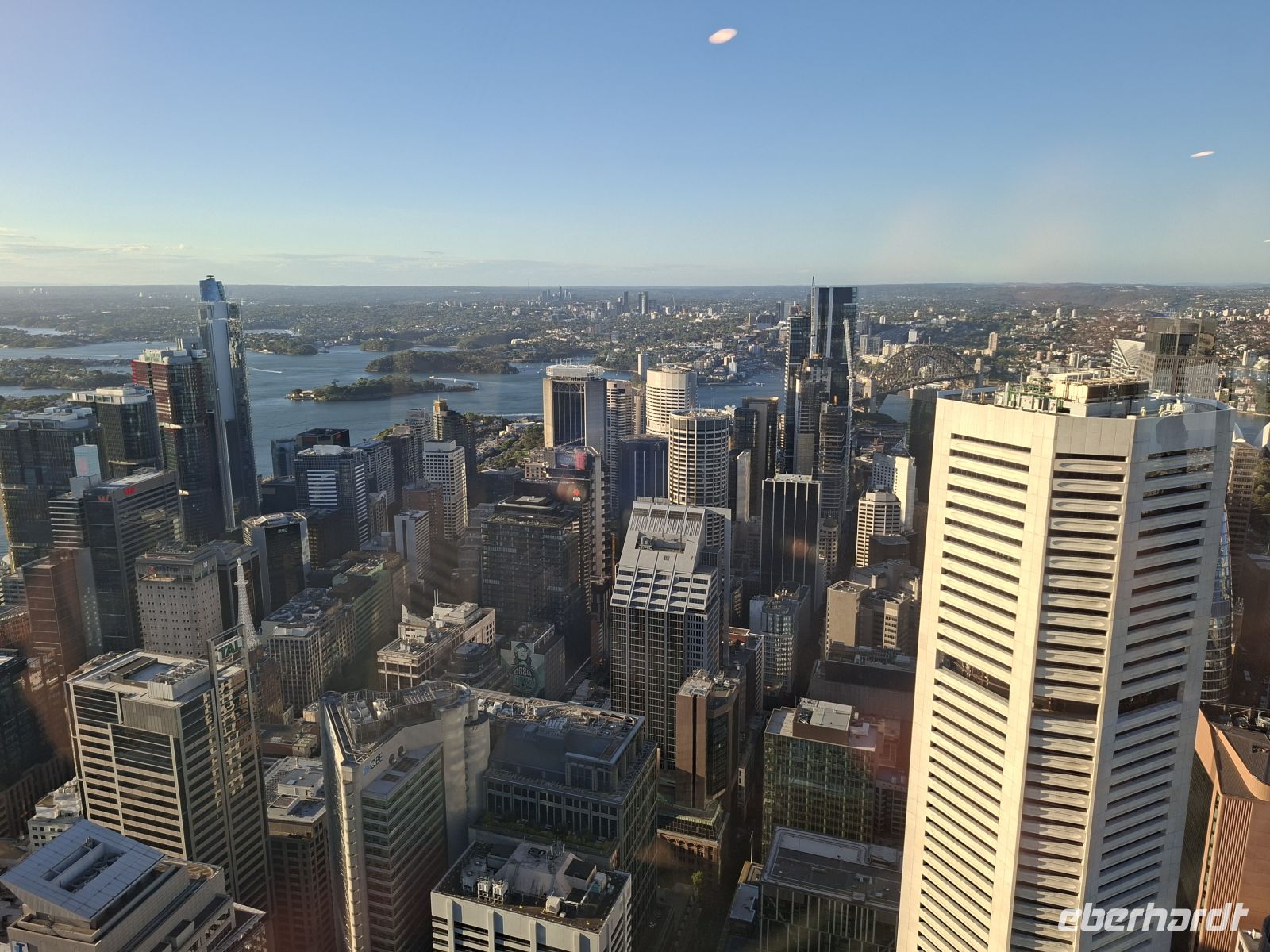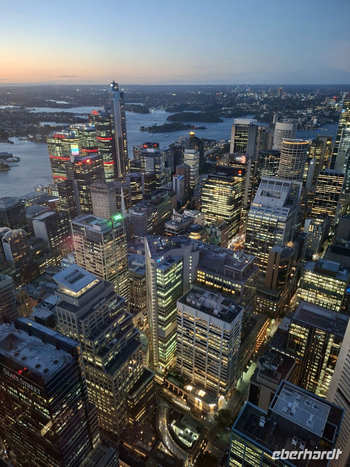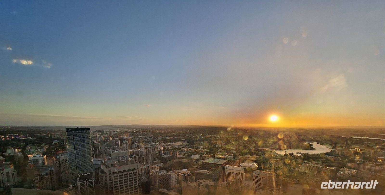 Wieder erwartet uns unsere örtliche Reiseleiterin, Frau Margott Cuthill, am Kofferband. Nach einer kurzen Begrüßung bringt sie uns zum Transferbus, der uns in 30 Minuten zum Hotel in der Innenstadt Sydneys bringt. Wir checken für 3 Nächte im Novotel Sydney Wynyard ein und haben den Rest des Tages frei. Mit einigen Gästen treffe ich mich um 18 Uhr. Wir möchten den Sonnenuntergang auf dem Sky Tower Sydney erleben und laufen dazu durch das belebte Einkaufsviertel Sydneys. Schließlich fahren wir mit dem Lift zur Aussichtsplattform in 250 m Höhe. Mit 309 m ist der Sky Tower das höchste freistehende Gebäude der Stadt. Wir haben einen fantastischen Rundblick auf die Hafenstadt und genießen den herrlichen Sonnenuntergang (19:45 Uhr). Anschließend kehren wir in ein Japanisches Straßenrestaurant in der Nähe unseres Hotels ein. Dort genießen wir die preiswerte und sehr schmackhafte japanische Küche und haben viel Spaß mit der Eigentümerin, die vor Jahren aus Hongkong einwanderte und einen Japaner zum Mann hat.