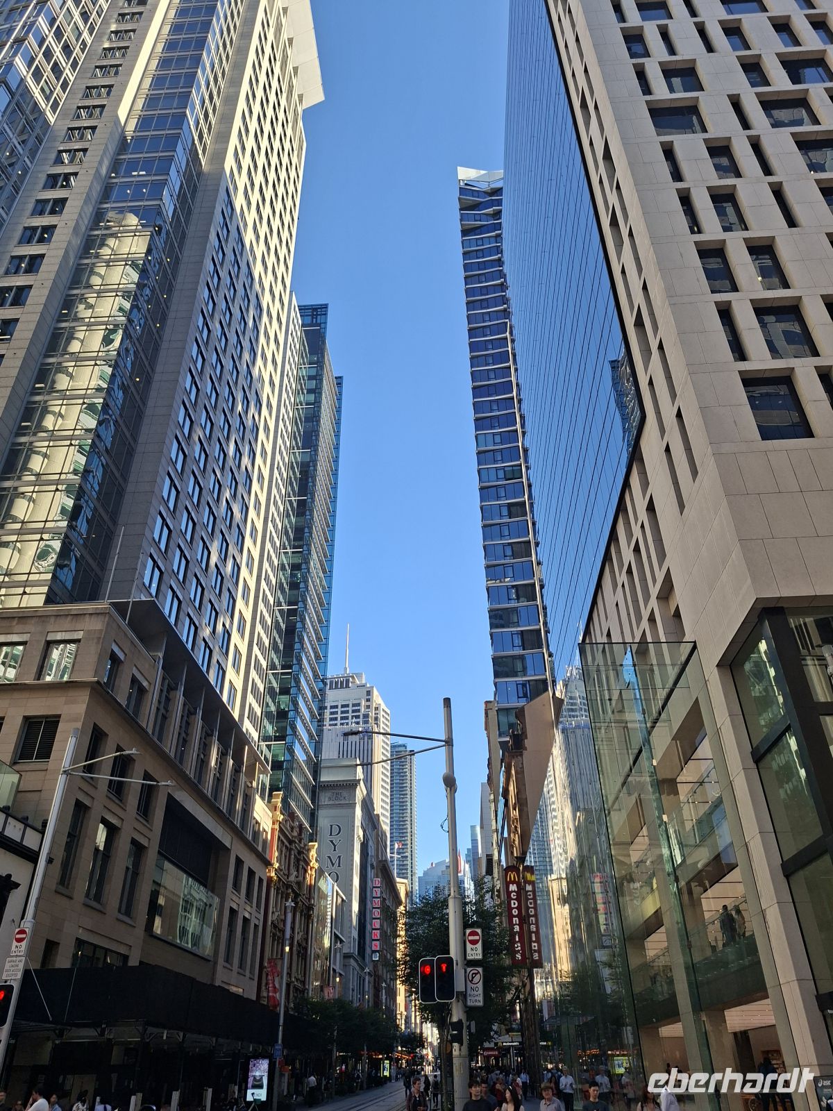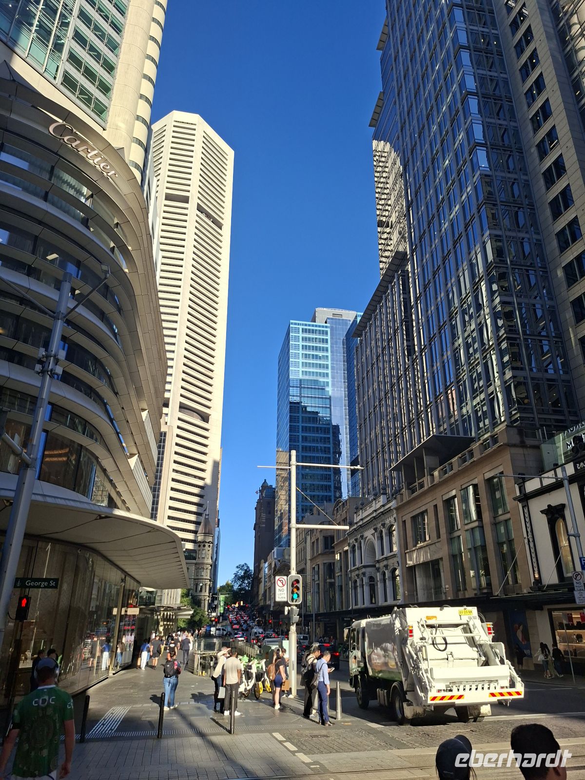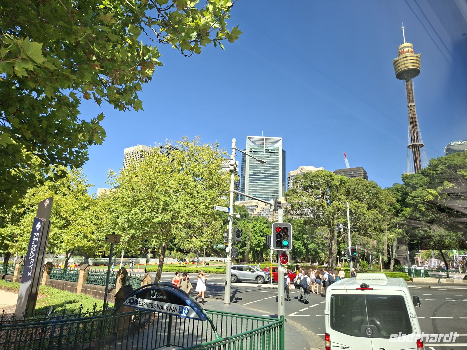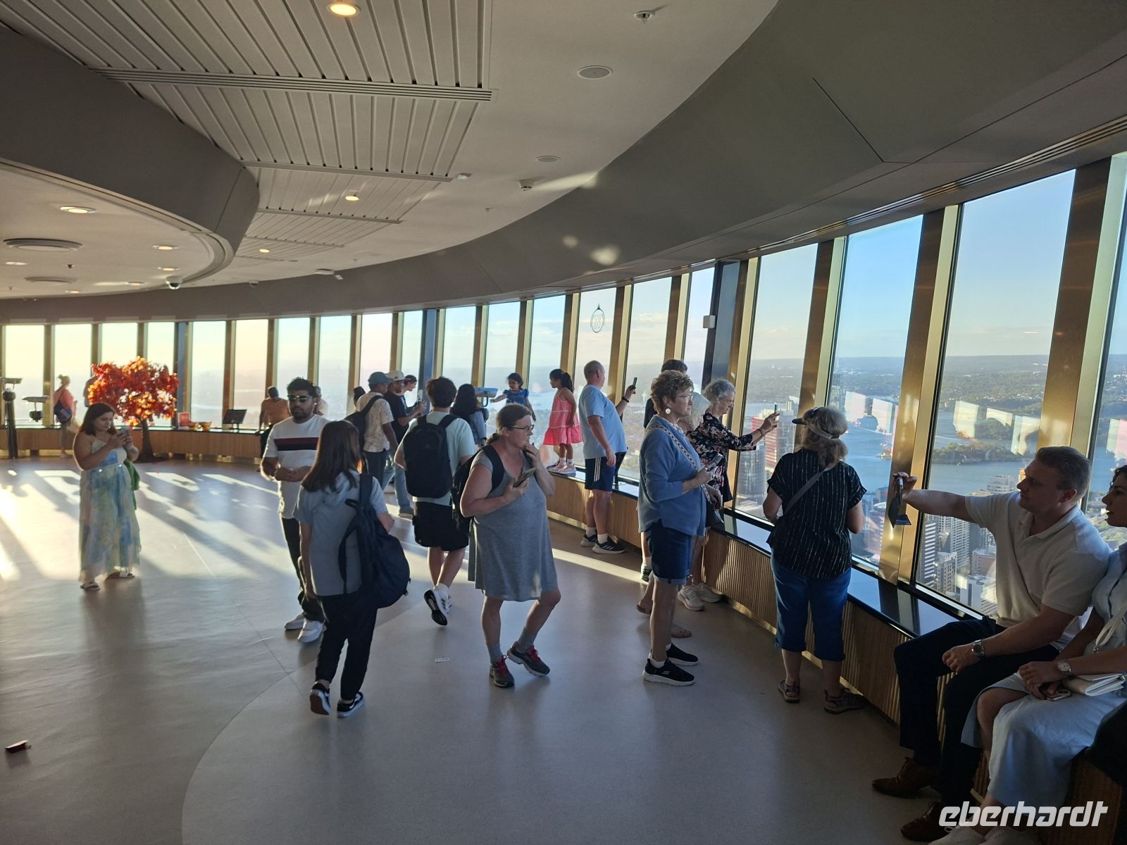 Wieder erwartet uns unsere örtliche Reiseleiterin, Frau Margott Cuthill, am Kofferband. Nach einer kurzen Begrüßung bringt sie uns zum Transferbus, der uns in 30 Minuten zum Hotel in der Innenstadt Sydneys bringt. Wir checken für 3 Nächte im Novotel Sydney Wynyard ein und haben den Rest des Tages frei. Mit einigen Gästen treffe ich mich um 18 Uhr. Wir möchten den Sonnenuntergang auf dem Sky Tower Sydney erleben und laufen dazu durch das belebte Einkaufsviertel Sydneys. Schließlich fahren wir mit dem Lift zur Aussichtsplattform in 250 m Höhe. Mit 309 m ist der Sky Tower das höchste freistehende Gebäude der Stadt. Wir haben einen fantastischen Rundblick auf die Hafenstadt und genießen den herrlichen Sonnenuntergang (19:45 Uhr). Anschließend kehren wir in ein Japanisches Straßenrestaurant in der Nähe unseres Hotels ein. Dort genießen wir die preiswerte und sehr schmackhafte japanische Küche und haben viel Spaß mit der Eigentümerin, die vor Jahren aus Hongkong einwanderte und einen Japaner zum Mann hat.
