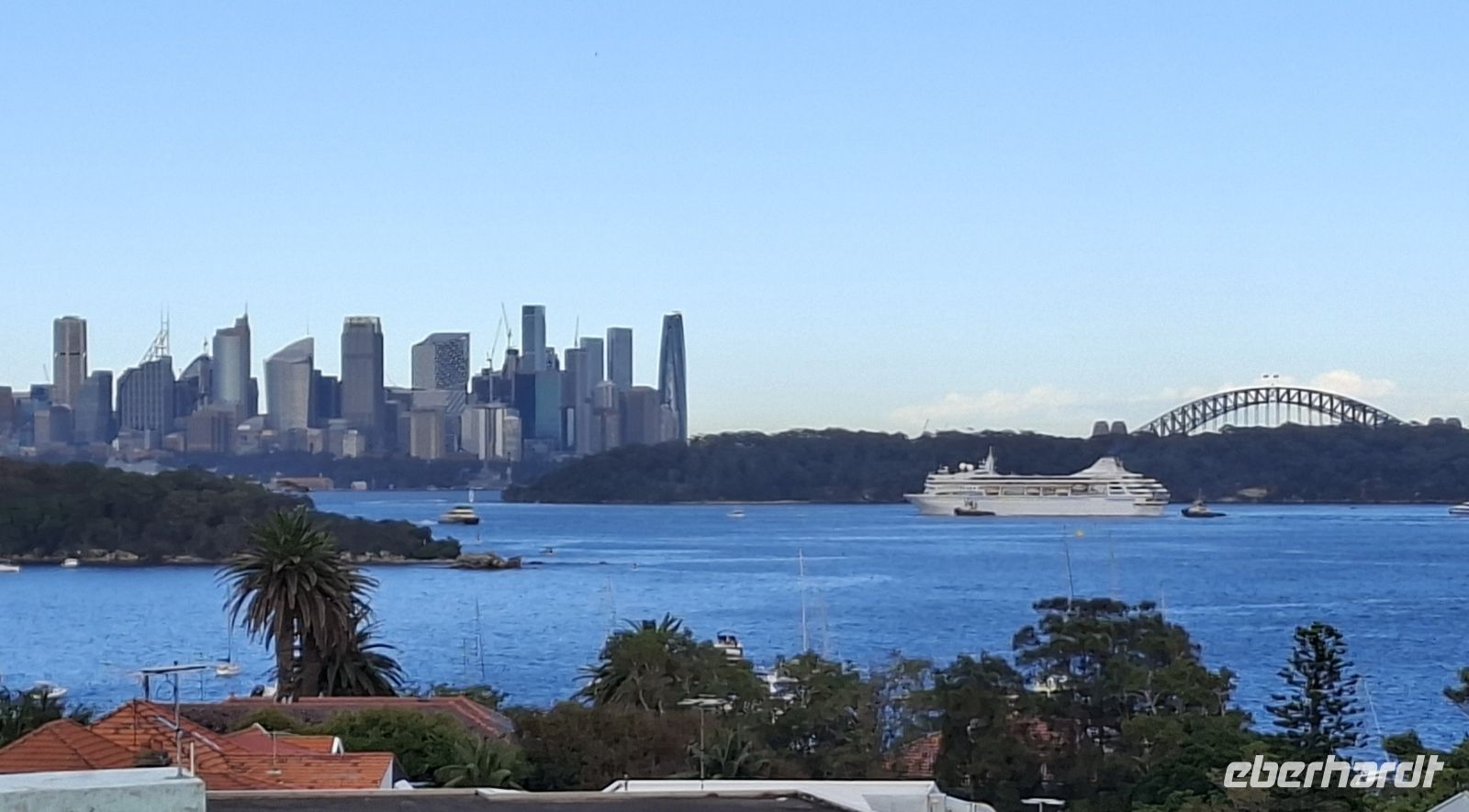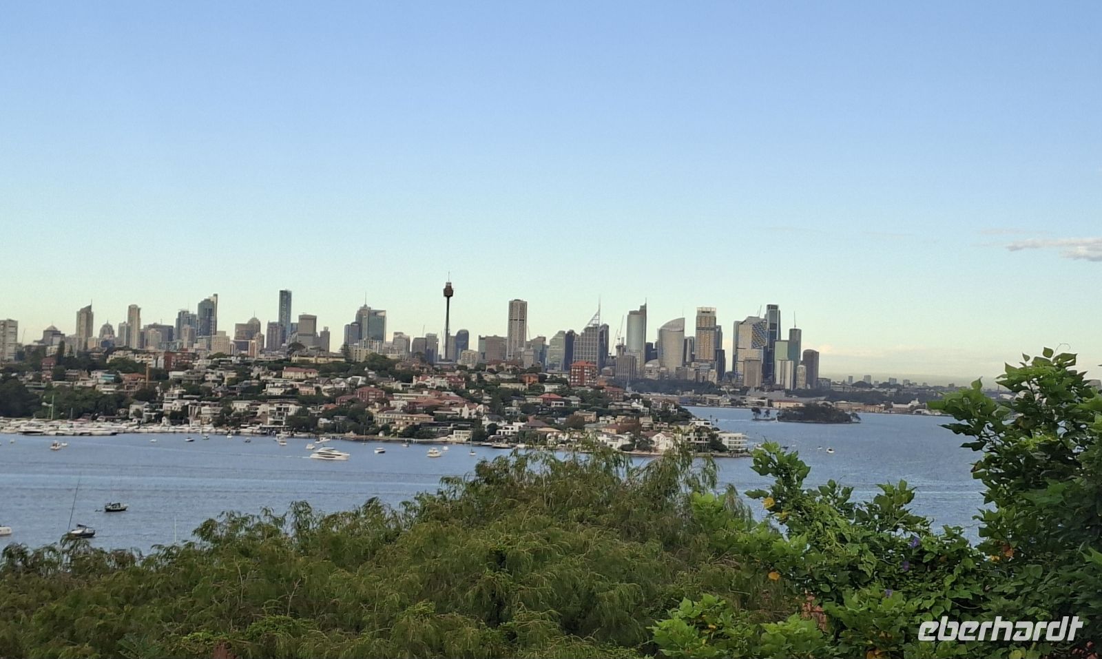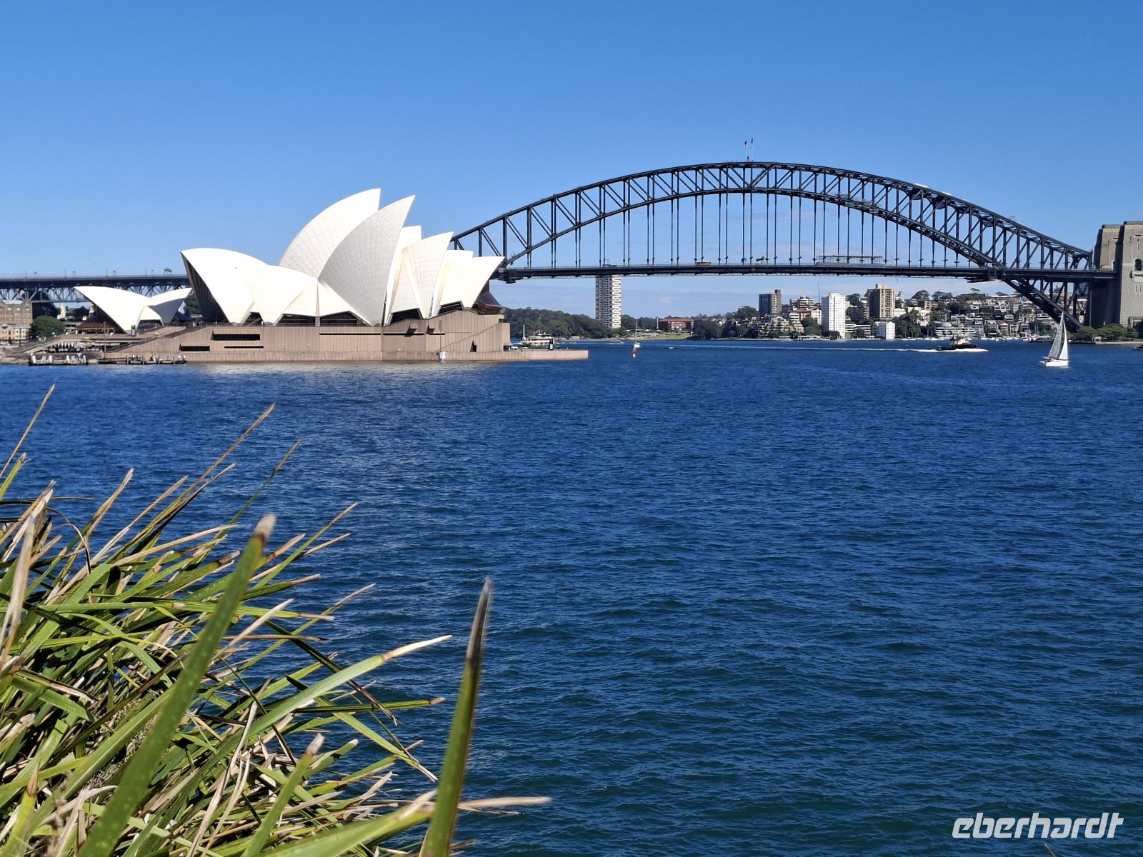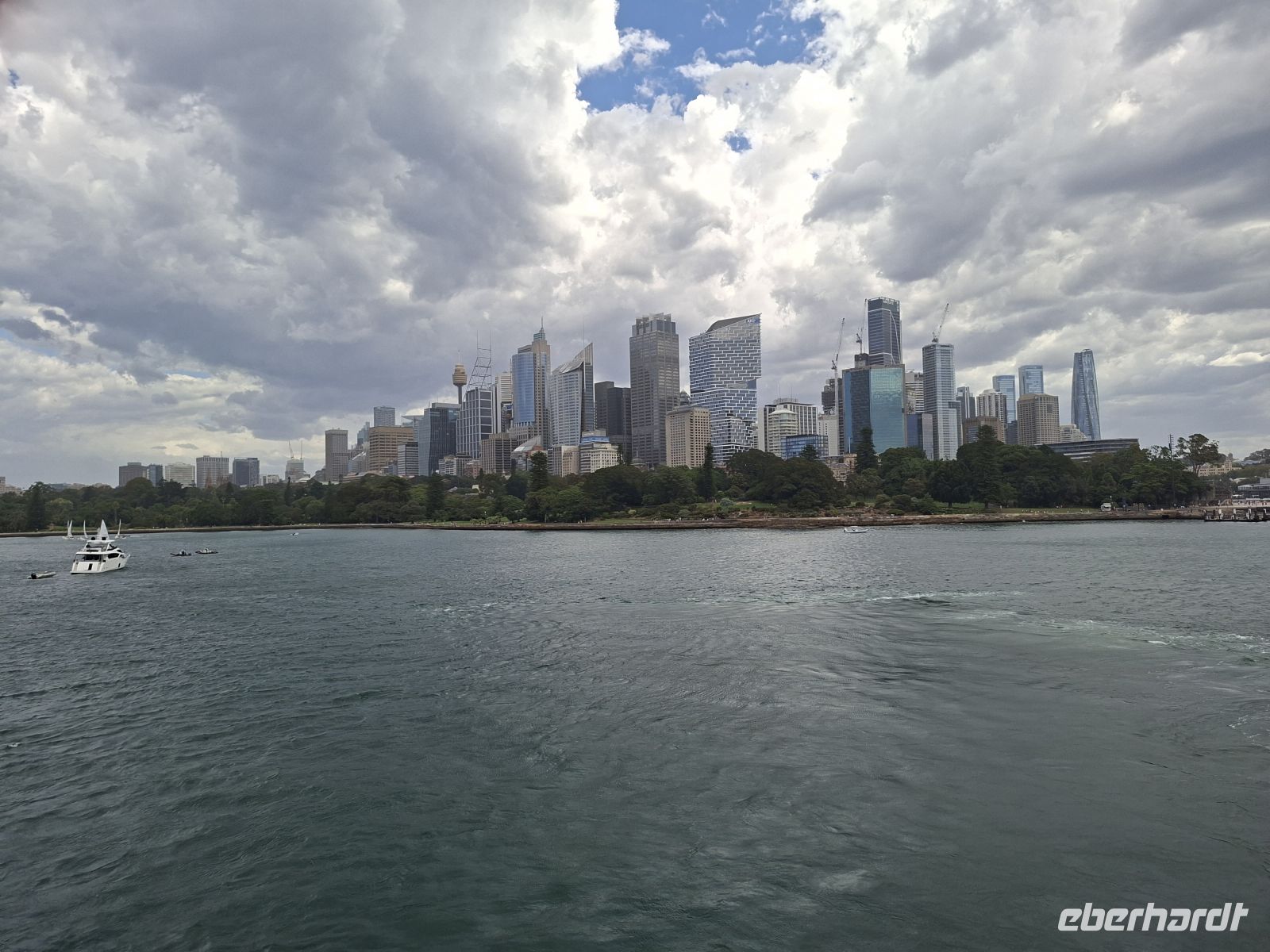 Das große moderne Schiff der „Captain Cook Cruises“ legt pünktlich zur Hafenrundfahrt ab und bietet über eine App Informationen zu den Sehenswürdigkeiten in Deutsch an. Wir sind auf dem Oberdeck und lassen uns den Fahrtwind um die Ohren wehen. Immer wieder bieten sich tolle Fotomotive von der Harbour Bridge, dem Opernhaus und der Skyline von Sydney.