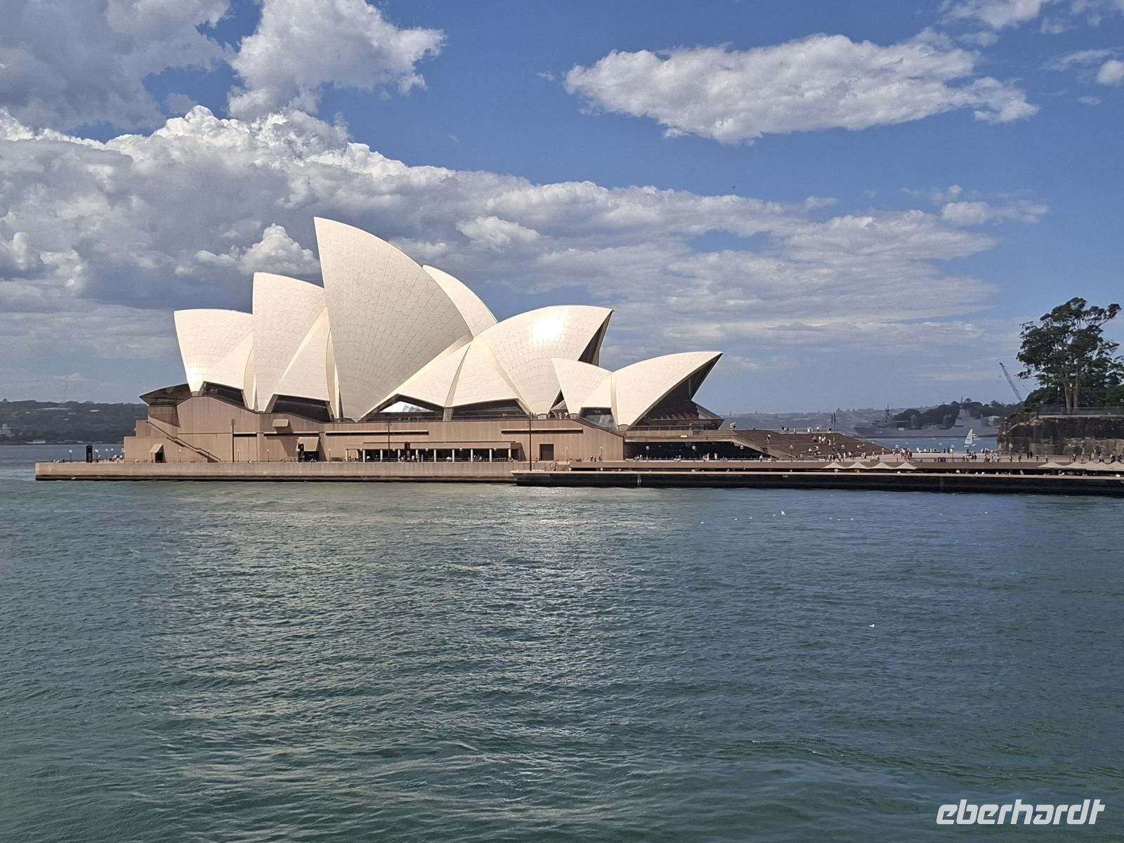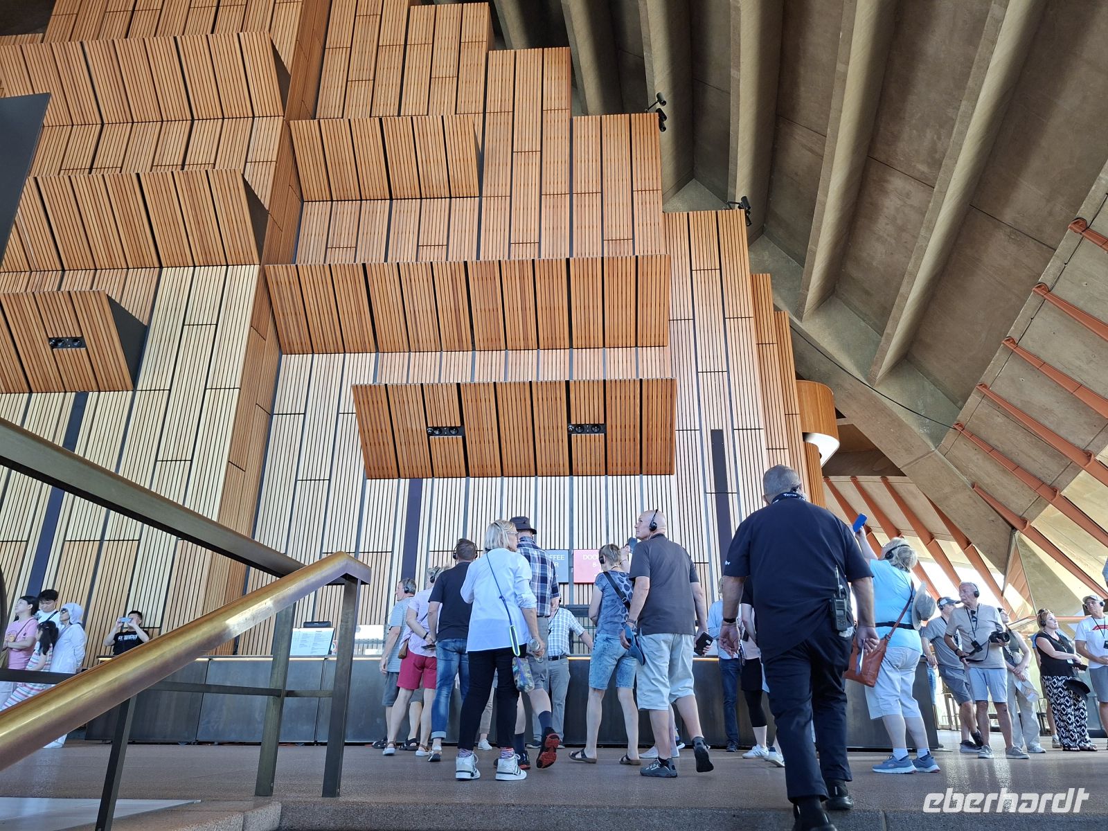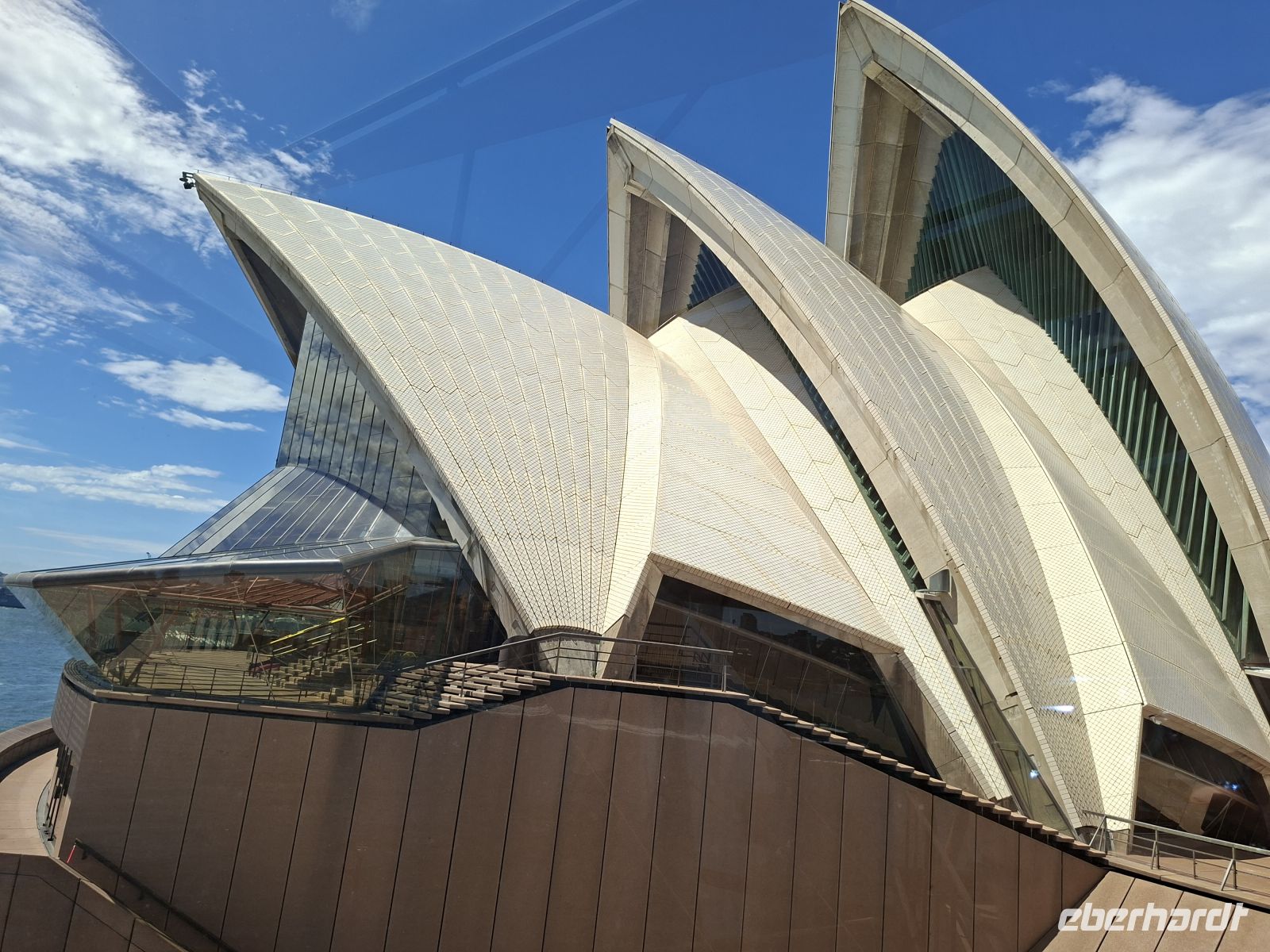 Nun bringt uns der Bus ins touristische Zentrum Sydneys. Unweit des Opernhauses verlassen wir den Bus und erreichen nach einem kurzen Fußmarsch den Platz vor dem spektakulären Bau. Uns bleibt noch etwas Freizeit für ein Lunch oder einen Kaffee, bevor wir uns in der Oper zur Führung durch das Haus treffen. Die Ausführungen unseres Guides Steve übersetzt unsere Reiseleiterin Margot über unsere Headsets ins Deutsche. Wieder sehen wir einen Film in deutscher Sprache, in dem die Errichtung des Opernhauses und die traurige Geschichte des jungen dänischen Architekten Jörn Utzon erzählt wird. Er soll seine Idee für die Gestaltung beim Schälen einer Orange gehabt haben und hat damit 1957 die weltweite Ausschreibung gewonnen. Probleme bei der Umsetzung und ein Regierungswechsel im Bundesstaat New South Wales zwangen den Architekten im Jahr 1966, seine Baustelle und Australien zu verlassen. Er starb im Jahr 2008 in Dänemark, ohne jemals das fertig gestellte Opernhaus selbst zu sehen.