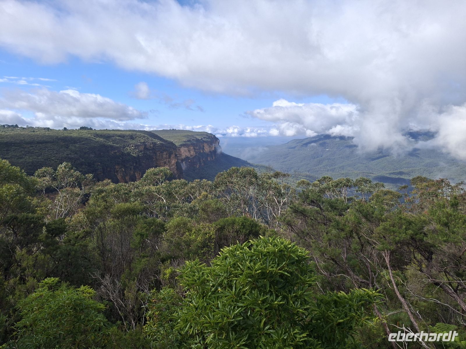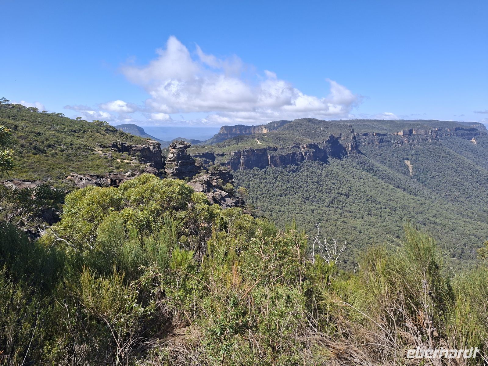 Auch hier haben wir etwas Zeit für Fotos des tollen Panoramas. Schließlich fahren wir noch ein Stück des Blue Mountain Drives, bis wir unser erstes Ziel des heutigen Tages erreichen. Der Lookout „Echopoint“ begrüßt uns mit Sonnenschein! Von hier haben wir nun beste Sicht auf die drei Schwestern, eine Felsformation mit 3 nebeneinanderstehenden Felsnadeln. Die Legende besagt, dass ein Medizinmann die drei Schwestern seines Stammes in Stein verwandelt hatte, um die Liebe der drei zu drei Söhnen des benachbarten Stammes zu verhindern, weil es gegen die Stammesgesetze war. Sein eigener Tod verhinderte die Zurückverwandlung der 3 Schwestern. Bei kleinen Spaziergängen genießen wir die Sonne und die tolle Aussicht über die endlosen Eukalyptus-Wälder.