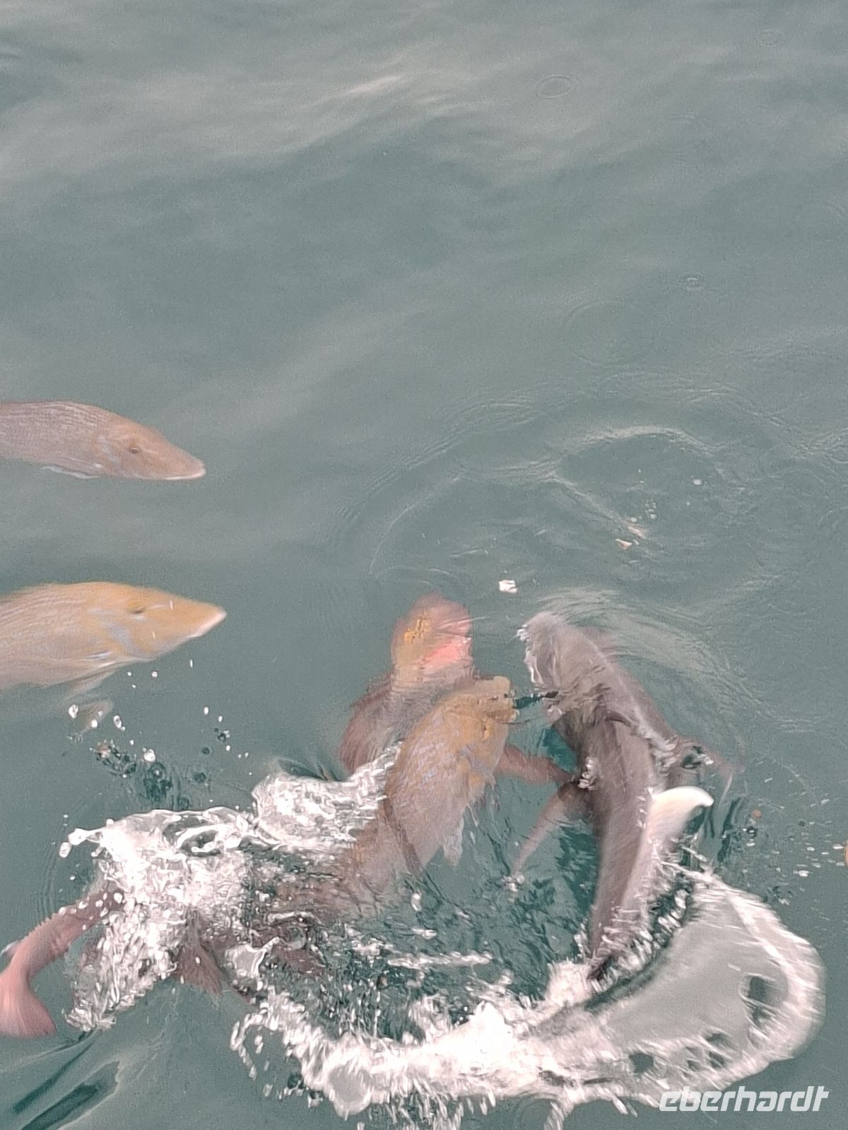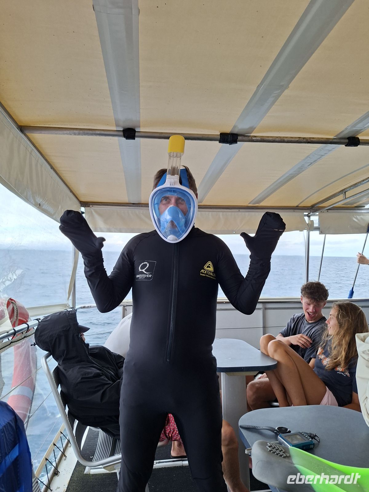 10:00 Uhr begrüßt uns Alex in deutscher Sprache. Er ist Deutscher und hier auf dem Boot als Küchenhilfe angestellt. Er macht mit uns die Sicherheitsunterweisung. Wichtig sind nach seinen Worten, dass jeder einen Neoprenanzug trägt und sich damit vor gefährlichen Quallen schützt.