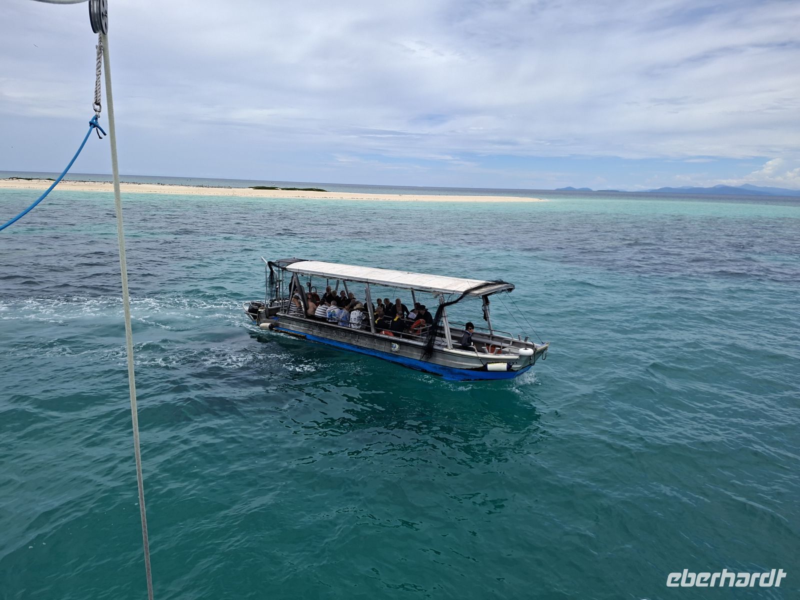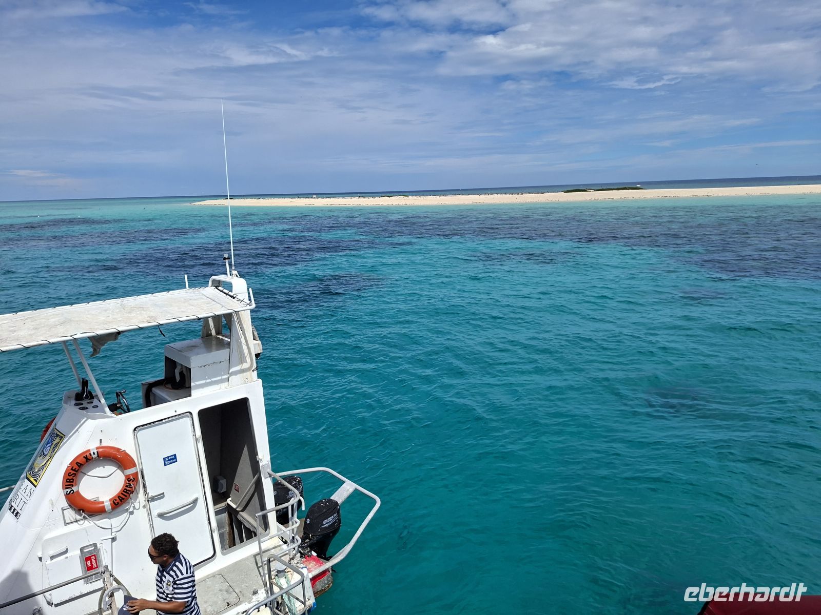 Anschließend erfolgt die Ausgabe der Schnorchel-Ausrüstung und der Taucheranzüge. Und schon sind wir am Ziel unserer kleinen Kreuzfahrt, der Michael`s Cay, einem kleinen Korallenriff, dass auch ein Vogelschutzgebiet ist. Also dürfen wir nur ein abgeteiltes Stück vom Strand nutzen. Nach einer kleinen Fütterung der Fische von Bord der „Ocean Spirit“ durch Alex, sind wir dabei, als das erste Tenderboot zur Insel ablegt. Wie bestellt kommt endlich die Sonne heraus. Ich schnorchle ca. 30 Minuten, dann sind meine Kräfte aufgezehrt. Leider hat auch hier im Great Barrier Reef die Korallenbleiche eingesetzt, dennoch war es ein schönes Erlebnis. Erschöpft und hungrig erreiche ich mit einem Shuttleboot das Mutterschiff. Dort ist das Mittagsbuffet bereits eröffnet. Nach der Lunchpause steigen wir um 13:30 Uhr in ein Halb-U-Boot, in dem wir hintereinander im Trockenen sitzend links und rechts aus den Fenstern die Unterwasserwelt bewundern. Auch Alex wird für unsere deutsche Gruppe als Guide eingesetzt und gibt uns in perfektem Deutsch viele Informationen zur Flora und Fauna des Riffs. Neben zahlreichen farbigen Fischen und Korallen sehen wir auch eine Meeresschildkröte. Nach dieser 30-minütigen Exkursion in die „Tiefsee“ bekommen wir an Bord der “Ocean Spirit“ Kaffee, Kuchen und Sekt und verabschieden uns von unserer Insel. Auf der Rückfahrt nach Cairns lassen wir das Erlebte Revue passieren oder erkunden den Katamaran.