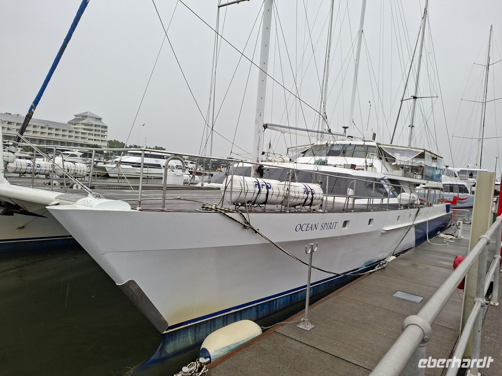 Bereits um 06:30 Uhr treffen wir uns zum Frühstück, denn schon 07:15 Uhr bringt uns ein Bus die wenigen Meter zum Terminal am Pier von Cairns. Ich hole unsere Tickets für die „Ocean Spirit“ vom Schalter ab und gemeinsam gehen wir zum Liegeplatz unseres Katamarans. Noch regnet es, so dass wir uns bis zum Boarding um 08:00 Uhr unterstellen müssen. Dennoch entscheiden wir uns, auf dem Oberdeck des modernen Schiffes an zwei Tischen Platz zu nehmen. Wie geplant stechen wir um 08.30 Uhr in See und sind ca. zwei Stunden unterwegs. An Bord gibt es Kaffee und Tee sowie verschiedene Muffins. Für das spätere Schnorcheln und Tauchen füllen wir jeder ein Gesundheitszeugnis aus.