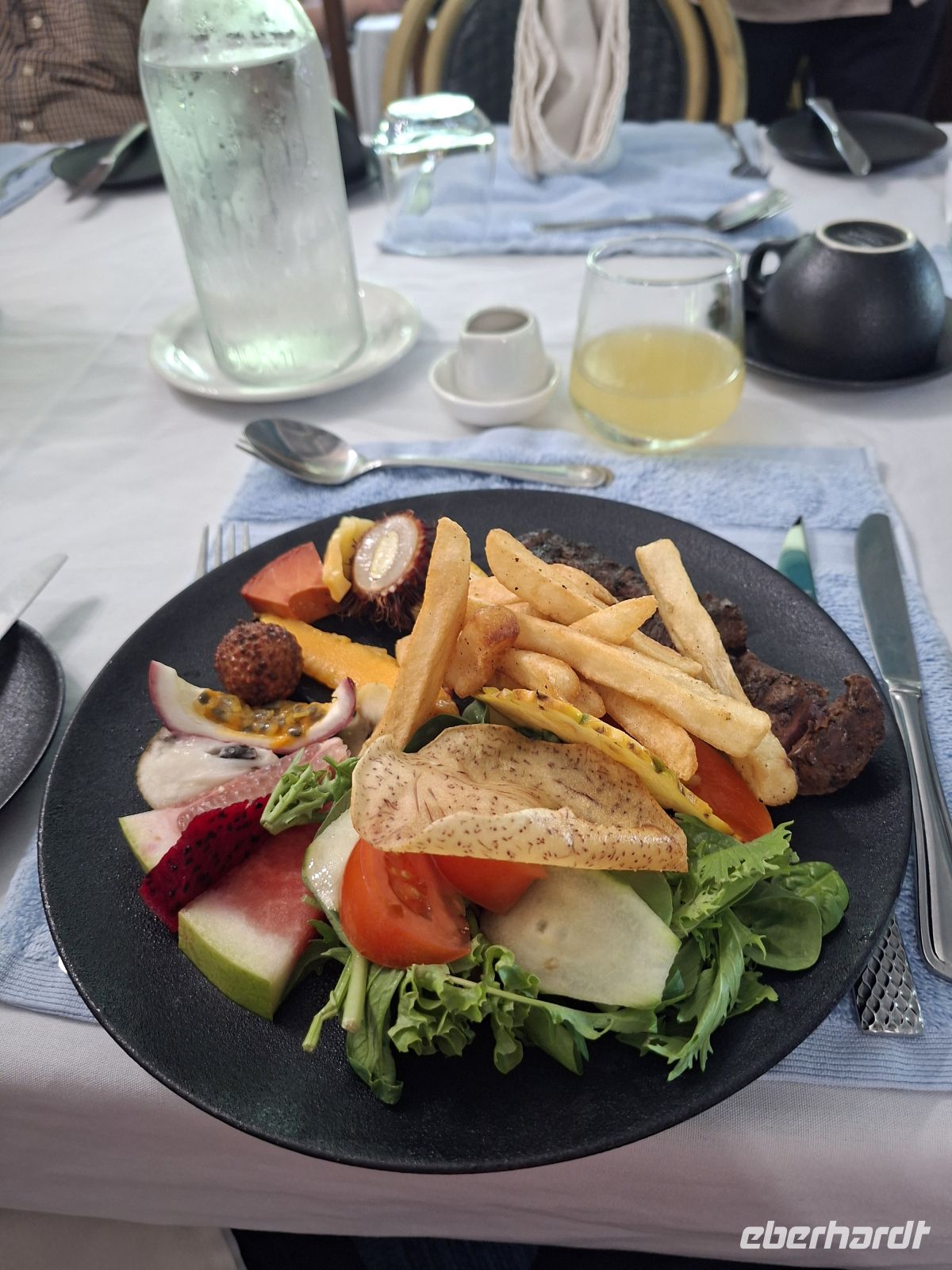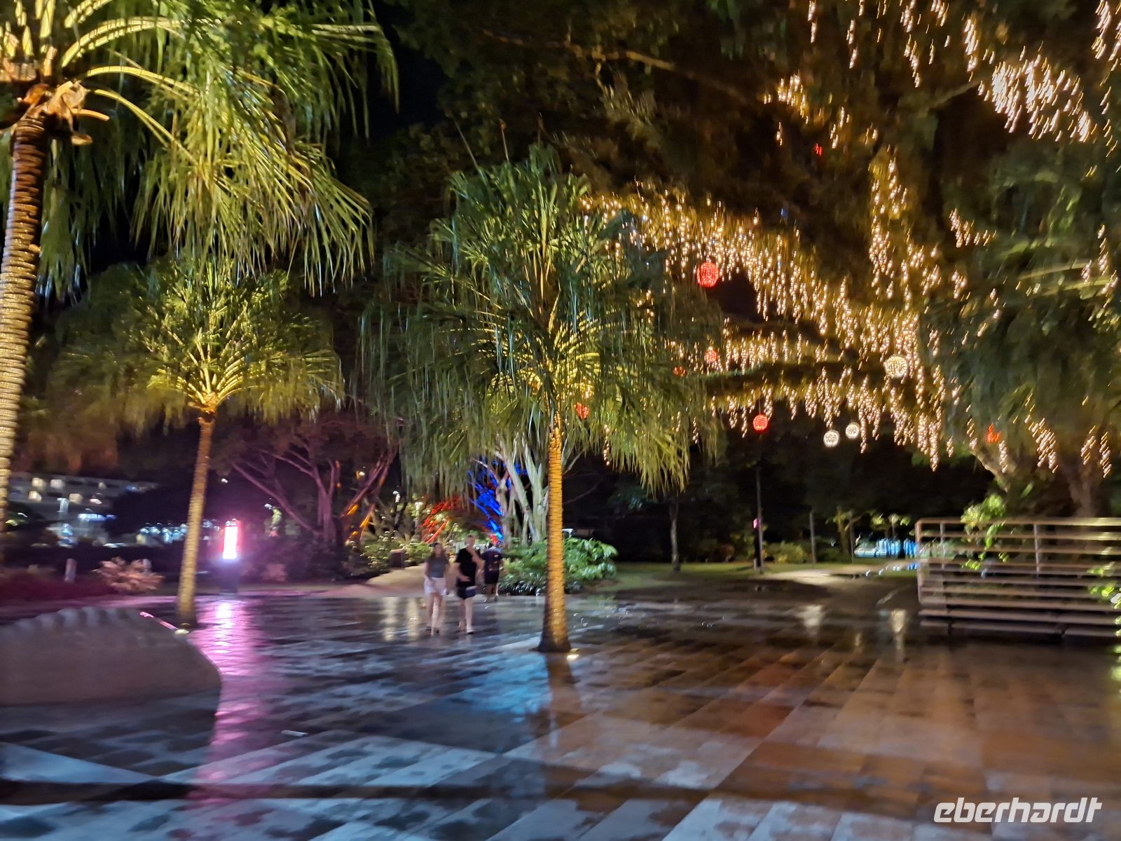 Um 16:30 Uhr checken wir für 4 Nächte im 5-Sternehotel „Crystalbrook Flynn“ direkt an der Esplanade ein. Wir verabreden uns für 17:30 Uhr zum Abmarsch ins indonesische Restaurant „Bayleafe“, wo unser fakultatives Abendessen um 18:00 Uhr reserviert ist. Da im Restaurant bis 18:30 Uhr „Happy Hour“ angesagt ist, bestellen wir unsere Getränke heute mal zum halben Preis und genießen das sehr leckere Essen. Auch danach ist noch etwas Zeit, um noch etwas die lebhafte Strandpromenade entlang zu laufen.