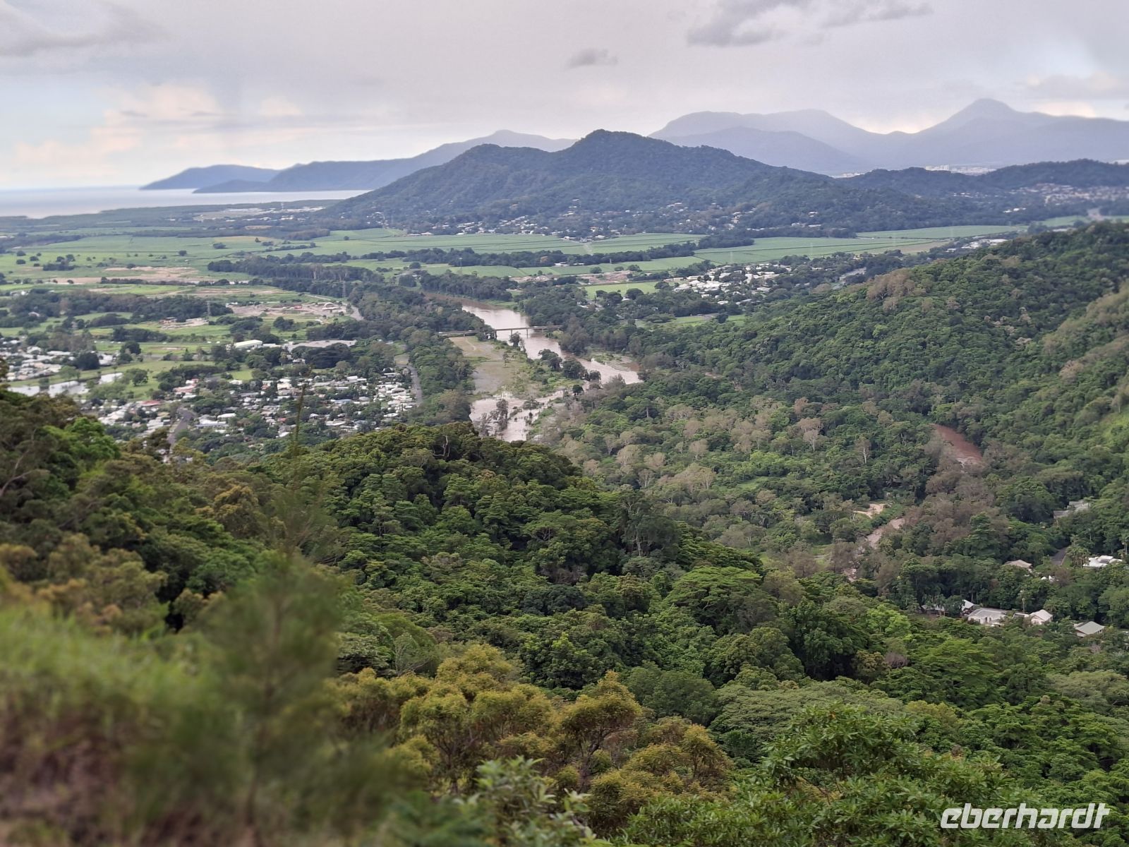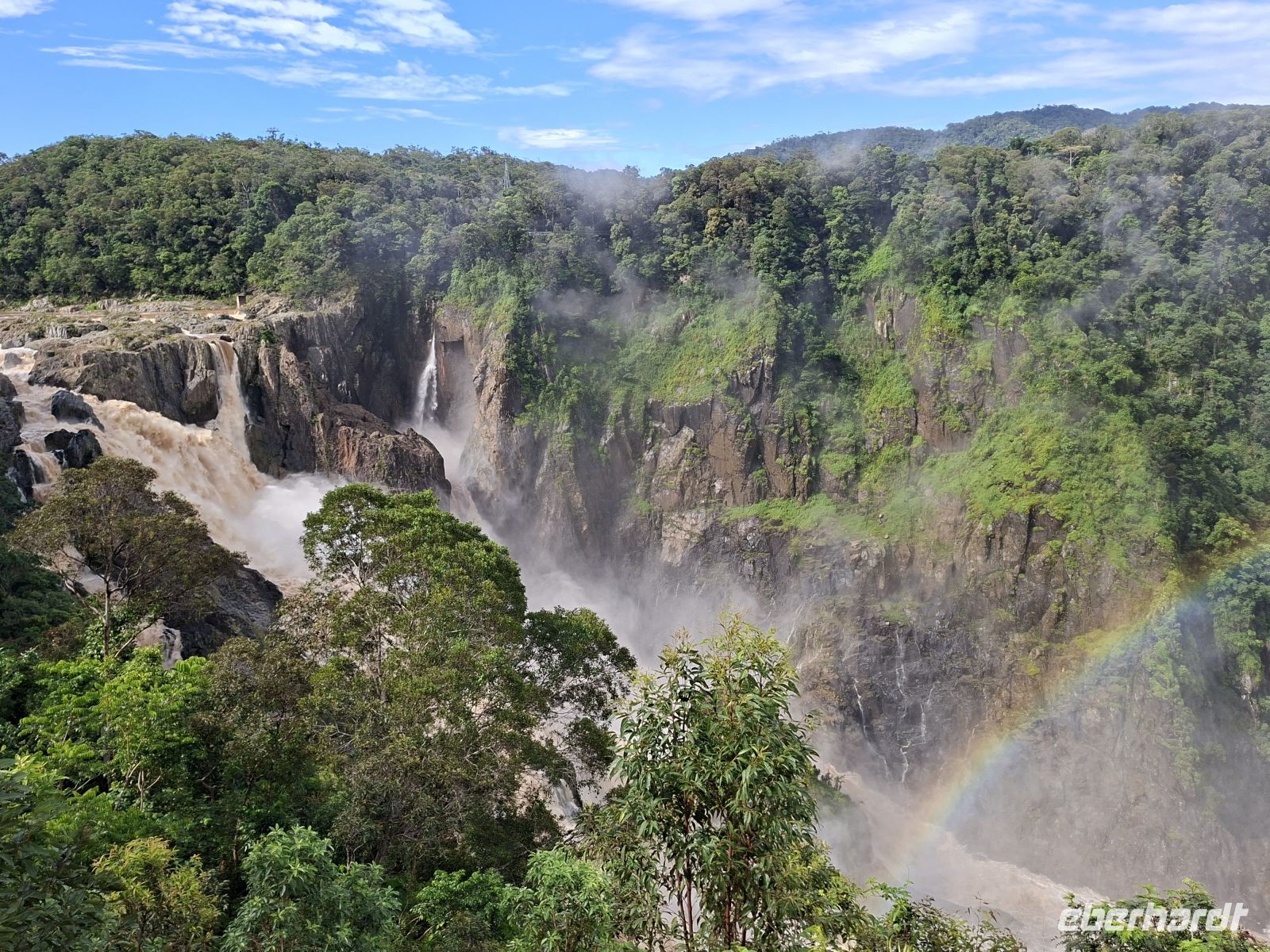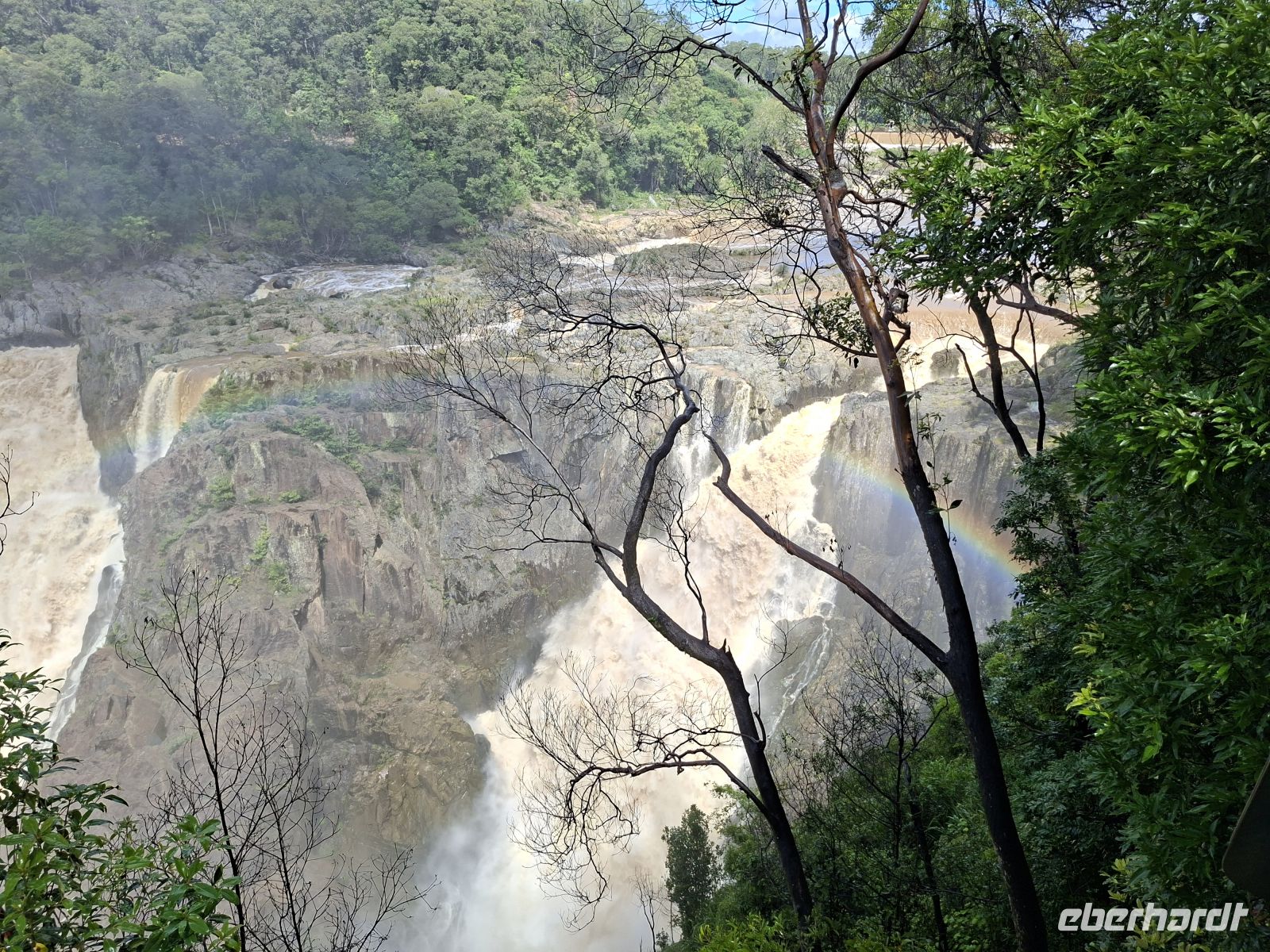Weiter geht die Fahrt zur 2. Station, wo wir einen weiten Blick über die Tablelands genießen. Satte Grünflächen für die Rinderzucht und fruchtbare Böden für den Anbau von Ananas, Mango, Erdbeeren und Kartoffeln sind zu sehen. Dann bietet sich ein kurzer Blick auf den Barron-Wasserfall, den wir von einem Aussichtspunkt an der 2. Bergstation des Skyrail noch besser betrachten können. Die vielen Wassermassen der Regenzeit verschmelzen beim Fall ins Tal mit dem Sonnenlicht und bilden einen prächtigen Regenbogen.