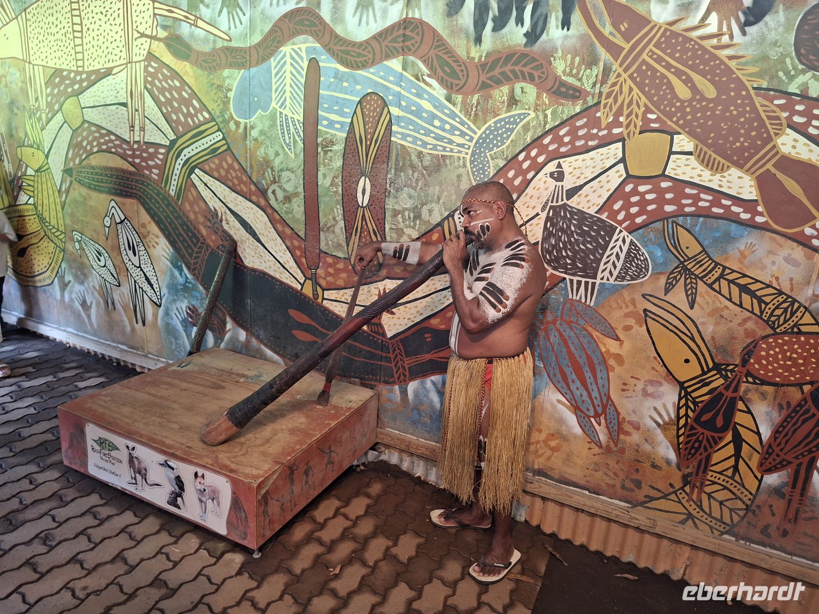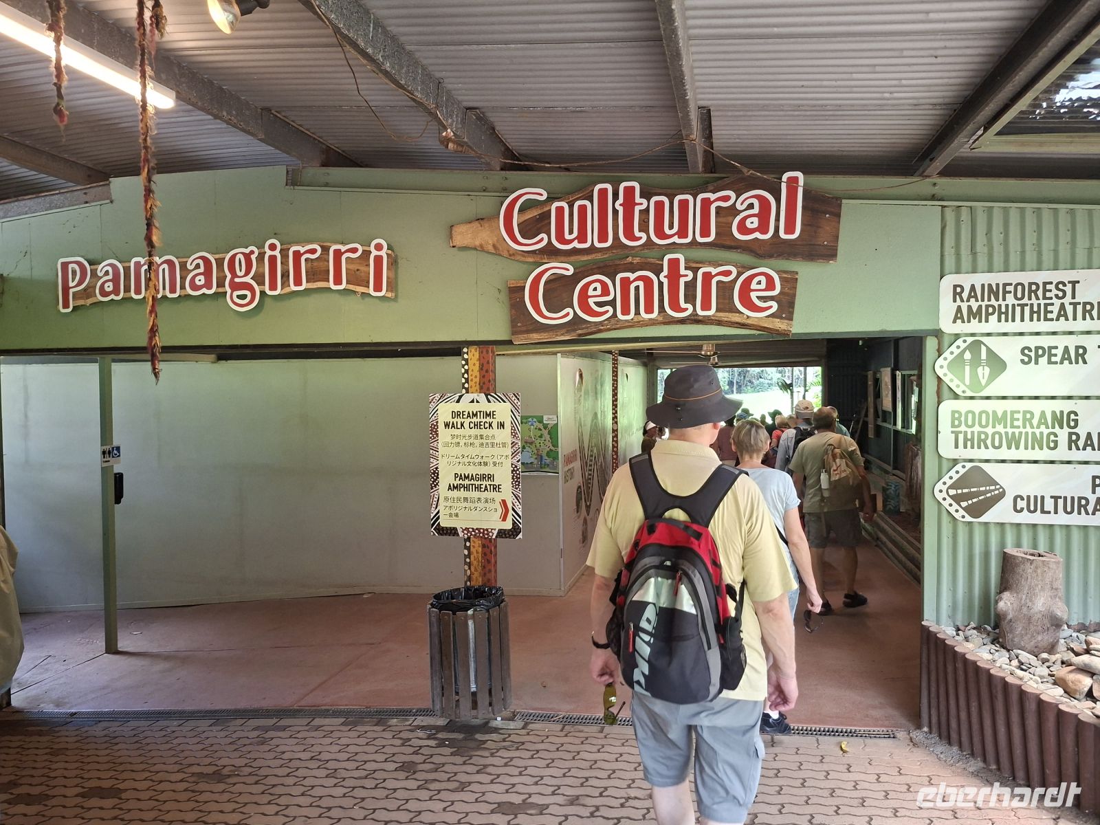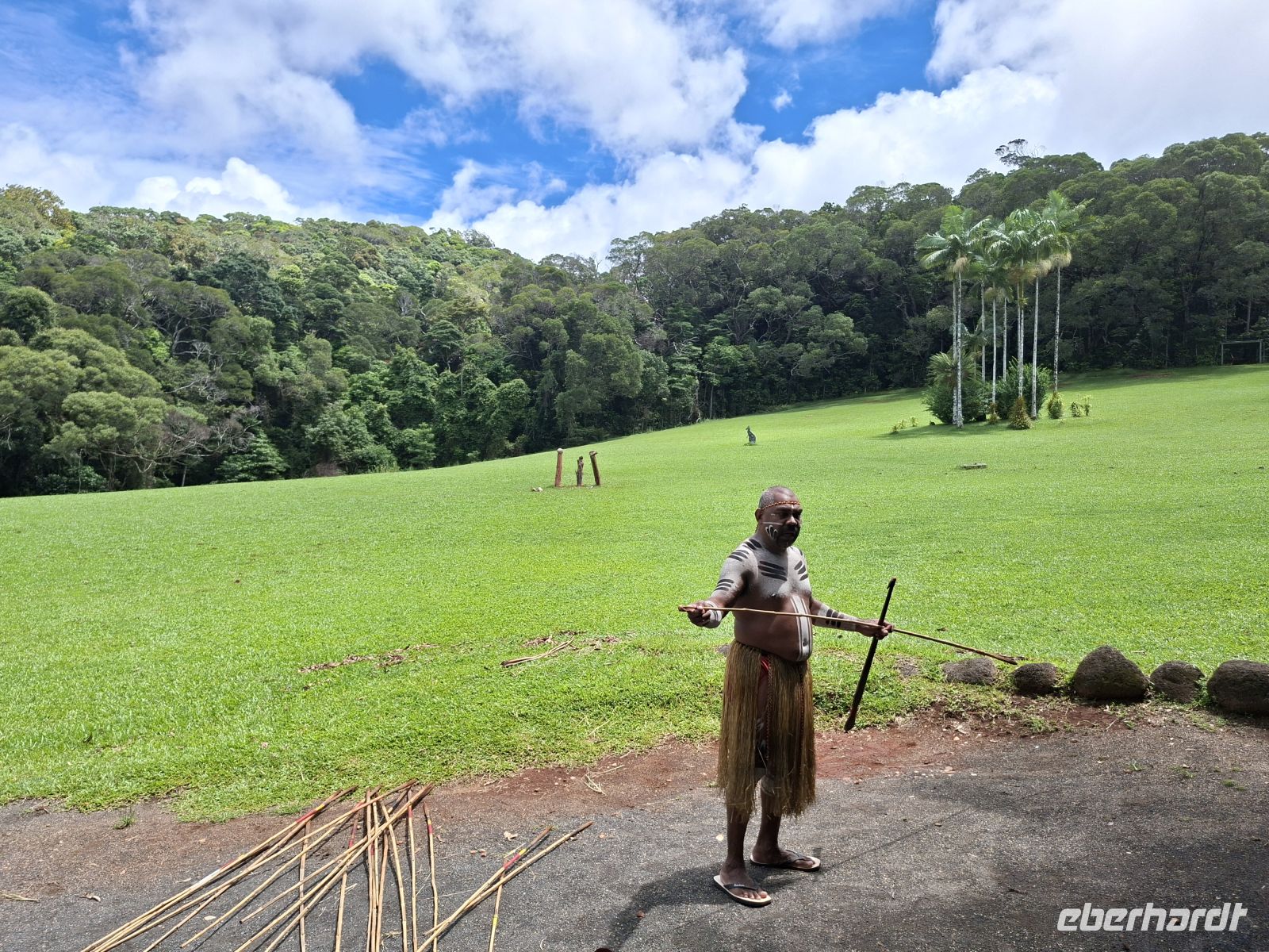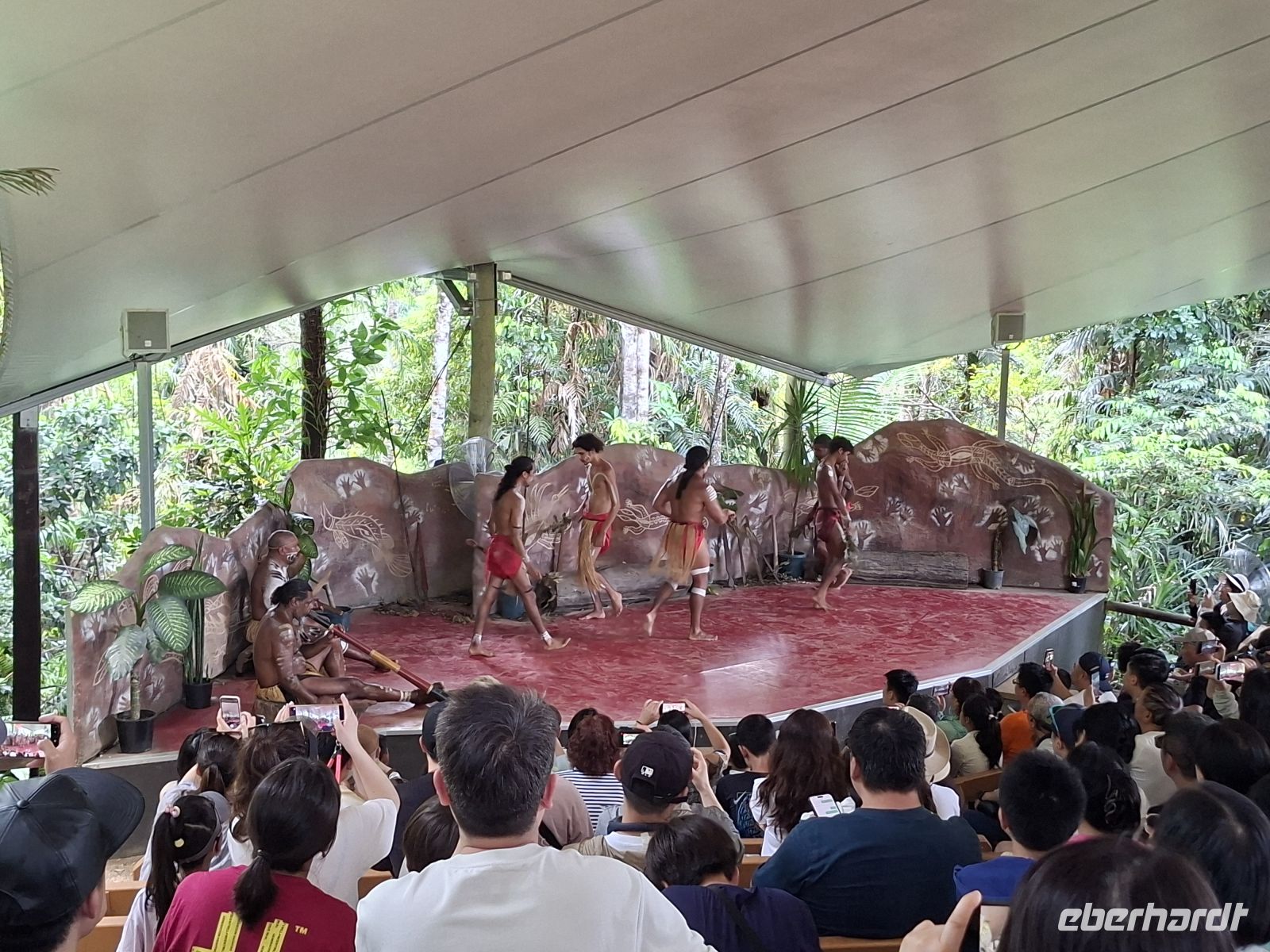 Schließlich steigen wir in einen Shuttlebus ein, der uns zur Rainforest Station, ein Kulturzentrum des hier ansässigen Volkes der Pamagirri, bringt. Ein einheimischer Guide, der unserer Gruppe zugeordnet wurde, zeigt uns seine Künste im Speerwurf. Weiter geht der „Dreamtime Walk“ zu einem abgesperrten Bereich, wo wir selbst das Werfen eines Bumeranges üben können. Die Aborigines verwenden diese Waffe vor allem für die Jagd auf Vögel. Nun zeigt uns unser Guide, wie man ein Didgeridoo spielt und ahmt sogar einige Tierlaute nach. Abschließend verfolgen wir die Tanzshow der Pamagirri und sind besonders von den Tanzkünsten der beteiligten Kinder beeindruckt.