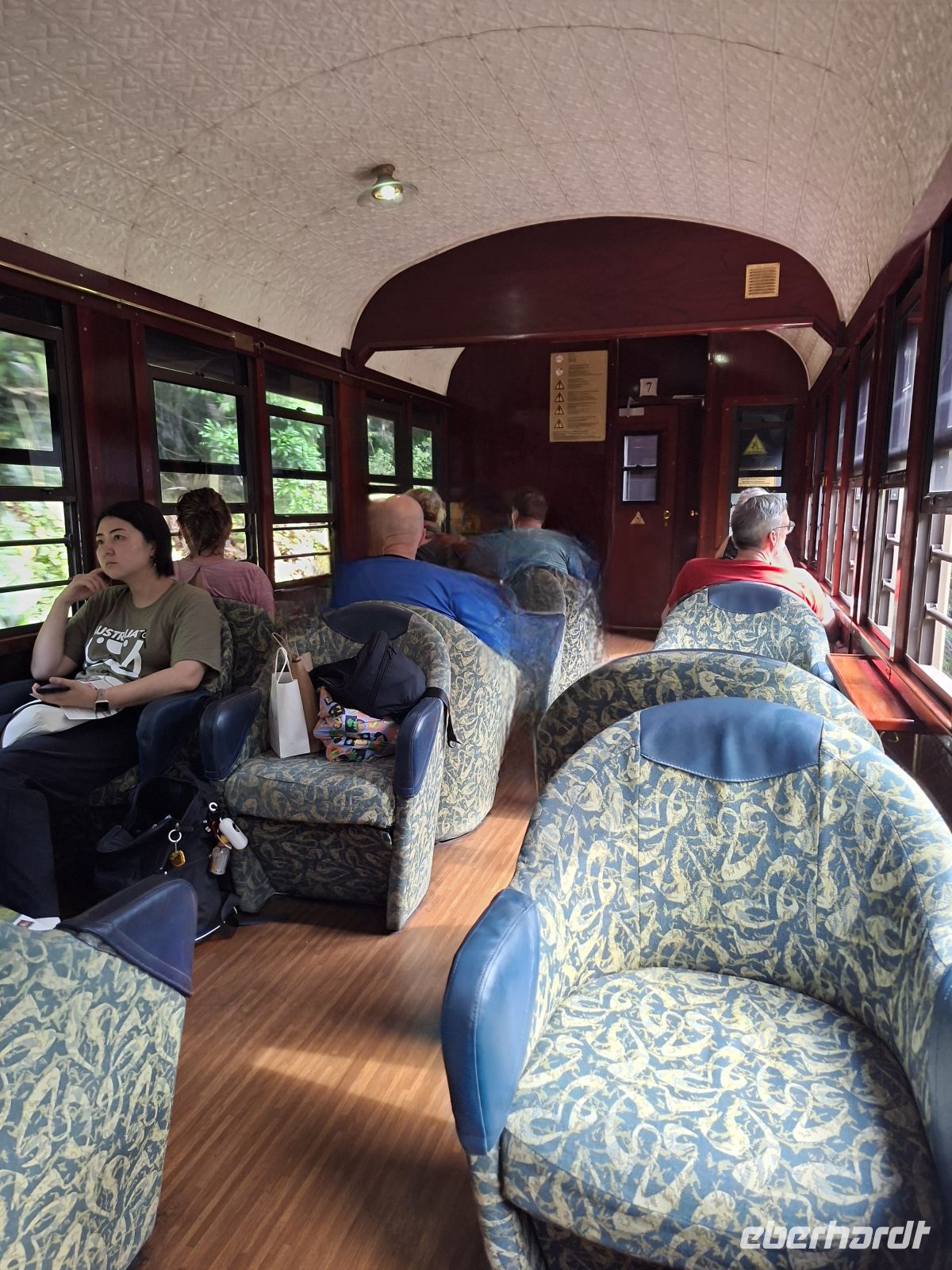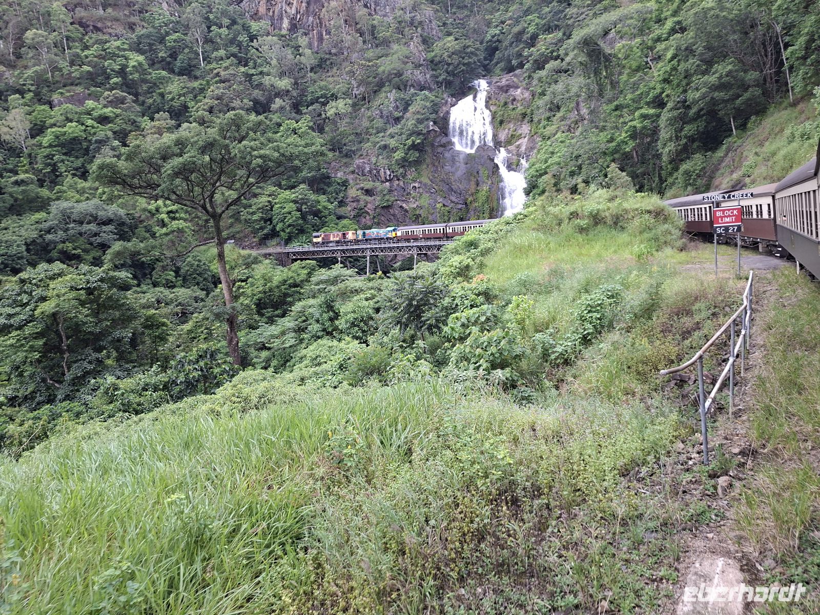 Überraschenderweise kann uns unsere Reiseleiterin Annette ein Upgrade für 56 AUD in die „Golden Class“ des „Kuranda Scenic Train“ anbieten, so dass wir in bequemen Schalensesseln Platz nehmen und obendrein noch bewirtet werden. Es gibt Getränke nach Wunsch und eine Käseplatte. Der Zug stoppt noch einmal an den Barron-Falls, die aus dieser Richtung noch gewaltiger aussehen. Nach dem Einsteigen fahren wir ein Stück und passieren langsam die kurvige Brücke an den Stony-Creak-Falls. Die rührige Zugbegleiterin gibt uns Tipps, wo wir wann unsere Fotos machen sollen. Es war sehr lustig, und die Zeit vergeht wie im Flug.