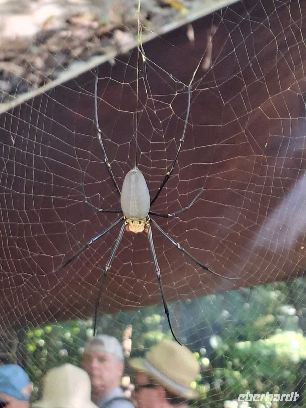 Zurück auf der Plattform der zweiten Station sehen wir eine 10 cm große goldene Weberspinne. Auch ein Model des Wärters des Regenwaldes, des Kasuars, ist zu sehen. Annette nimmt das zum Anlass, uns mehr von diesem Laufvogel zu erzählen. Die Henne legt max. 3 Eier und geht dann fort. Der Hahn brütet nicht nur 52 Tage die Eier aus, sondern kümmert sich nach dem Schlüpfen weitere 9 Monate um die Jungvögel. Der Kasuar mit seinem blauen Hals und dem Horn auf dem Kopf gilt durch seine dolchartigen Krallen als gefährlichster Vogel der Welt.