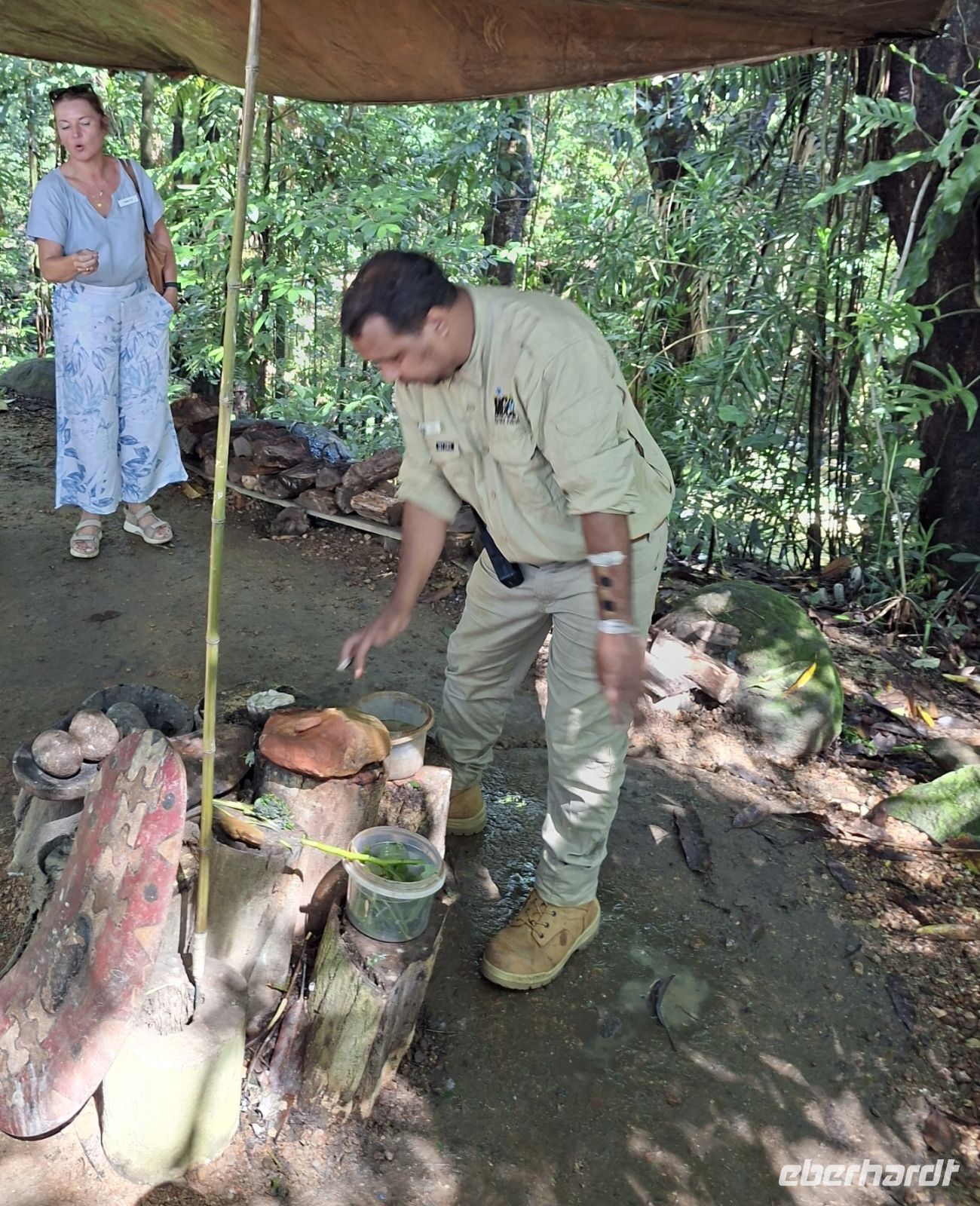 Nach unserer Ankunft am Mossman Gorge Cultural Center werden wir von einem einheimischen Guide an eine Feuerstelle geführt. Im Kreis müssen wir uns bei einer Rauchzeremonie tanzend und wedelnd durch den Rauch bewegen und empfangen so das Wohlwollen und die Zustimmung der Ahnen, dass wir als Besucher willkommen sind. Unser einheimischer Guide zeigt uns im Anschluss, aus welchen natürlichen Stoffen die für die Bemalung der Haut wichtigen Farben Ocker, Weiß und Schwarz erzeugt werden.