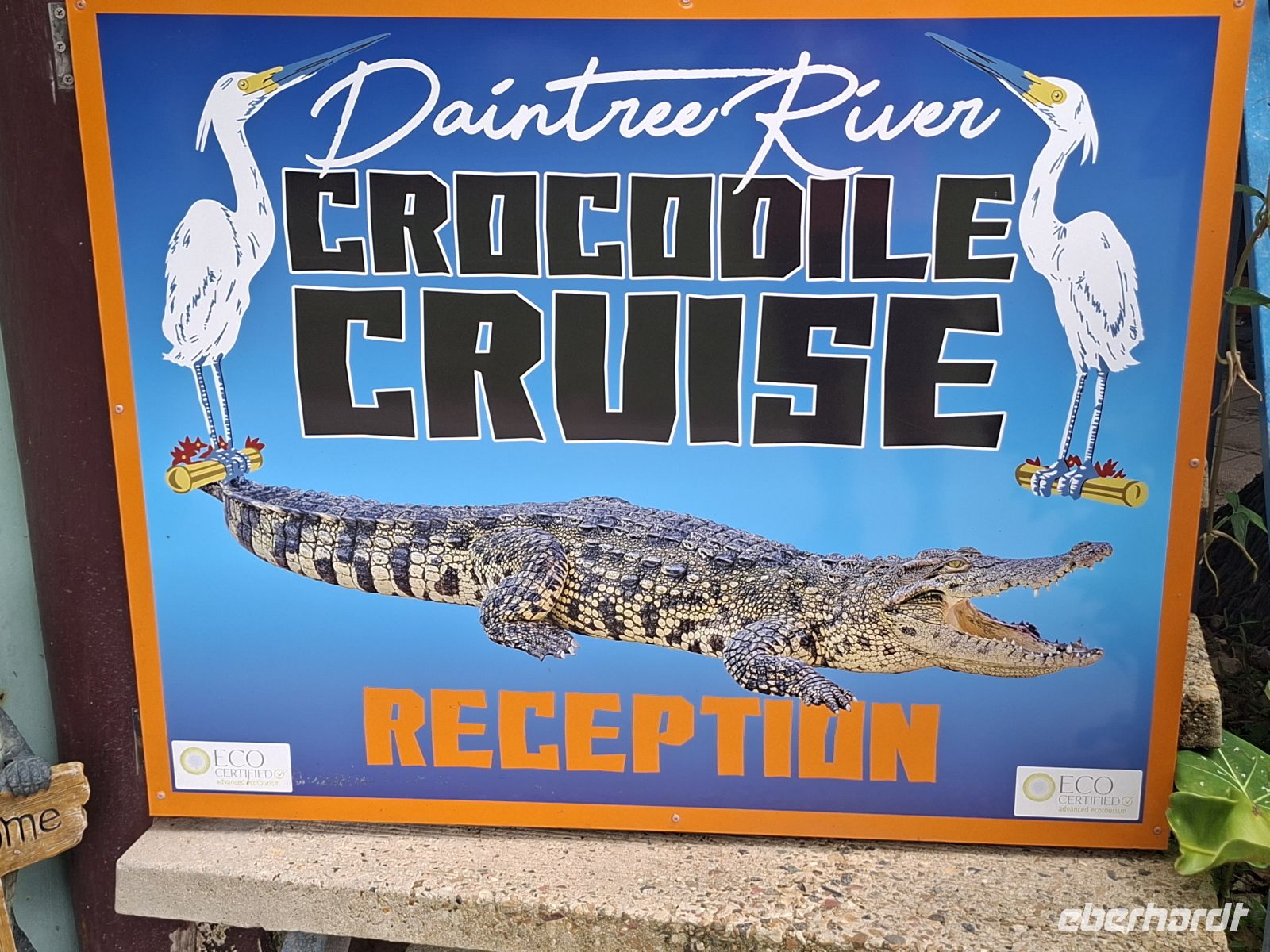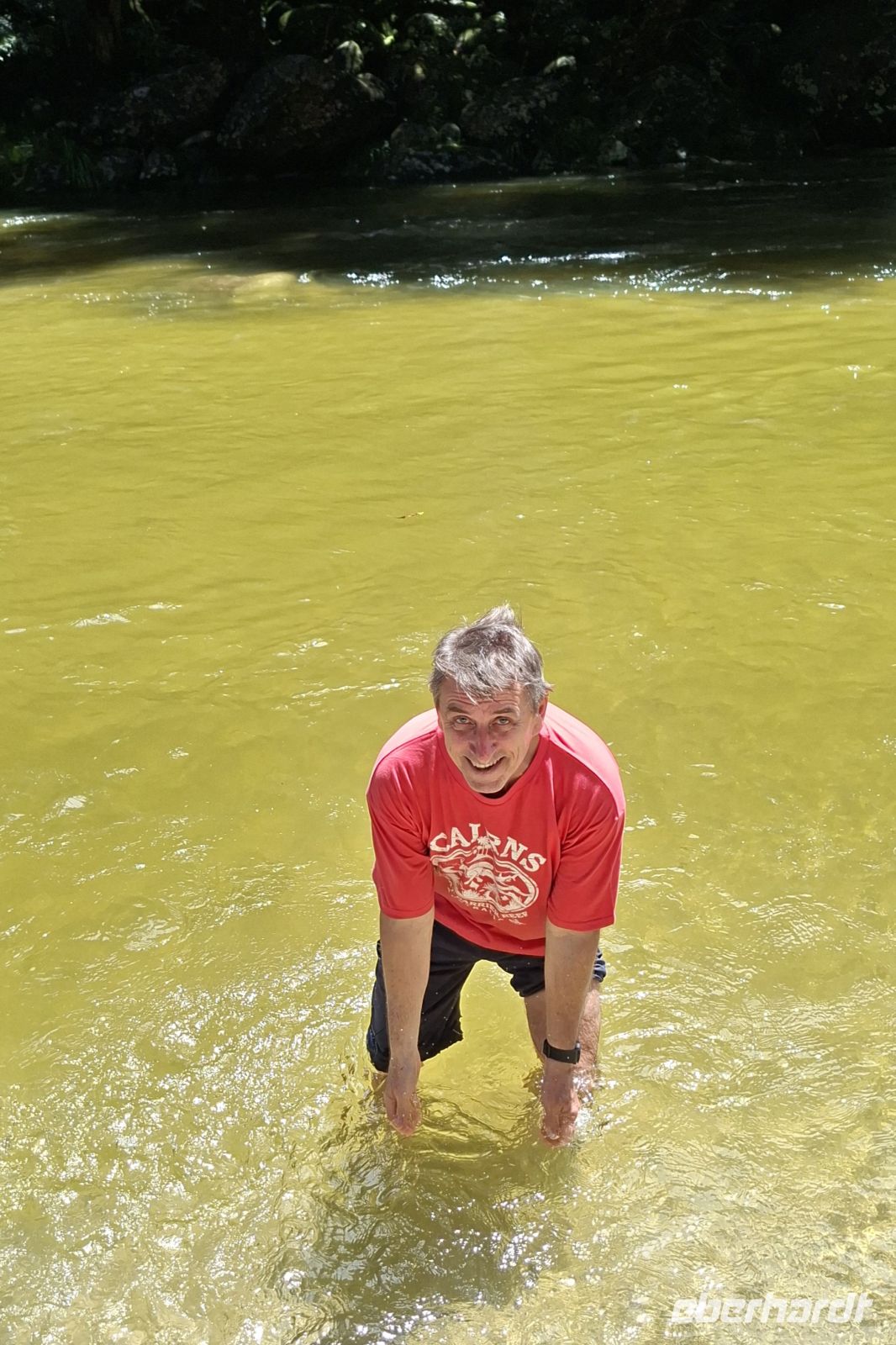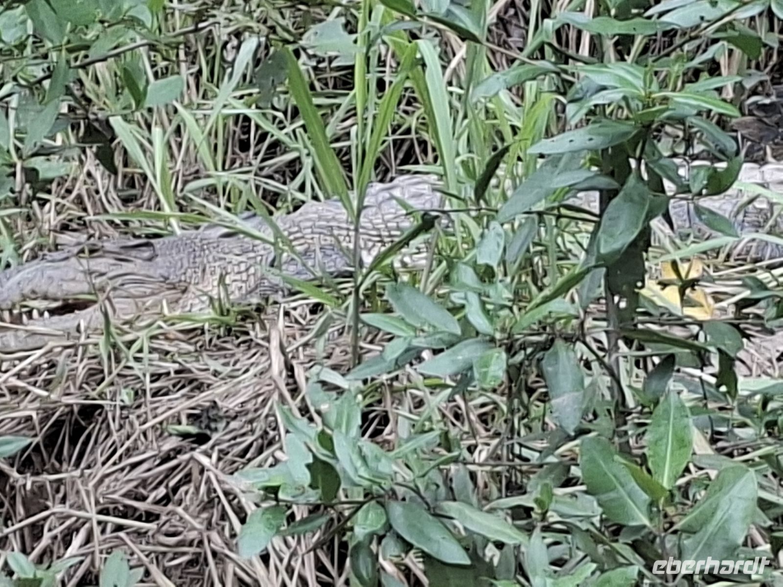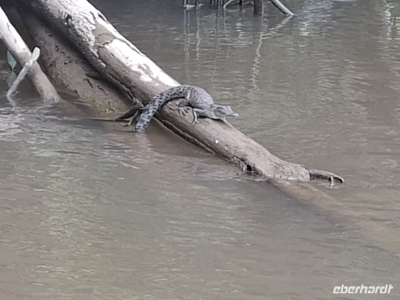 Anschließend bringt uns ein Shuttlebus zum Regenwald-Trail, wo wir eine einstündige Wanderung unternehmen. Wir begleiten den Mossman-River bis zu einer seichten Stelle, wo schon einige Touristen im kühlen Wasser baden. Auch wir genießen kurz die Sonne und die willkommene Abkühlung. Wir gehen noch ein Stück bis zu einer kleinen Hängebrücke. Zurück nehmen wir den gleichen Weg durch den schattigen Regenwald und fahren mit dem Shuttlebus zurück zum Mossman Gorge Kulturzentrum. Von dort starten wir mit unserem Bus zum Mittagessen. Wir besuchen dazu das Daintree-Teahouse, ein kleines privat geführtes Restaurant, mitten im Regenwald. Nach dem schmackhaften Essen erklärt uns der Eigentümer Einiges zu den exotischen Früchten, die auf dem Teller lagen. Nach diesem interessanten Vortrag verabschieden wir uns. Nach kurzer Fahrt erreichen wir den Bootsanleger der „Daintree River Crocodile Cruise“. Wir begrüßen unseren Kapitän Dave und legen zur kleinen Expedition ab. Schon nach kurzer Zeit sehen wir ein ca. einjähriges Krokodil. Dave erklärt, dass diese Kleinen schon in der Lage sind, einen Finger abzubeißen. Weiter stromaufwärts entdecken wir ein etwa 3 m großes Salzwasserkrokodil, ein Weibchen, welches sich am Ufer sonnt. Auf der Rückfahrt sehen wir oberhalb des Ufers 2 Rinder grasen, im Wasser darunter entdecken wir erneut ein ausgewachsenes Weibchen, das wohl darauf wartet, dass ein Rind zum Trinken zum Fluss herab steigt. Nach einer Stunde und einem weiteren Baby-Krokodil, legen wir wieder am Ufer an und sind begeistert von diesem Erlebnis. Mit dem Gefühl, dass unsere lange Reise nun langsam dem Ende zustrebt, steigen wir wieder in unseren Bus. Unser Fahrer Cavel bringt uns nach Port Douglas. Unsere Reiseleiterin macht den Vorschlag, dass wir uns noch vom Meer verabschieden könnten. So halten wir am „Four Mile Beach“ und trinken auf die schöne Reise und eine gute Rückkehr ein Glas Sekt im Beachclub „The Surfy“. Nach einem kurzen Strandspaziergang lädt uns der Bus wieder ein. Auf der Rückreise zum Hotel verabschieden wir uns von unserer netten Reiseleiterin Annette und vom quirligen Fahrer Cavel.