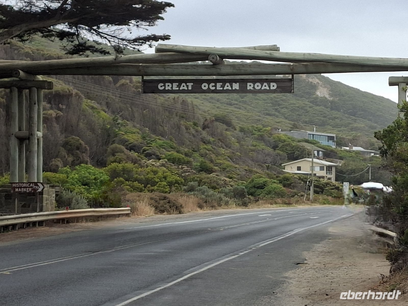 Nach der Weiterfahrt kommen wir durch das kleine Örtchen Anglesea und erreichen schließlich das Tor zur Great Ocean Road, welches zahlreiche Bustouristen und auch uns zum Fotostopp zwingt. Wir laufen ein paar Schritte zum Strand und steigen weiter hinten wieder in unserem Bus ein, der uns auf kurvenreicher Strecke nahe der herrlichen Küste weiter in Richtung Westen bringt. Immer wieder wechseln sich Steilküsten mit flachen Küstenabschnitten ab. Später gelangen wir in die Küstenstadt Lorne, die an diesem Wochenende Ziel vieler Erholungssuchenden ist. Nicht nur der Campingplatz ist voll, sondern viele Angler und Surfer suchen ihr Glück im Meer. Bei einem kurzen Stopp sehen wir die typischen weißen Kakadus mit ihren gelben Häubchen, aber auch die Variante mit dem rosa Kopf, die Galahs.