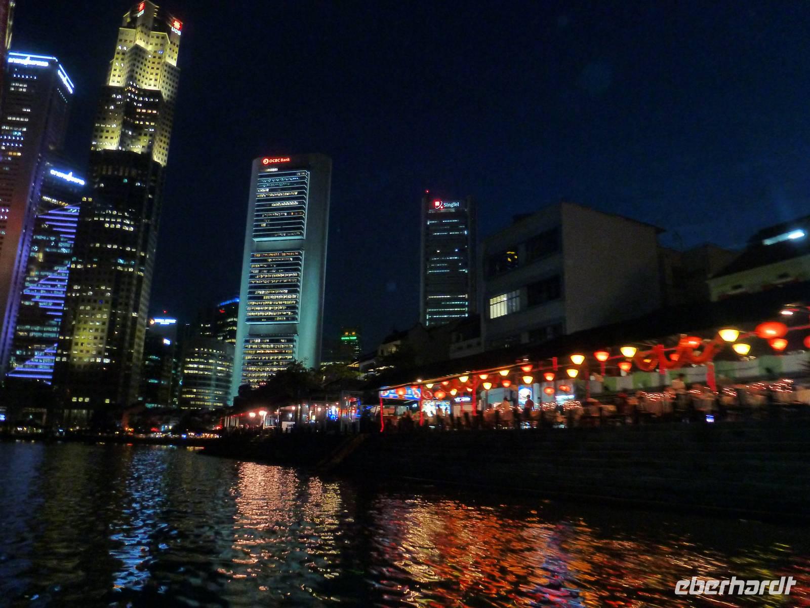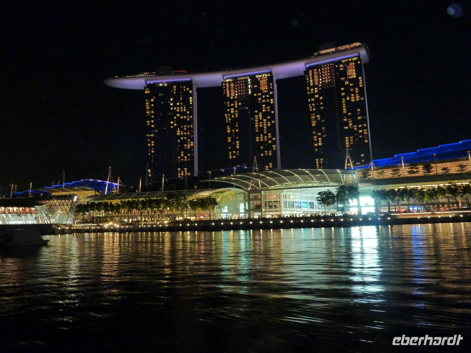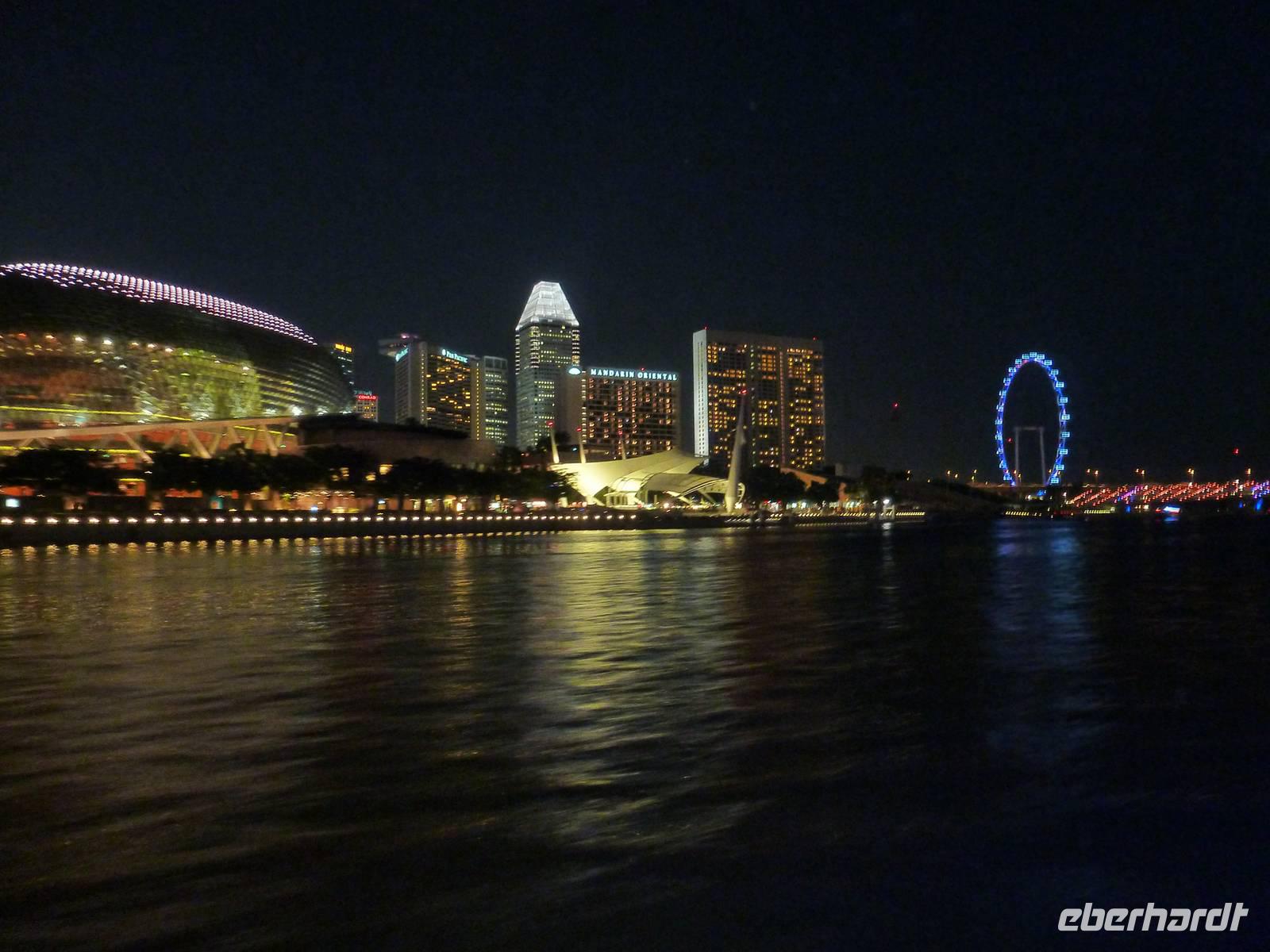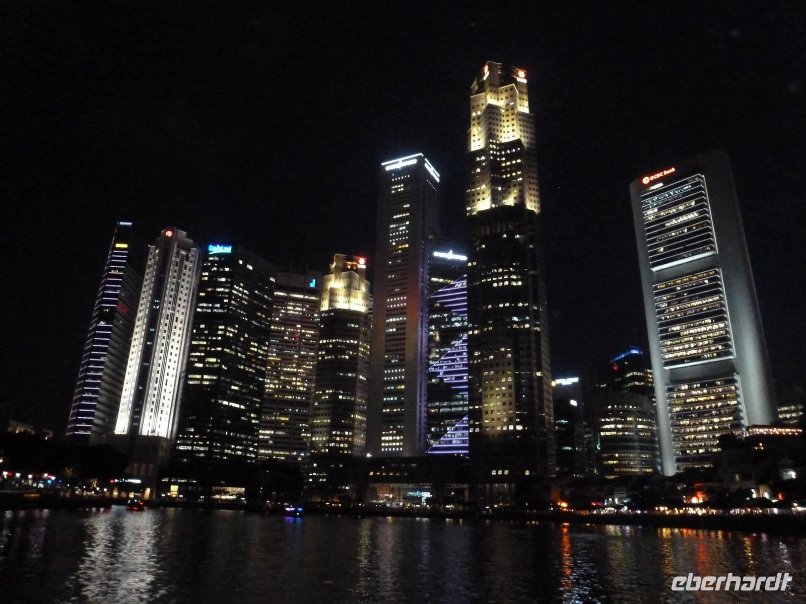 Wir sind um 16:25 Uhr Ortszeit in Singapur gelandet - es hat alles super geklappt. Und der tolle Flughafen hat uns willkommen geheißen - noch fix durch die Einreise und die Koffer holen und dann erwartete uns unsere nette Reiseleiterin Martine schon mit dem blauen Eberhardt Schild. Die Koffer wurden mit dem LKW ins Hotel gefahren und wir fuhren im Reisebus durch die südostasiatische Metropole in unser Hotel Grand Park City Hall direkt im Zentrum der Stadt. Und wir wollten Singapur gleich kennenlernen und so sind wir runter zum Singapur River - dem Fluß welcher sich durch die Stadt schlingelt, gegangen. Dort haben wir eine Bootsfahrt gemacht - es war jetzt schon dunkel um 19 Uhr und so war es atemberaubend schön. Der Kontrast der alten Häuschen am Ufer und der stählernen und verglasten Wolkenkratzer direkt dahinter. Ein wunderschönes Bild, welches wir in vollen Zügen genossen. Nachher sind wir ins „Seafood Forum", einem tollen Meeresfrüchte-Restaurant am Fluß gegangen. Dort haben wir es und richtig gut gehen lassen - Schrimps, Fisch, Hühnchen, asiatischer Reis und Krabben - typisch für Singapur! Ein „Tiger" - das Bier aus Singapur, gab es natürlich auch dazu. Schließlich sind wir auf einem Stückchen der Formel 1 Strecke zurück zum Hotel spaziert und dann sind wir glücklich und zufrieden ins Bett gefallen!