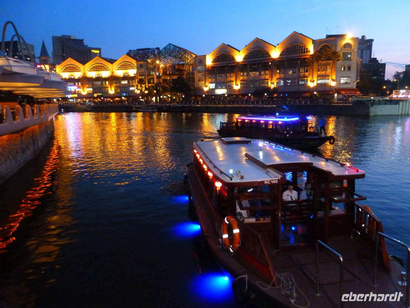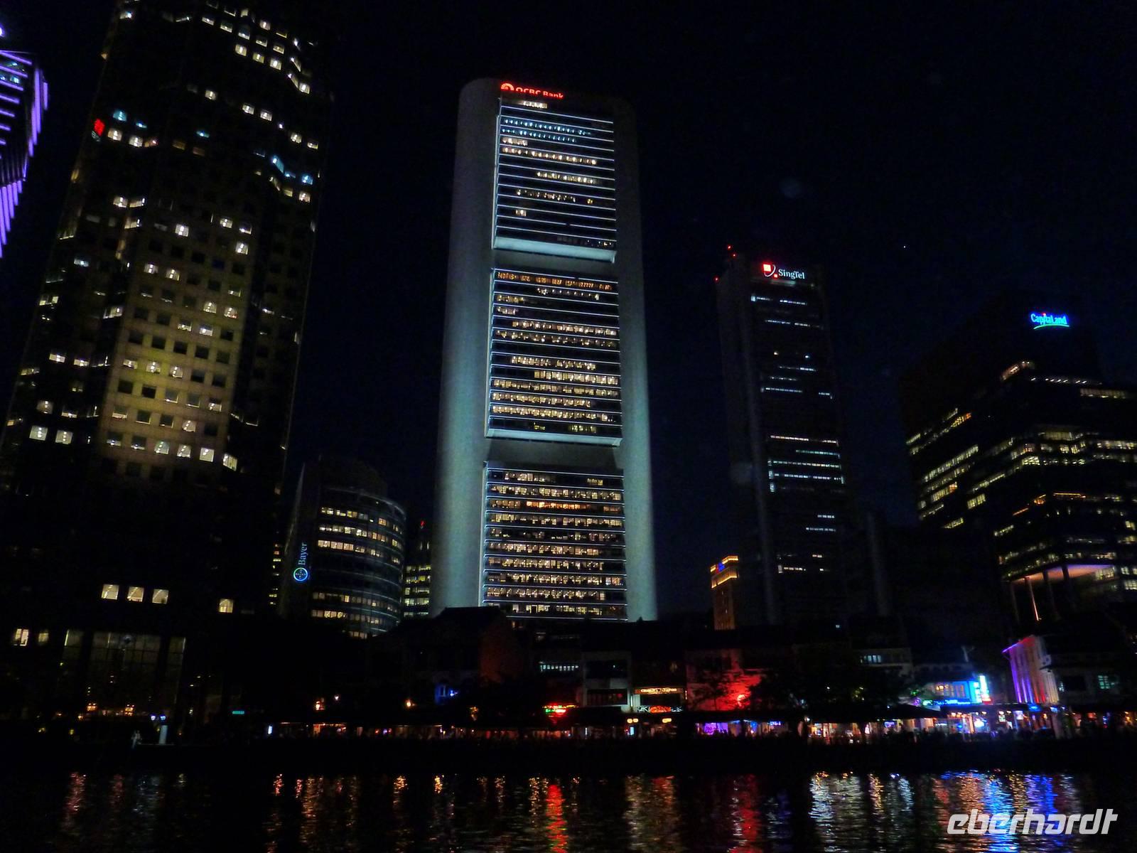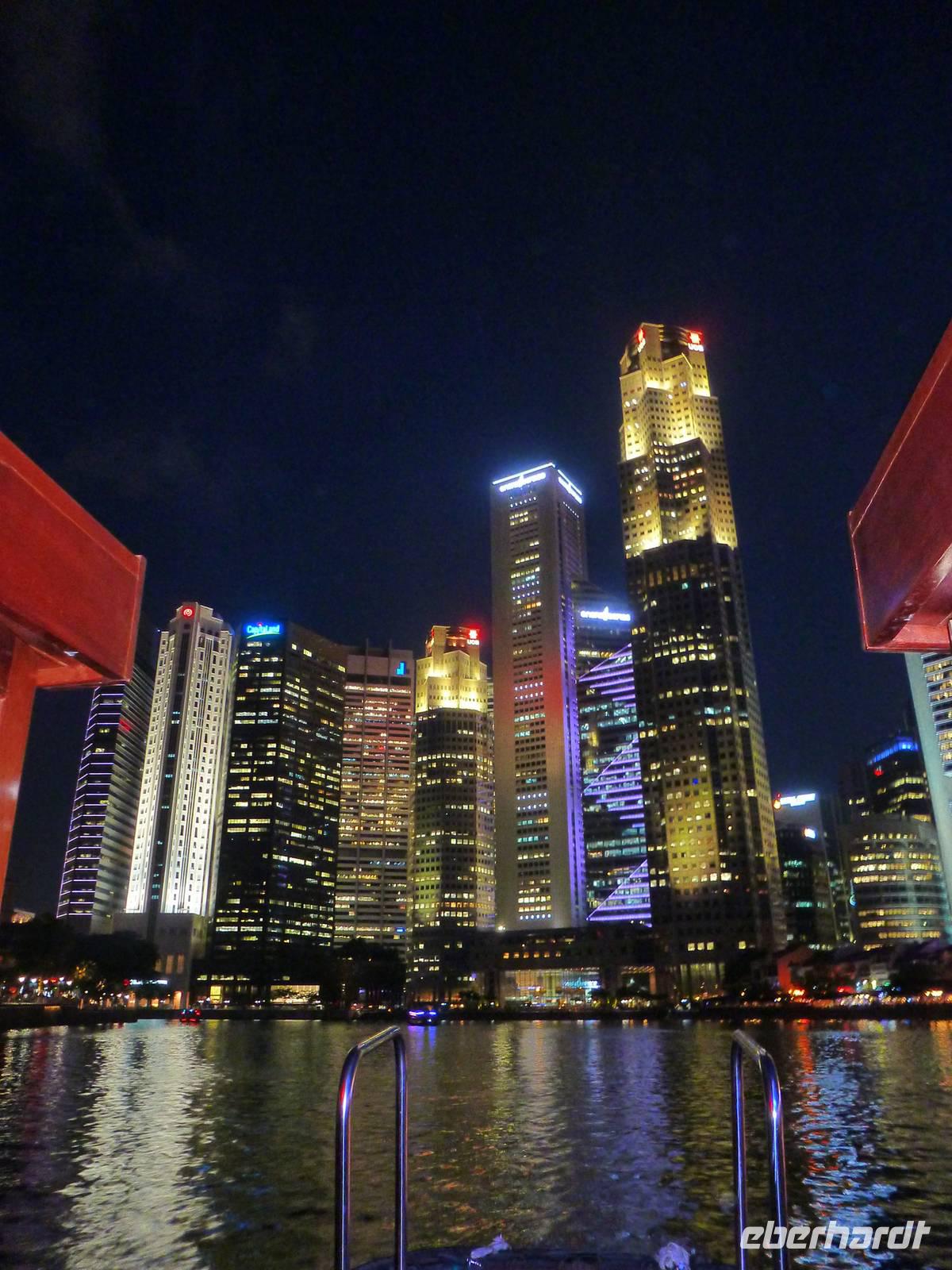 Wir sind um 16:25 Uhr Ortszeit in Singapur gelandet - es hat alles super geklappt. Und der tolle Flughafen hat uns willkommen geheißen - noch fix durch die Einreise und die Koffer holen und dann erwartete uns unsere nette Reiseleiterin Martine schon mit dem blauen Eberhardt Schild. Die Koffer wurden mit dem LKW ins Hotel gefahren und wir fuhren im Reisebus durch die südostasiatische Metropole in unser Hotel Grand Park City Hall direkt im Zentrum der Stadt. Und wir wollten Singapur gleich kennenlernen und so sind wir runter zum Singapur River - dem Fluß welcher sich durch die Stadt schlingelt, gegangen. Dort haben wir eine Bootsfahrt gemacht - es war jetzt schon dunkel um 19 Uhr und so war es atemberaubend schön. Der Kontrast der alten Häuschen am Ufer und der stählernen und verglasten Wolkenkratzer direkt dahinter. Ein wunderschönes Bild, welches wir in vollen Zügen genossen. Nachher sind wir ins „Seafood Forum", einem tollen Meeresfrüchte-Restaurant am Fluß gegangen. Dort haben wir es und richtig gut gehen lassen - Schrimps, Fisch, Hühnchen, asiatischer Reis und Krabben - typisch für Singapur! Ein „Tiger" - das Bier aus Singapur, gab es natürlich auch dazu. Schließlich sind wir auf einem Stückchen der Formel 1 Strecke zurück zum Hotel spaziert und dann sind wir glücklich und zufrieden ins Bett gefallen!