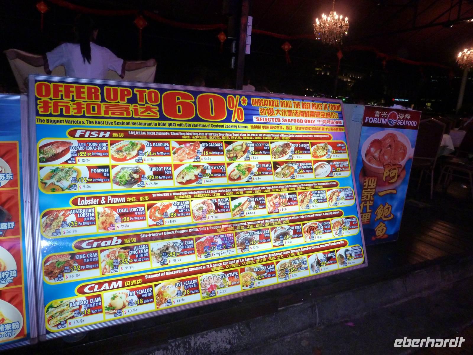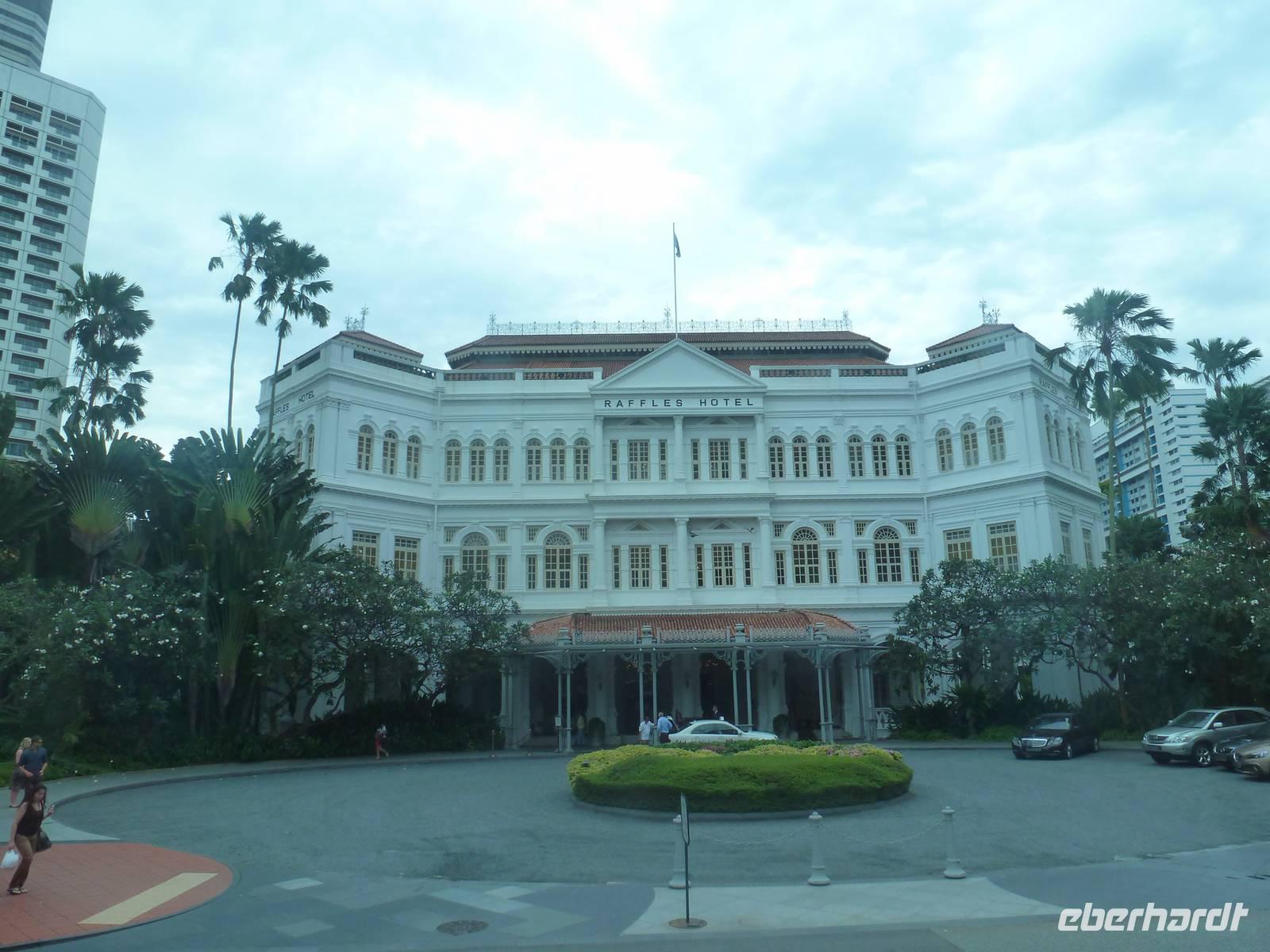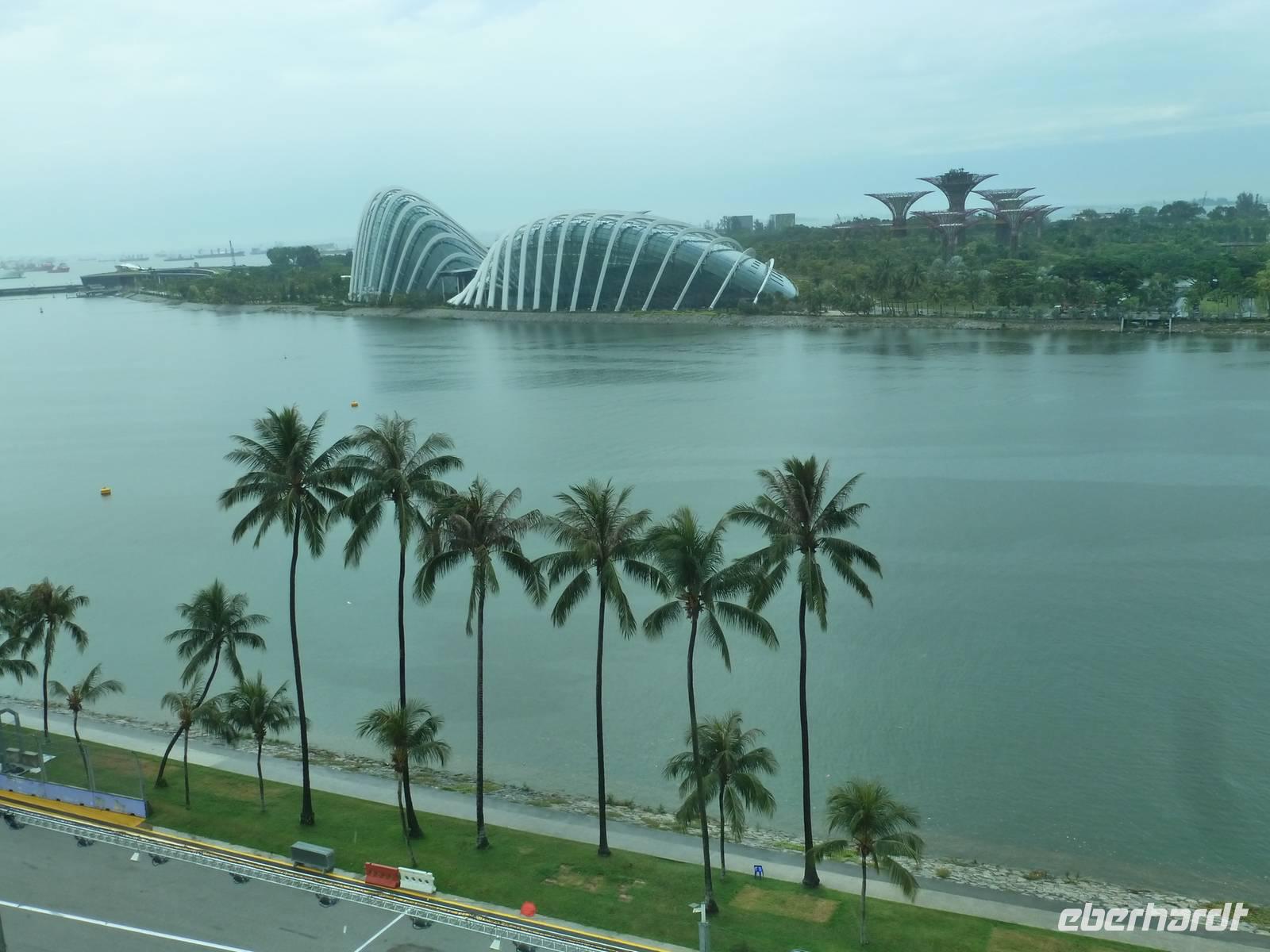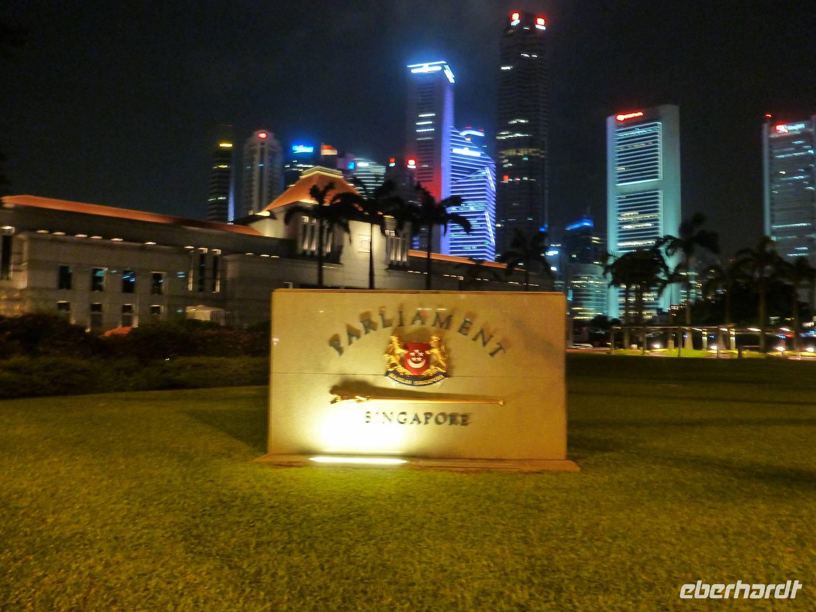 Wir sind um 16:25 Uhr Ortszeit in Singapur gelandet - es hat alles super geklappt. Und der tolle Flughafen hat uns willkommen geheißen - noch fix durch die Einreise und die Koffer holen und dann erwartete uns unsere nette Reiseleiterin Martine schon mit dem blauen Eberhardt Schild. Die Koffer wurden mit dem LKW ins Hotel gefahren und wir fuhren im Reisebus durch die südostasiatische Metropole in unser Hotel Grand Park City Hall direkt im Zentrum der Stadt. Und wir wollten Singapur gleich kennenlernen und so sind wir runter zum Singapur River - dem Fluß welcher sich durch die Stadt schlingelt, gegangen. Dort haben wir eine Bootsfahrt gemacht - es war jetzt schon dunkel um 19 Uhr und so war es atemberaubend schön. Der Kontrast der alten Häuschen am Ufer und der stählernen und verglasten Wolkenkratzer direkt dahinter. Ein wunderschönes Bild, welches wir in vollen Zügen genossen. Nachher sind wir ins „Seafood Forum", einem tollen Meeresfrüchte-Restaurant am Fluß gegangen. Dort haben wir es und richtig gut gehen lassen - Schrimps, Fisch, Hühnchen, asiatischer Reis und Krabben - typisch für Singapur! Ein „Tiger" - das Bier aus Singapur, gab es natürlich auch dazu. Schließlich sind wir auf einem Stückchen der Formel 1 Strecke zurück zum Hotel spaziert und dann sind wir glücklich und zufrieden ins Bett gefallen!