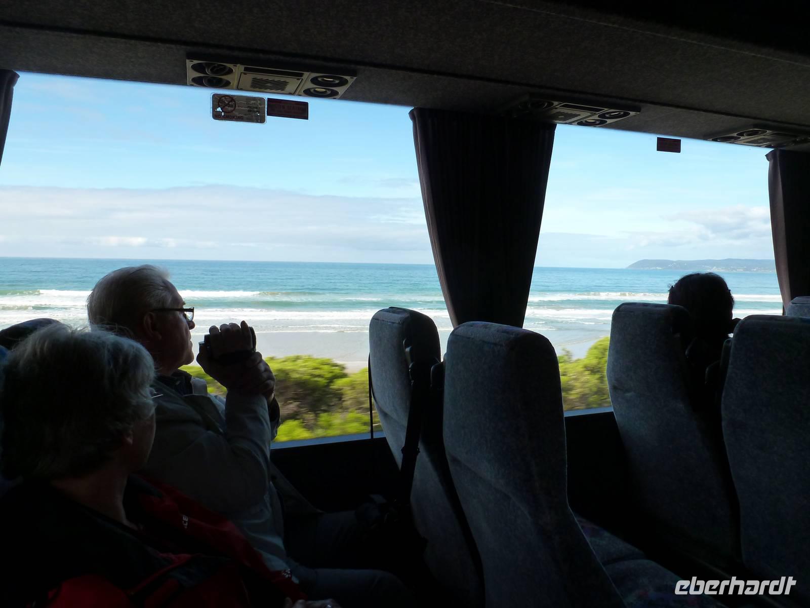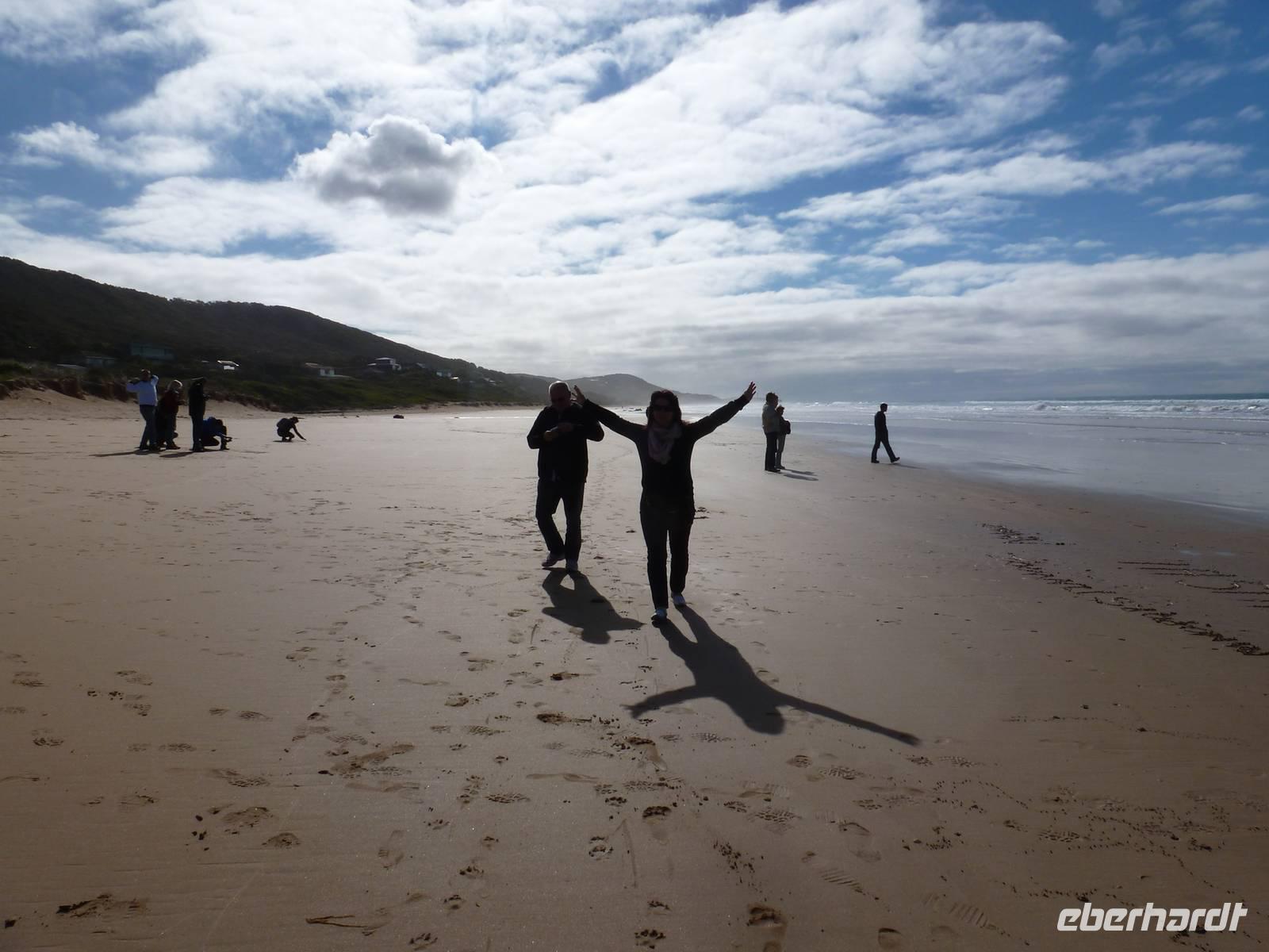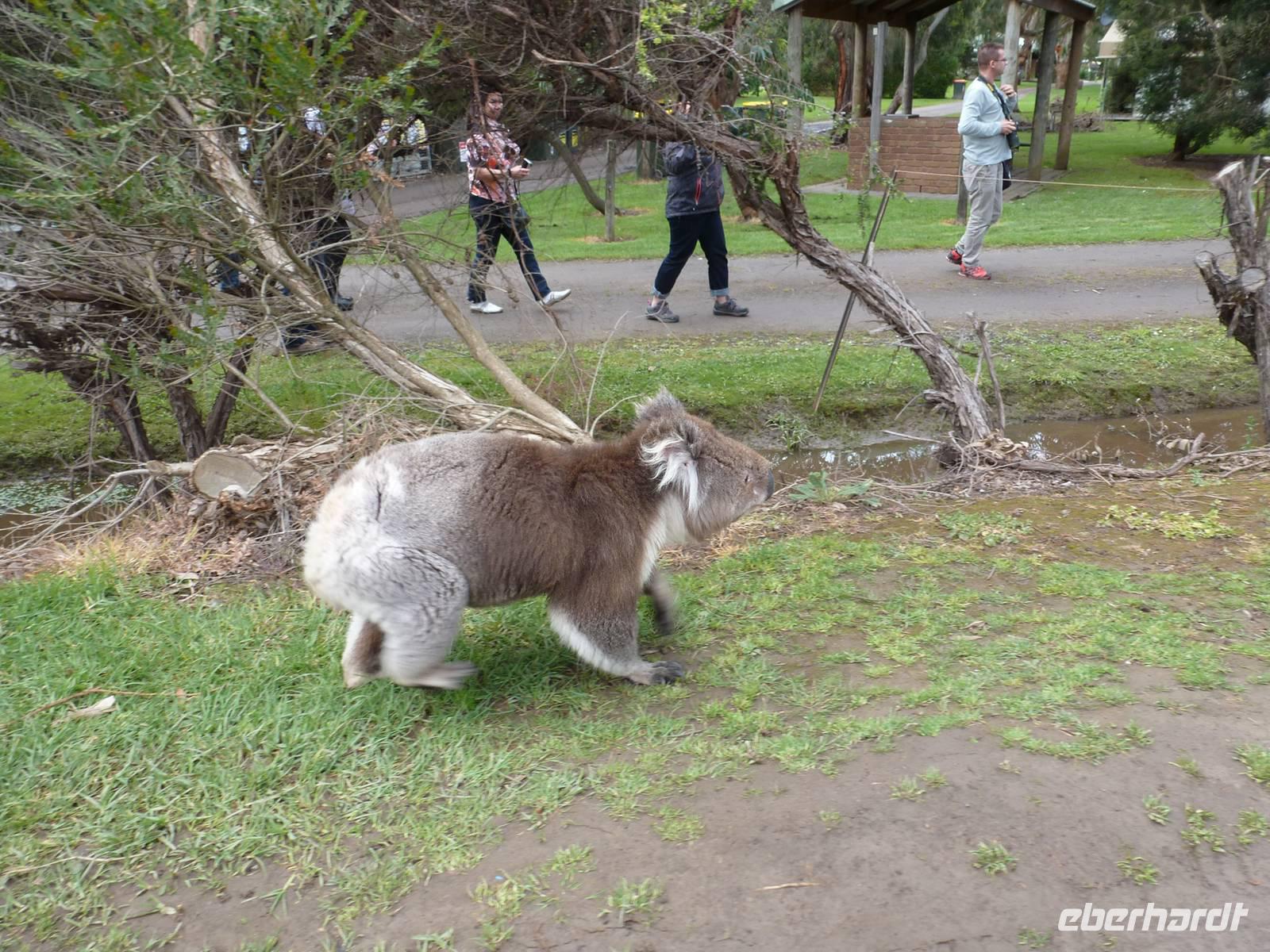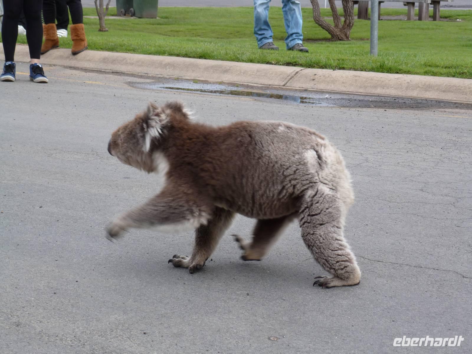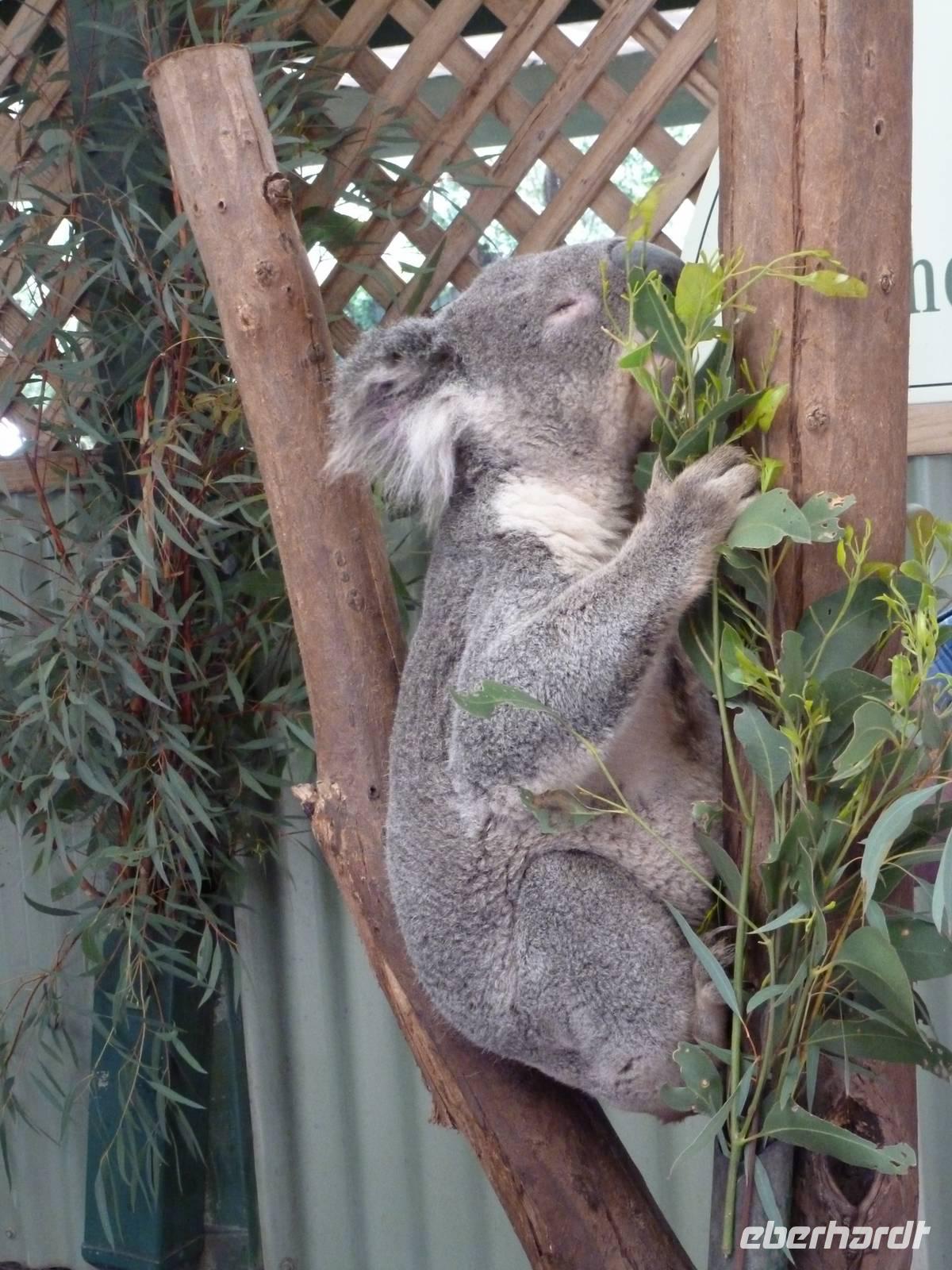Der heutige Tag startete schon früh um 8, denn wir wollten eine der schönsten Küstenstraßen der Welt entdecken - die 400km lange Great Ocean Road. Sie schlängelt sich entlang traumhafter Strände, versteckter Buchten und atemberaubender Steilküsten Südaustraliens und verbindet kleine Fischerdörfer und Urlaubsorte miteinander. Wir fuhren also raus aus Melbourne und genossen diesen wunderschönen Ausflug bei Sonnenschein und gutem Wetter. Wir stoppten zuerst in einem kleinen Dorf Anglesea für einen frischen Kaffee, dann an der offiziellen Einfahrt auf diese Küstenstraße bevor wir an unserem nächsten Stopp etwas Besonderes erleben sollten: wir hielten an einem Campingplatz Kennett River, um Koalas in den Bäumen zu entdecken und ein paar bunte Vögel zu erspähen. Und kaum hielten wir mit dem Bus an, kam wie bestellt ein Koala direkt an unserem Bus vorbeigelaufen. Etwas ganz besonders -ein Koala auf der Straße. Wir folgten dem kleinen Tierchen auf seiner Suche nach einem passenden Eukalyptusbaum, auf dem er sich nach seiner anstrengenden Wanderung erst einmal zum schlafen auf die Äste verziehen konnte. Ein einmaliges Erlebnis. Und als ob das nicht genug wäre, kamen viele bunte Papageien angeflogen und setzten sich auf die Köpfe und Arme einiger Gäste...hier war was los, und das mitten in der Natur! Weiter ging es entlang endloser Sandstrände nach Apollo Bay, wo uns im Apollo Bay Hotel ein sehr gutes Mittagessen mit Fisch, Hühnchenschnitzel, Rinderbraten oder Nasi Goreng erwartete. Noch ein kleiner Strandbesuch und dann ging es weiter, denn wir hatten noch viel vor! Wir fuhren zu den 12 Aposteln, wo Familie Hofmann, welche einen Helikopter Flug über diese wunderschönen Feldformationen von ihren Kindern geschenkt bekommen haben, gemeinsam mit weiteren Gästen diesen Flug genossen. Alle anderen Gäste füllten ihre Speicherkarten mit tollen Fotos dieser Naturschönheit an der Küste. Unser letzter großer Stopp war danach „Loch Ard Gorge", eine Feldformation, wo früher eine Brücke zwei Felsspitzen miteinander verbunden hat und diese jetzt durch Wind & Wetter verschwunden ist. Dort stiegen wir die Treppen hinab in die Schlucht, wo Tom einst Eva nach einem Schiffbruch gerettet hat. Dort ließen wir uns australischen Rotwein, Kängurusalami, Tim-Tam Schokokekse und Cracker bei einem kleinen Überraschungs-Strankpicknik schmecken.....ein toller Abschluss dieses schönen Ausflugs. Schließlich stoppten wir noch in Port Campbell mit seinem kleinen, feinen Strand, bevor wir am späten Nachmittag wieder zurück nach Melbourne fuhren und nach 600km wieder in unserem Hotel ankamen!