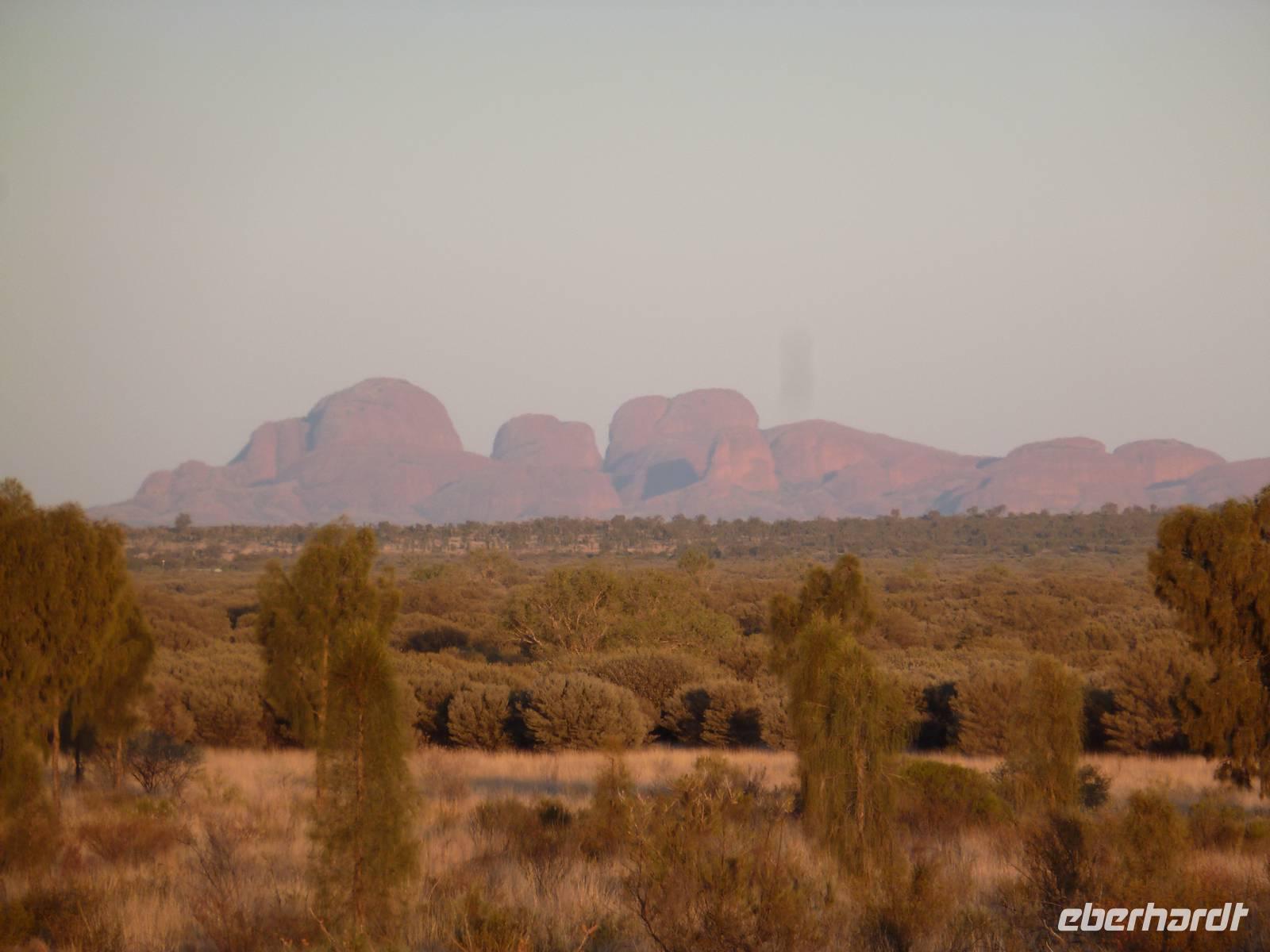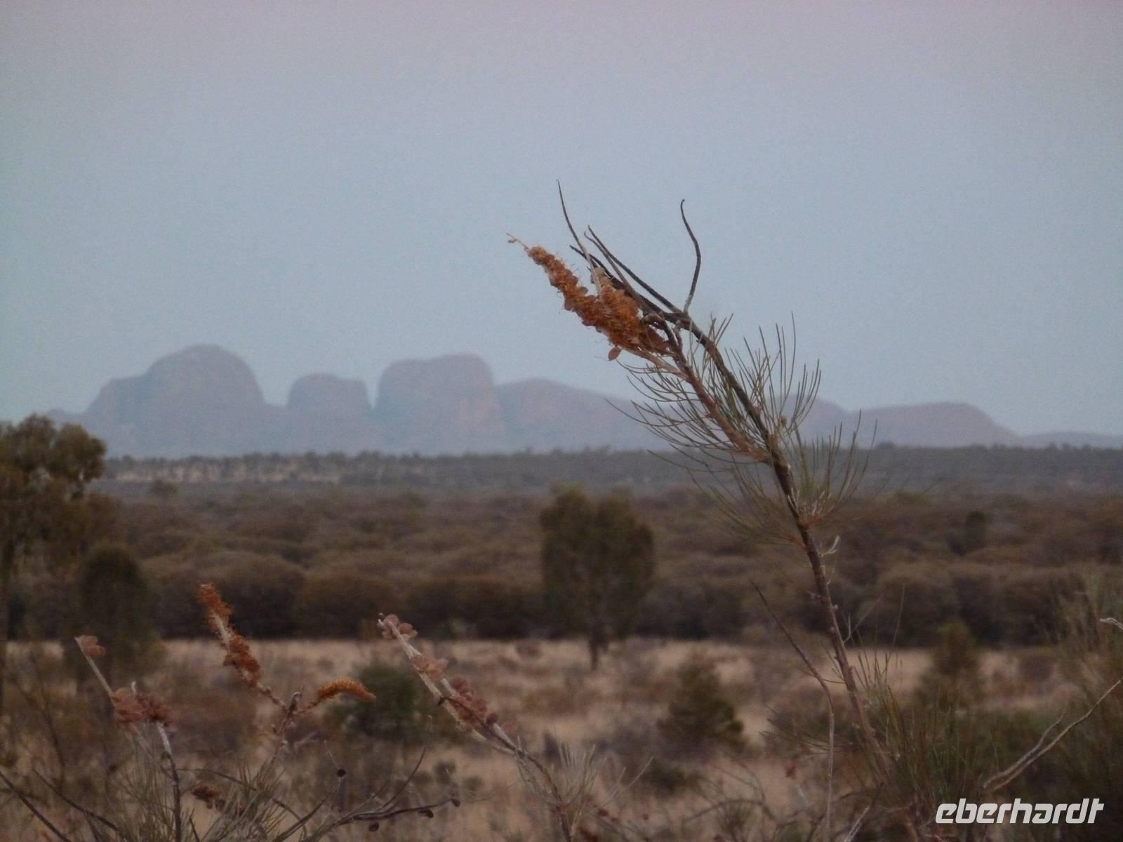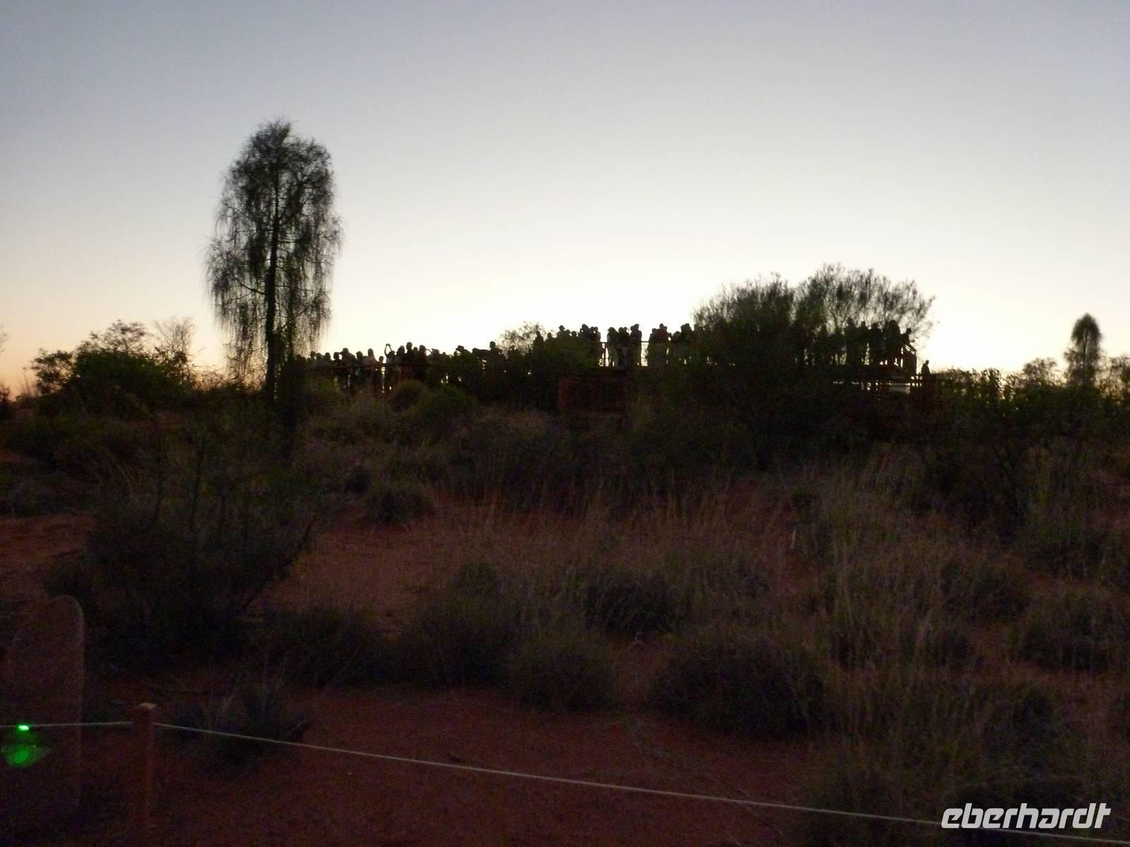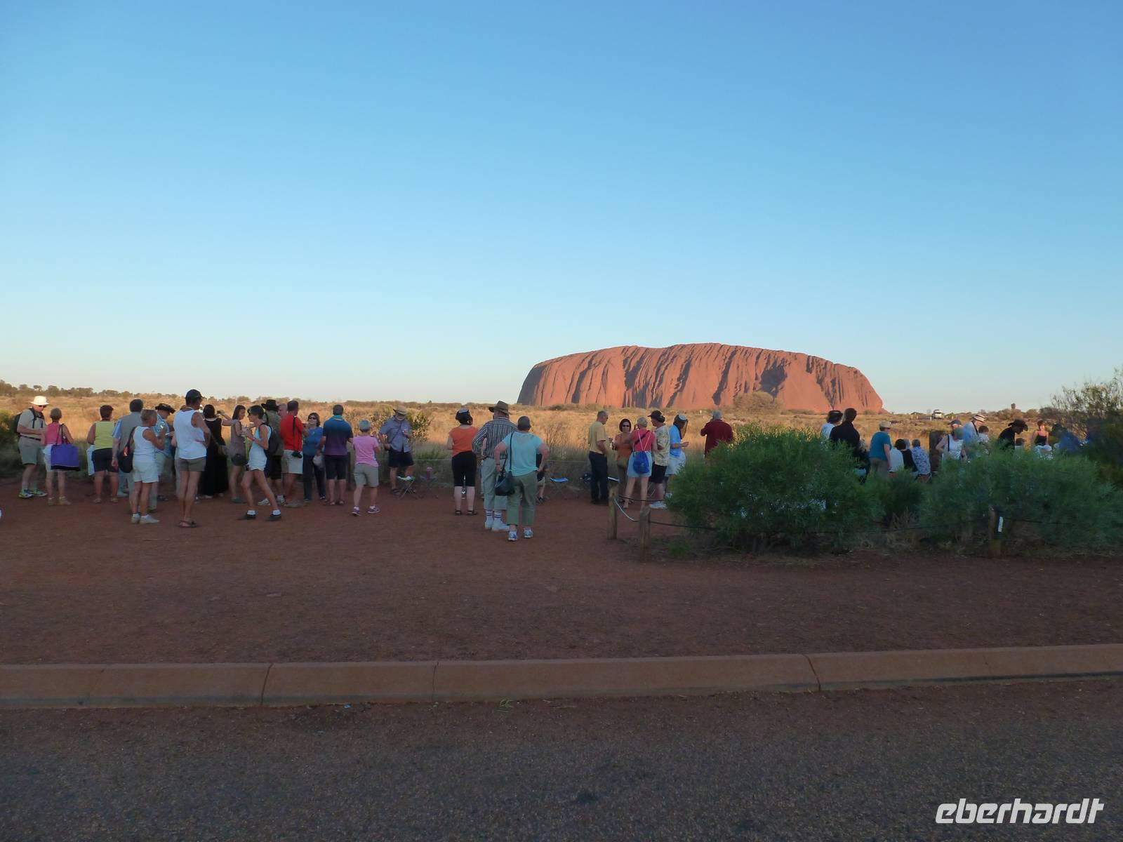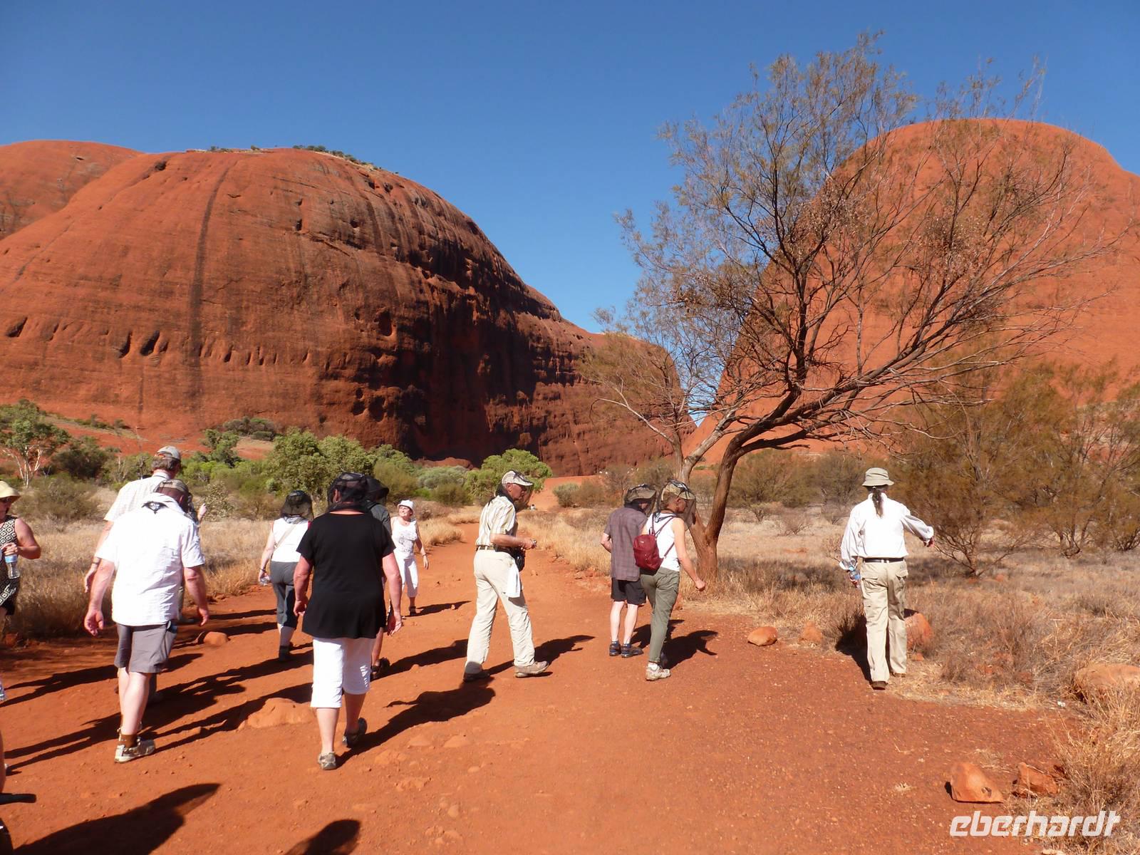 Heute war es soweit: wir verließen Victoria und reisten voller Vorfreude ins Outback. Über Sydney flogen wir mit Virgin australia auf 2 sehr angenehmen Flügen nach Ayers Rock ins Nördliche Territorium. Schon von oben sahen wir die rote Erde, die Salzseen und die unendliche Wüste „Simpson Dessert". In Yulara am berühmten Uluru angekommen, erwartete uns schon unser Reiseleiter Marcel Ponti. Und noch etwas erwartete uns: die Hitze der Würste, 39 Grad Celcius! Aber das gehört nun einmal dazu dachten wir uns und so machten wir uns auf den Weg: Erst einmal in unser Hotel Outback Pioneer, welches sich in der Nähe des Nationalpark „Kata Tjuta Uluru" befindet. Wir waren sehr glücklich, dass wir unsere Zimmer gleich beziehen konnten und so hatten wir vor unserem Nachmittagsausflug noch genügend Zeit, um die Beine hochzulegen oder den kleinen Ort Yulara zu erkunden. Nach der Mittagssonne fuhren wir mit unserem Buschauffeur John uns Marcel zu Kata Tjuta, eine beeindruckende Feldformation in der Nähe des Uluru. Es war wunderschön - rote Erde, rote Felsen, und drumherum unendliche Outbackwüste. Wir spazierten in das Tal der Winde "Valley of the Winds" - ein Wanderweg, welcher uns einen ersten sehr guten Eindruck der gigantischen Landschaft hier draußen und den harten Lebensbedingungen der Ureinwohner bei dieser extremen Hitze verschaffte. Und dann kam ein weiterer, großartiger Höhepunkt unserer Reise: der Sonnenuntergang am Uluru. Wir fuhren auf den großen Parkplatz und natürlich waren dort auch viele andere Gäste, mit welchen wir gemeinsam dieses Naturschauspiel erleben wollten. Kalter Sekt, Orangensaft und leckere Häppchen waren schon für uns vorbereitet. Wir nahmen uns Zeit, um die verschiedenen Farbtöne des für die Ureinwohner so bedeutenden Steines beim Sonnenuntergang zu genießen. Nach schönen Fotoaufnahmen, einer sehr tollen Atmosphäre und viel Freude fuhren wir gegen 19 Uhr zurück ins Hotel. Den Abend ließen wir bei einem echten „Aussie Barbie" ausklingen - wir grillten uns bei einem kühlen Bierchen Steaks, Büffelwurst oder Känguru auf dem Grill - auch wieder ein neues, witziges Erlebnis!