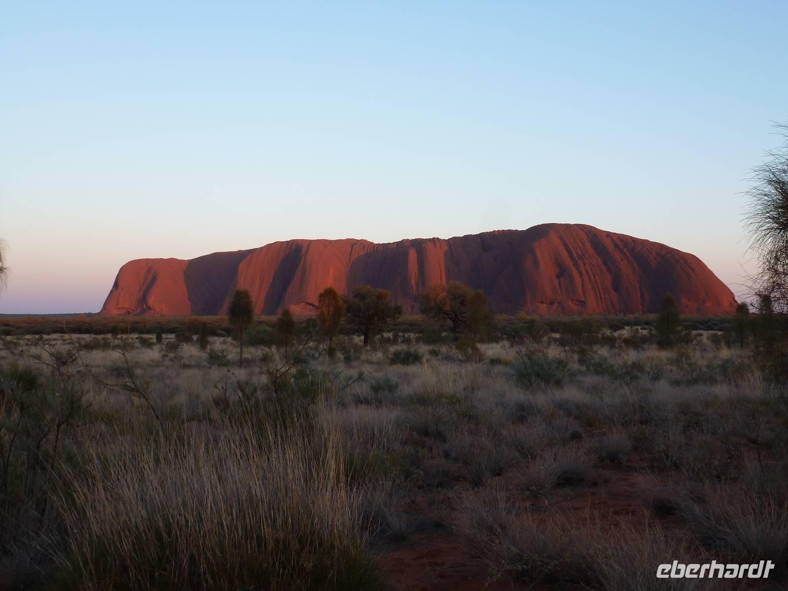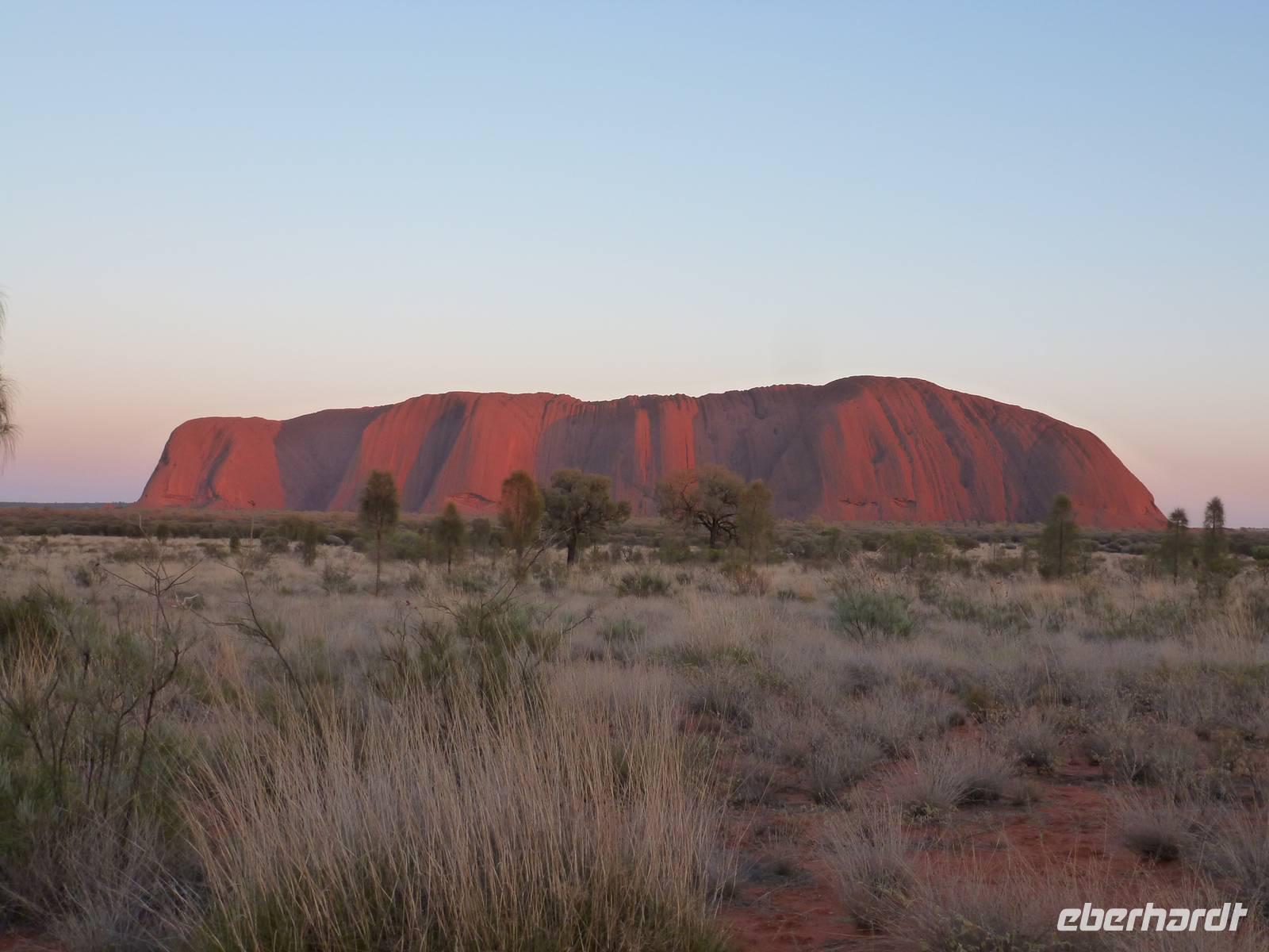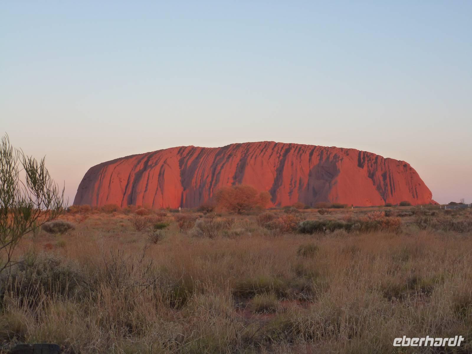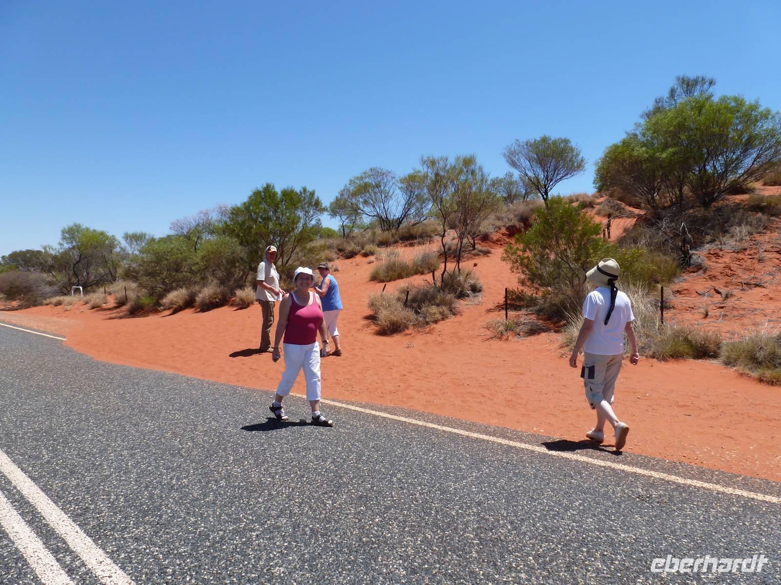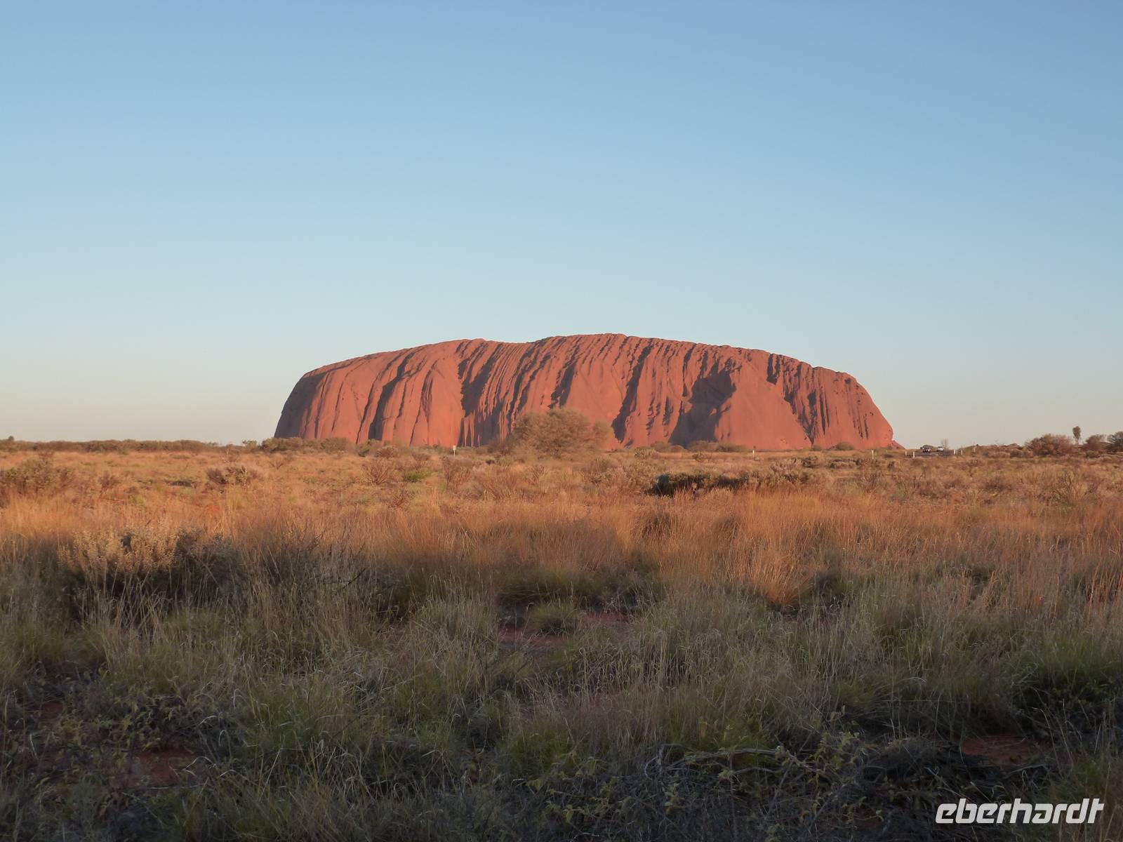 Heute war es soweit: wir verließen Victoria und reisten voller Vorfreude ins Outback. Über Sydney flogen wir mit Virgin australia auf 2 sehr angenehmen Flügen nach Ayers Rock ins Nördliche Territorium. Schon von oben sahen wir die rote Erde, die Salzseen und die unendliche Wüste „Simpson Dessert". In Yulara am berühmten Uluru angekommen, erwartete uns schon unser Reiseleiter Marcel Ponti. Und noch etwas erwartete uns: die Hitze der Würste, 39 Grad Celcius! Aber das gehört nun einmal dazu dachten wir uns und so machten wir uns auf den Weg: Erst einmal in unser Hotel Outback Pioneer, welches sich in der Nähe des Nationalpark „Kata Tjuta Uluru" befindet. Wir waren sehr glücklich, dass wir unsere Zimmer gleich beziehen konnten und so hatten wir vor unserem Nachmittagsausflug noch genügend Zeit, um die Beine hochzulegen oder den kleinen Ort Yulara zu erkunden. Nach der Mittagssonne fuhren wir mit unserem Buschauffeur John uns Marcel zu Kata Tjuta, eine beeindruckende Feldformation in der Nähe des Uluru. Es war wunderschön - rote Erde, rote Felsen, und drumherum unendliche Outbackwüste. Wir spazierten in das Tal der Winde "Valley of the Winds" - ein Wanderweg, welcher uns einen ersten sehr guten Eindruck der gigantischen Landschaft hier draußen und den harten Lebensbedingungen der Ureinwohner bei dieser extremen Hitze verschaffte. Und dann kam ein weiterer, großartiger Höhepunkt unserer Reise: der Sonnenuntergang am Uluru. Wir fuhren auf den großen Parkplatz und natürlich waren dort auch viele andere Gäste, mit welchen wir gemeinsam dieses Naturschauspiel erleben wollten. Kalter Sekt, Orangensaft und leckere Häppchen waren schon für uns vorbereitet. Wir nahmen uns Zeit, um die verschiedenen Farbtöne des für die Ureinwohner so bedeutenden Steines beim Sonnenuntergang zu genießen. Nach schönen Fotoaufnahmen, einer sehr tollen Atmosphäre und viel Freude fuhren wir gegen 19 Uhr zurück ins Hotel. Den Abend ließen wir bei einem echten „Aussie Barbie" ausklingen - wir grillten uns bei einem kühlen Bierchen Steaks, Büffelwurst oder Känguru auf dem Grill - auch wieder ein neues, witziges Erlebnis!