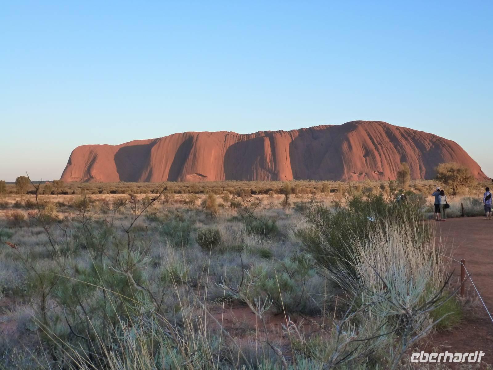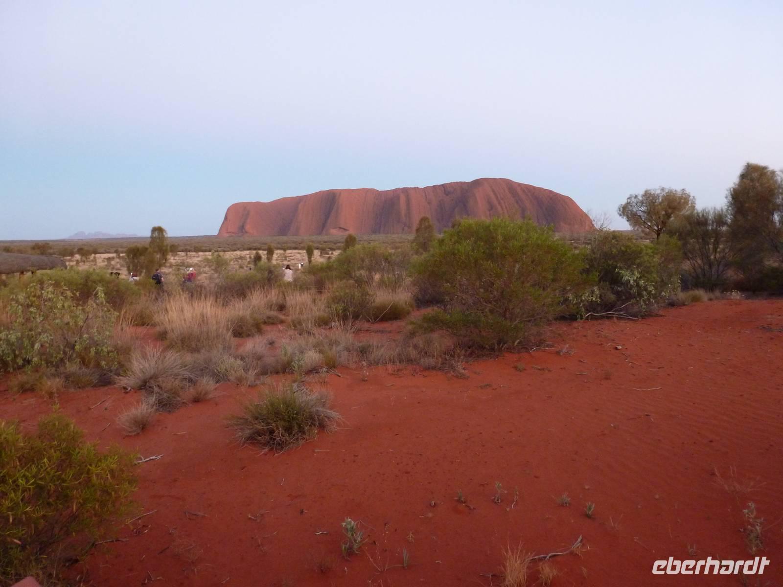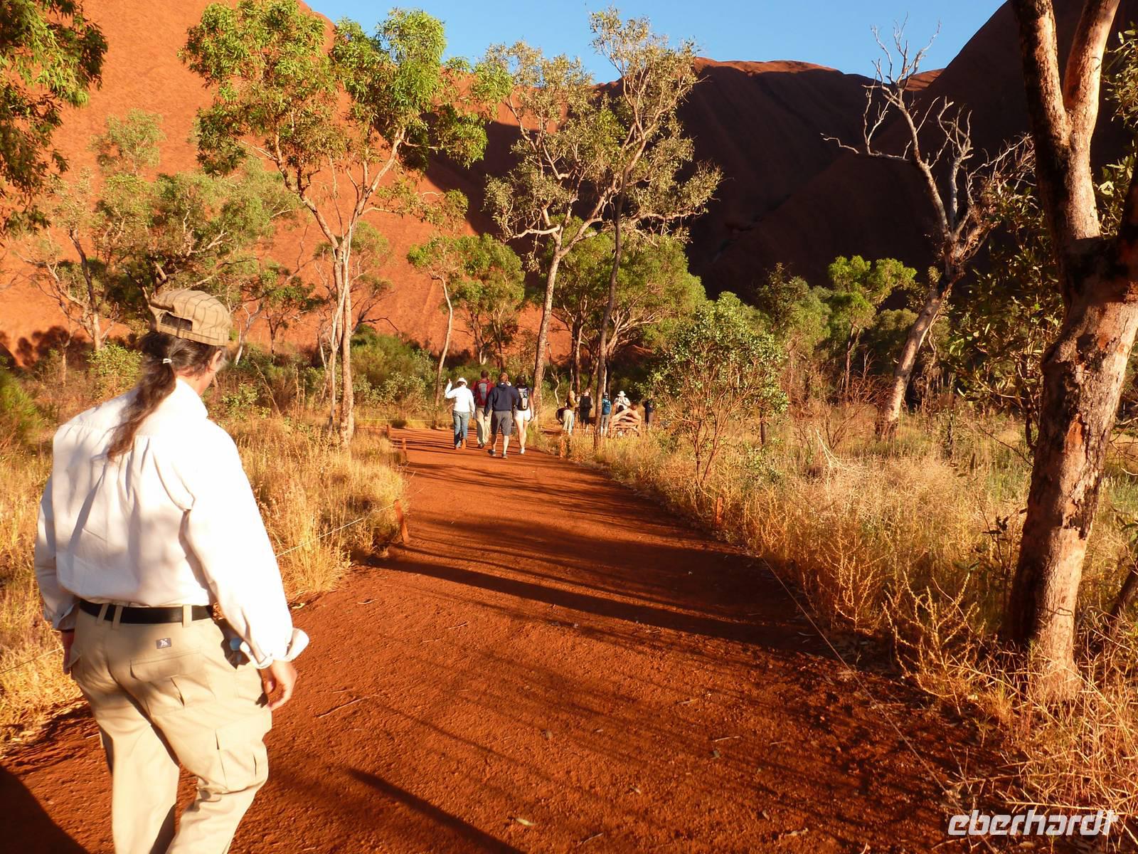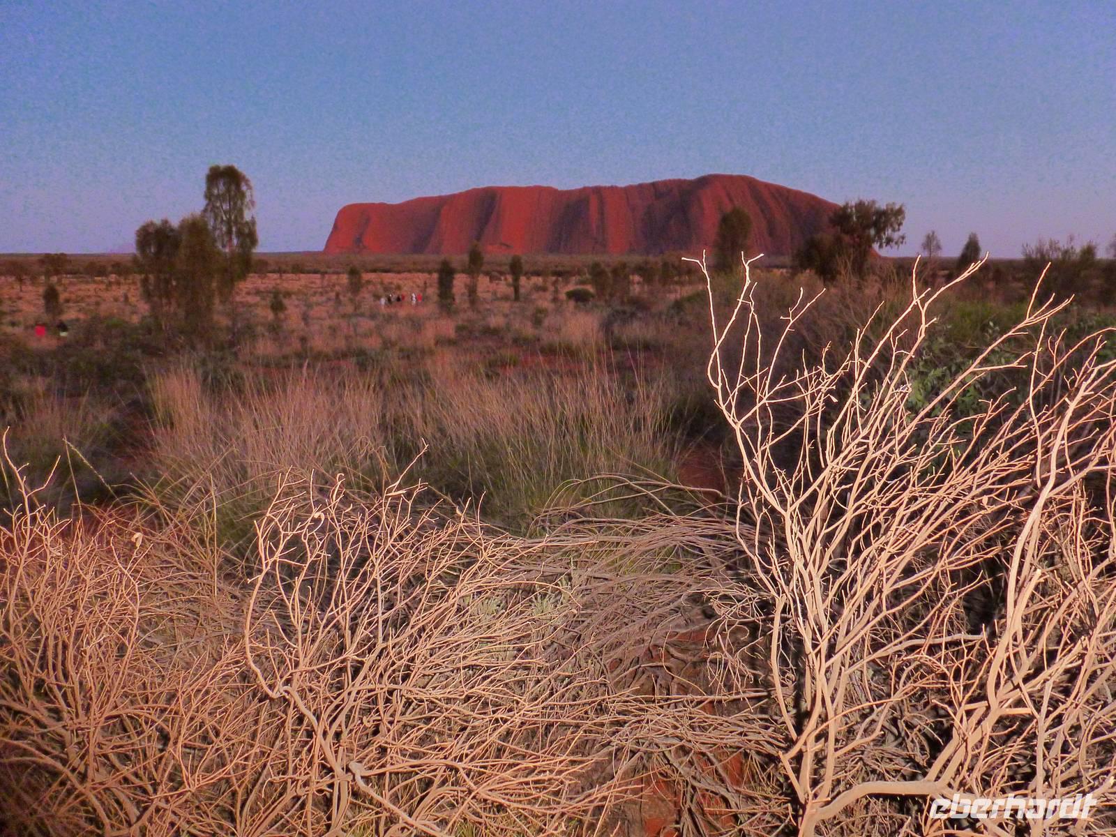 Heute war es soweit: wir verließen Victoria und reisten voller Vorfreude ins Outback. Über Sydney flogen wir mit Virgin australia auf 2 sehr angenehmen Flügen nach Ayers Rock ins Nördliche Territorium. Schon von oben sahen wir die rote Erde, die Salzseen und die unendliche Wüste „Simpson Dessert". In Yulara am berühmten Uluru angekommen, erwartete uns schon unser Reiseleiter Marcel Ponti. Und noch etwas erwartete uns: die Hitze der Würste, 39 Grad Celcius! Aber das gehört nun einmal dazu dachten wir uns und so machten wir uns auf den Weg: Erst einmal in unser Hotel Outback Pioneer, welches sich in der Nähe des Nationalpark „Kata Tjuta Uluru" befindet. Wir waren sehr glücklich, dass wir unsere Zimmer gleich beziehen konnten und so hatten wir vor unserem Nachmittagsausflug noch genügend Zeit, um die Beine hochzulegen oder den kleinen Ort Yulara zu erkunden. Nach der Mittagssonne fuhren wir mit unserem Buschauffeur John uns Marcel zu Kata Tjuta, eine beeindruckende Feldformation in der Nähe des Uluru. Es war wunderschön - rote Erde, rote Felsen, und drumherum unendliche Outbackwüste. Wir spazierten in das Tal der Winde "Valley of the Winds" - ein Wanderweg, welcher uns einen ersten sehr guten Eindruck der gigantischen Landschaft hier draußen und den harten Lebensbedingungen der Ureinwohner bei dieser extremen Hitze verschaffte. Und dann kam ein weiterer, großartiger Höhepunkt unserer Reise: der Sonnenuntergang am Uluru. Wir fuhren auf den großen Parkplatz und natürlich waren dort auch viele andere Gäste, mit welchen wir gemeinsam dieses Naturschauspiel erleben wollten. Kalter Sekt, Orangensaft und leckere Häppchen waren schon für uns vorbereitet. Wir nahmen uns Zeit, um die verschiedenen Farbtöne des für die Ureinwohner so bedeutenden Steines beim Sonnenuntergang zu genießen. Nach schönen Fotoaufnahmen, einer sehr tollen Atmosphäre und viel Freude fuhren wir gegen 19 Uhr zurück ins Hotel. Den Abend ließen wir bei einem echten „Aussie Barbie" ausklingen - wir grillten uns bei einem kühlen Bierchen Steaks, Büffelwurst oder Känguru auf dem Grill - auch wieder ein neues, witziges Erlebnis!