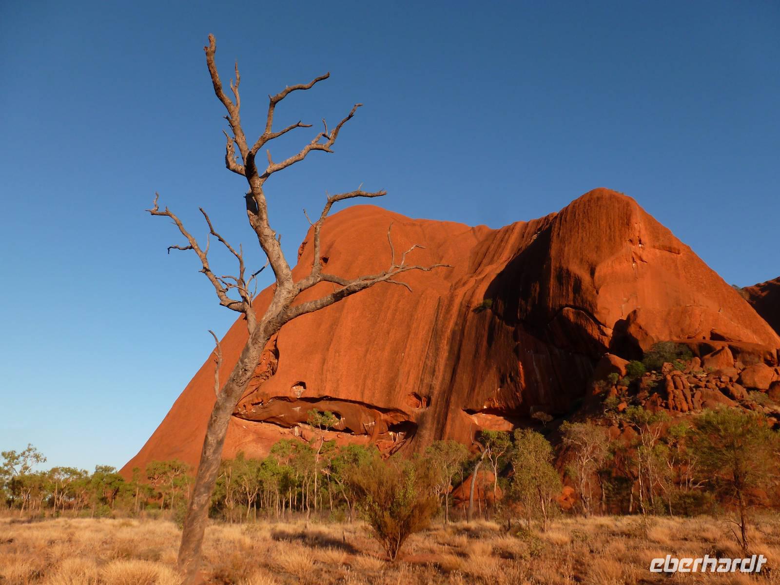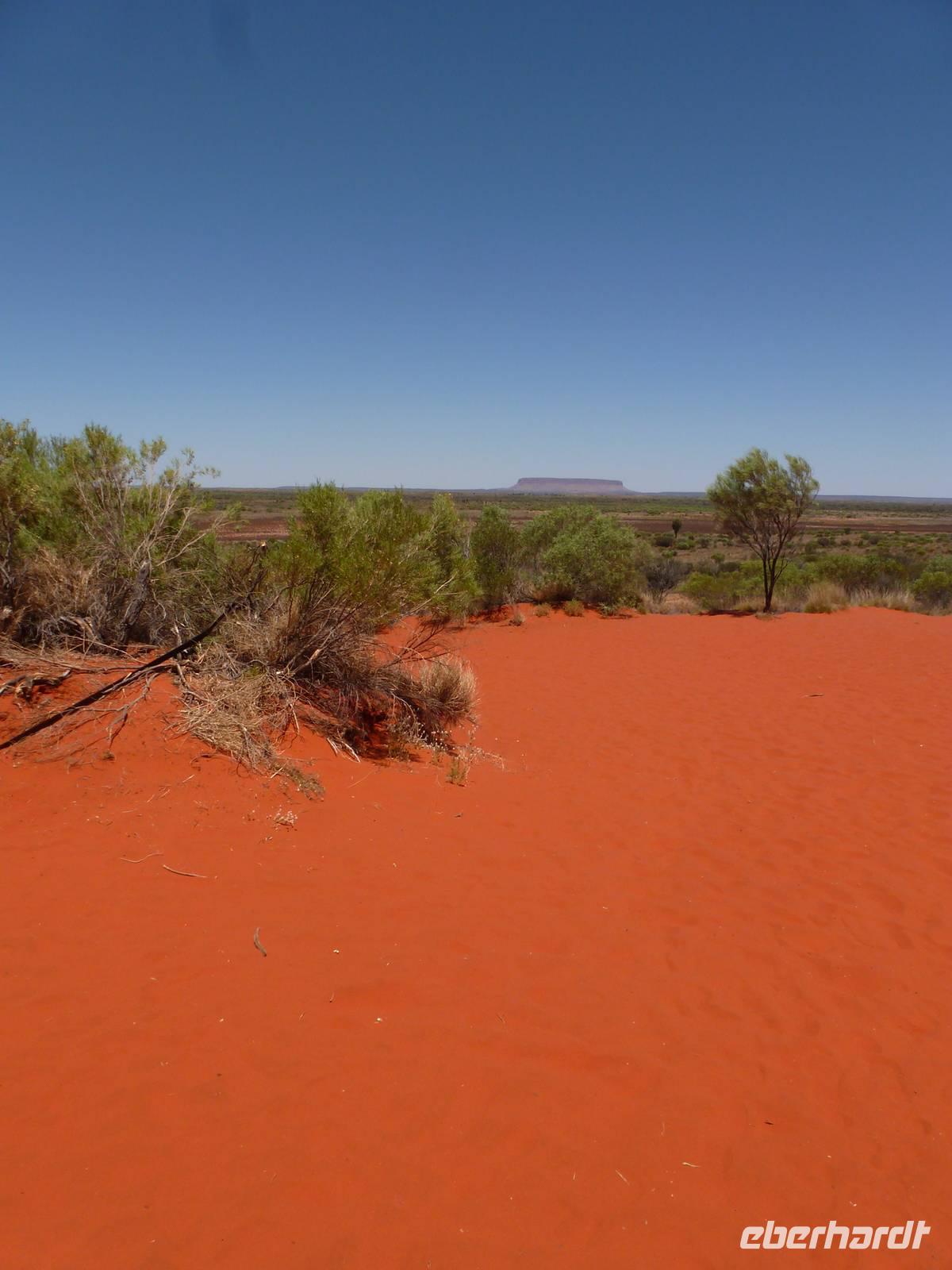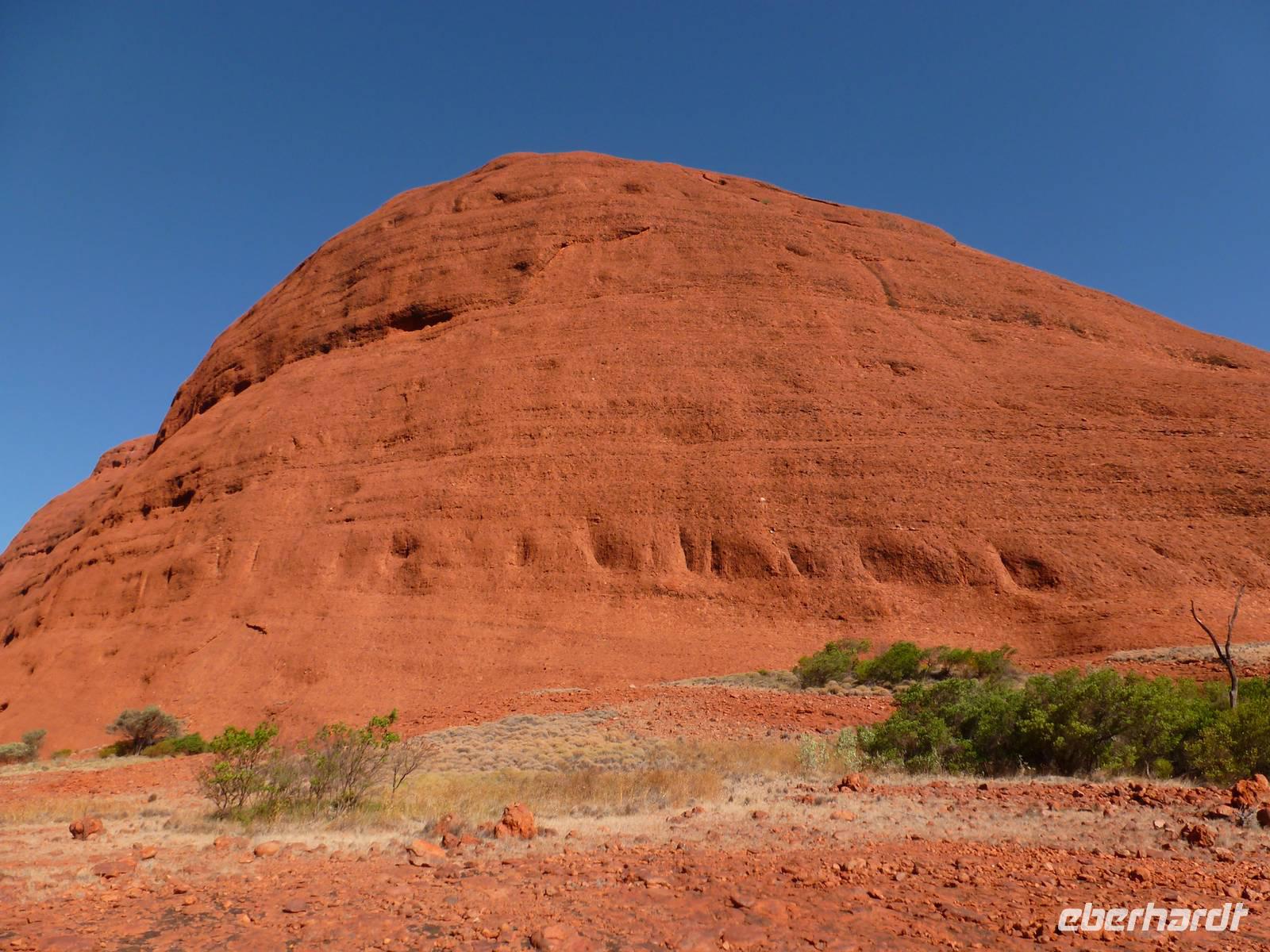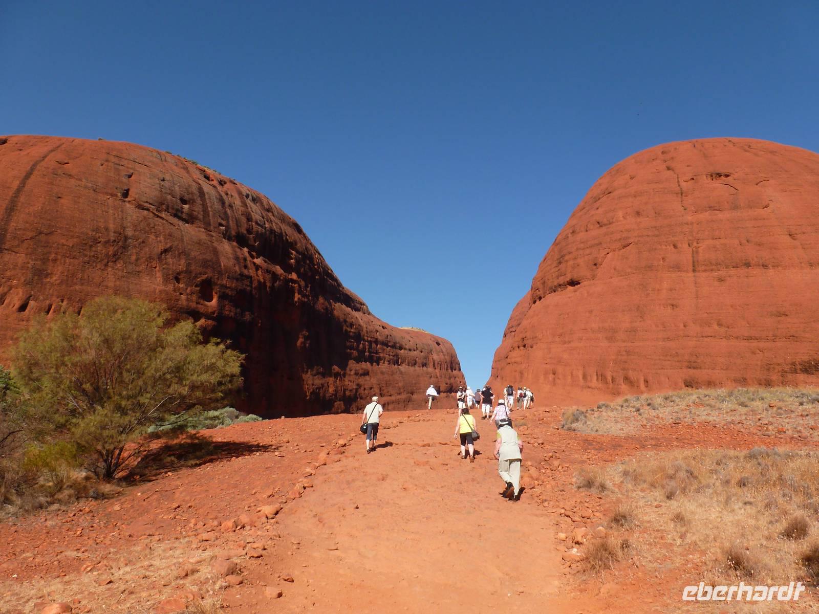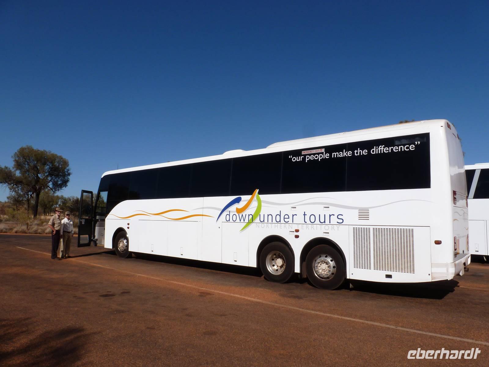 Heute war es soweit: wir verließen Victoria und reisten voller Vorfreude ins Outback. Über Sydney flogen wir mit Virgin australia auf 2 sehr angenehmen Flügen nach Ayers Rock ins Nördliche Territorium. Schon von oben sahen wir die rote Erde, die Salzseen und die unendliche Wüste „Simpson Dessert". In Yulara am berühmten Uluru angekommen, erwartete uns schon unser Reiseleiter Marcel Ponti. Und noch etwas erwartete uns: die Hitze der Würste, 39 Grad Celcius! Aber das gehört nun einmal dazu dachten wir uns und so machten wir uns auf den Weg: Erst einmal in unser Hotel Outback Pioneer, welches sich in der Nähe des Nationalpark „Kata Tjuta Uluru" befindet. Wir waren sehr glücklich, dass wir unsere Zimmer gleich beziehen konnten und so hatten wir vor unserem Nachmittagsausflug noch genügend Zeit, um die Beine hochzulegen oder den kleinen Ort Yulara zu erkunden. Nach der Mittagssonne fuhren wir mit unserem Buschauffeur John uns Marcel zu Kata Tjuta, eine beeindruckende Feldformation in der Nähe des Uluru. Es war wunderschön - rote Erde, rote Felsen, und drumherum unendliche Outbackwüste. Wir spazierten in das Tal der Winde "Valley of the Winds" - ein Wanderweg, welcher uns einen ersten sehr guten Eindruck der gigantischen Landschaft hier draußen und den harten Lebensbedingungen der Ureinwohner bei dieser extremen Hitze verschaffte. Und dann kam ein weiterer, großartiger Höhepunkt unserer Reise: der Sonnenuntergang am Uluru. Wir fuhren auf den großen Parkplatz und natürlich waren dort auch viele andere Gäste, mit welchen wir gemeinsam dieses Naturschauspiel erleben wollten. Kalter Sekt, Orangensaft und leckere Häppchen waren schon für uns vorbereitet. Wir nahmen uns Zeit, um die verschiedenen Farbtöne des für die Ureinwohner so bedeutenden Steines beim Sonnenuntergang zu genießen. Nach schönen Fotoaufnahmen, einer sehr tollen Atmosphäre und viel Freude fuhren wir gegen 19 Uhr zurück ins Hotel. Den Abend ließen wir bei einem echten „Aussie Barbie" ausklingen - wir grillten uns bei einem kühlen Bierchen Steaks, Büffelwurst oder Känguru auf dem Grill - auch wieder ein neues, witziges Erlebnis!
