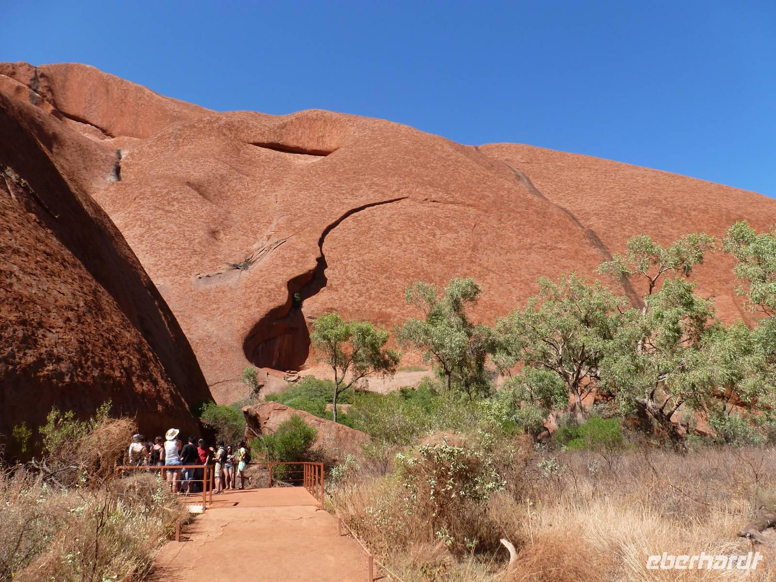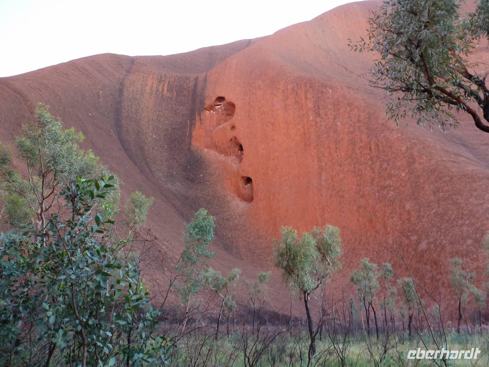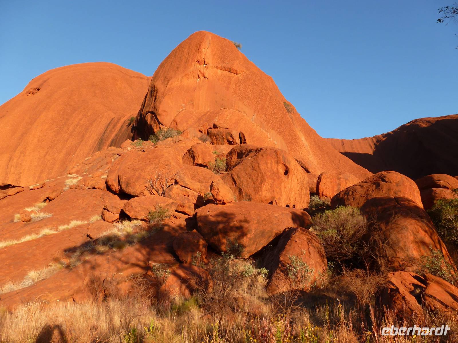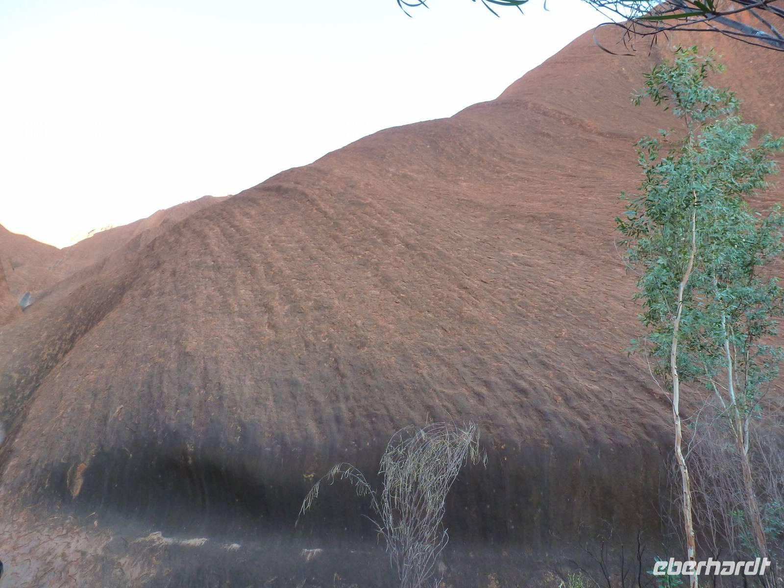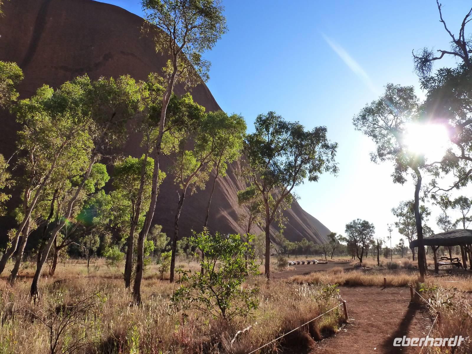 Heute war es soweit: wir verließen Victoria und reisten voller Vorfreude ins Outback. Über Sydney flogen wir mit Virgin australia auf 2 sehr angenehmen Flügen nach Ayers Rock ins Nördliche Territorium. Schon von oben sahen wir die rote Erde, die Salzseen und die unendliche Wüste „Simpson Dessert". In Yulara am berühmten Uluru angekommen, erwartete uns schon unser Reiseleiter Marcel Ponti. Und noch etwas erwartete uns: die Hitze der Würste, 39 Grad Celcius! Aber das gehört nun einmal dazu dachten wir uns und so machten wir uns auf den Weg: Erst einmal in unser Hotel Outback Pioneer, welches sich in der Nähe des Nationalpark „Kata Tjuta Uluru" befindet. Wir waren sehr glücklich, dass wir unsere Zimmer gleich beziehen konnten und so hatten wir vor unserem Nachmittagsausflug noch genügend Zeit, um die Beine hochzulegen oder den kleinen Ort Yulara zu erkunden. Nach der Mittagssonne fuhren wir mit unserem Buschauffeur John uns Marcel zu Kata Tjuta, eine beeindruckende Feldformation in der Nähe des Uluru. Es war wunderschön - rote Erde, rote Felsen, und drumherum unendliche Outbackwüste. Wir spazierten in das Tal der Winde "Valley of the Winds" - ein Wanderweg, welcher uns einen ersten sehr guten Eindruck der gigantischen Landschaft hier draußen und den harten Lebensbedingungen der Ureinwohner bei dieser extremen Hitze verschaffte. Und dann kam ein weiterer, großartiger Höhepunkt unserer Reise: der Sonnenuntergang am Uluru. Wir fuhren auf den großen Parkplatz und natürlich waren dort auch viele andere Gäste, mit welchen wir gemeinsam dieses Naturschauspiel erleben wollten. Kalter Sekt, Orangensaft und leckere Häppchen waren schon für uns vorbereitet. Wir nahmen uns Zeit, um die verschiedenen Farbtöne des für die Ureinwohner so bedeutenden Steines beim Sonnenuntergang zu genießen. Nach schönen Fotoaufnahmen, einer sehr tollen Atmosphäre und viel Freude fuhren wir gegen 19 Uhr zurück ins Hotel. Den Abend ließen wir bei einem echten „Aussie Barbie" ausklingen - wir grillten uns bei einem kühlen Bierchen Steaks, Büffelwurst oder Känguru auf dem Grill - auch wieder ein neues, witziges Erlebnis!