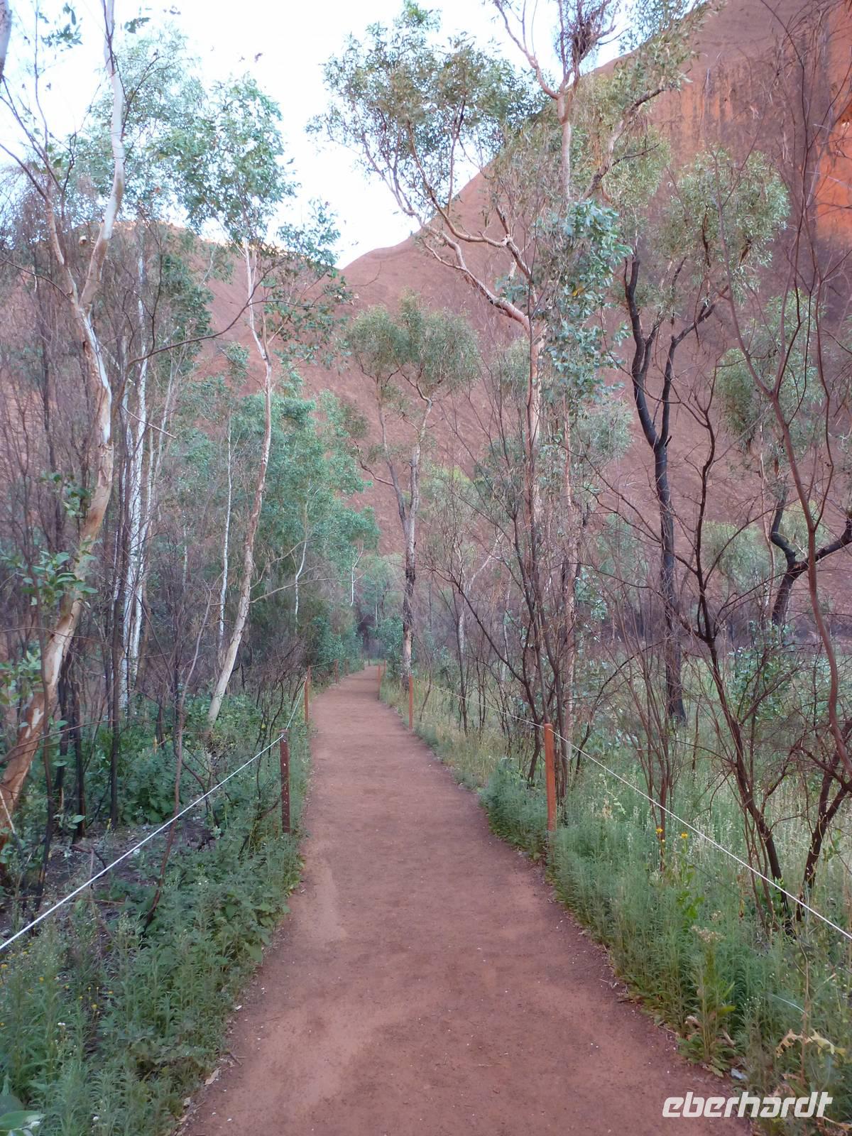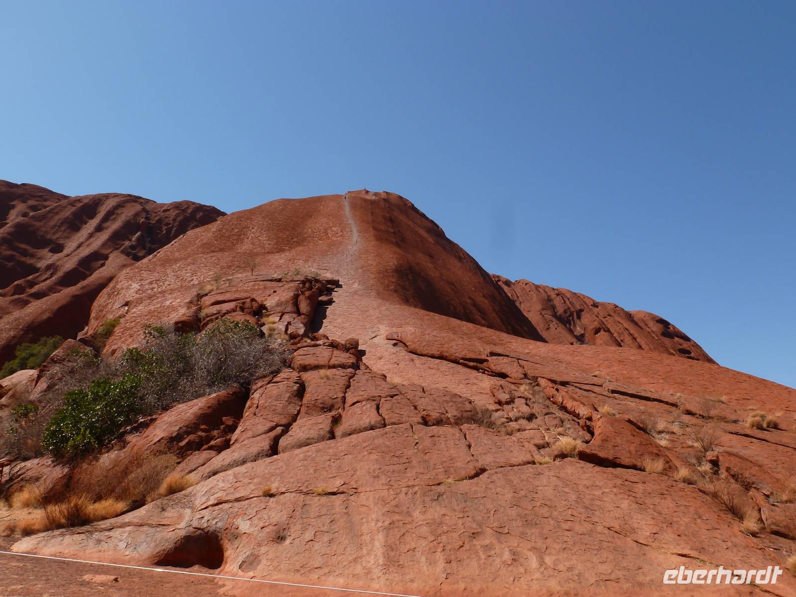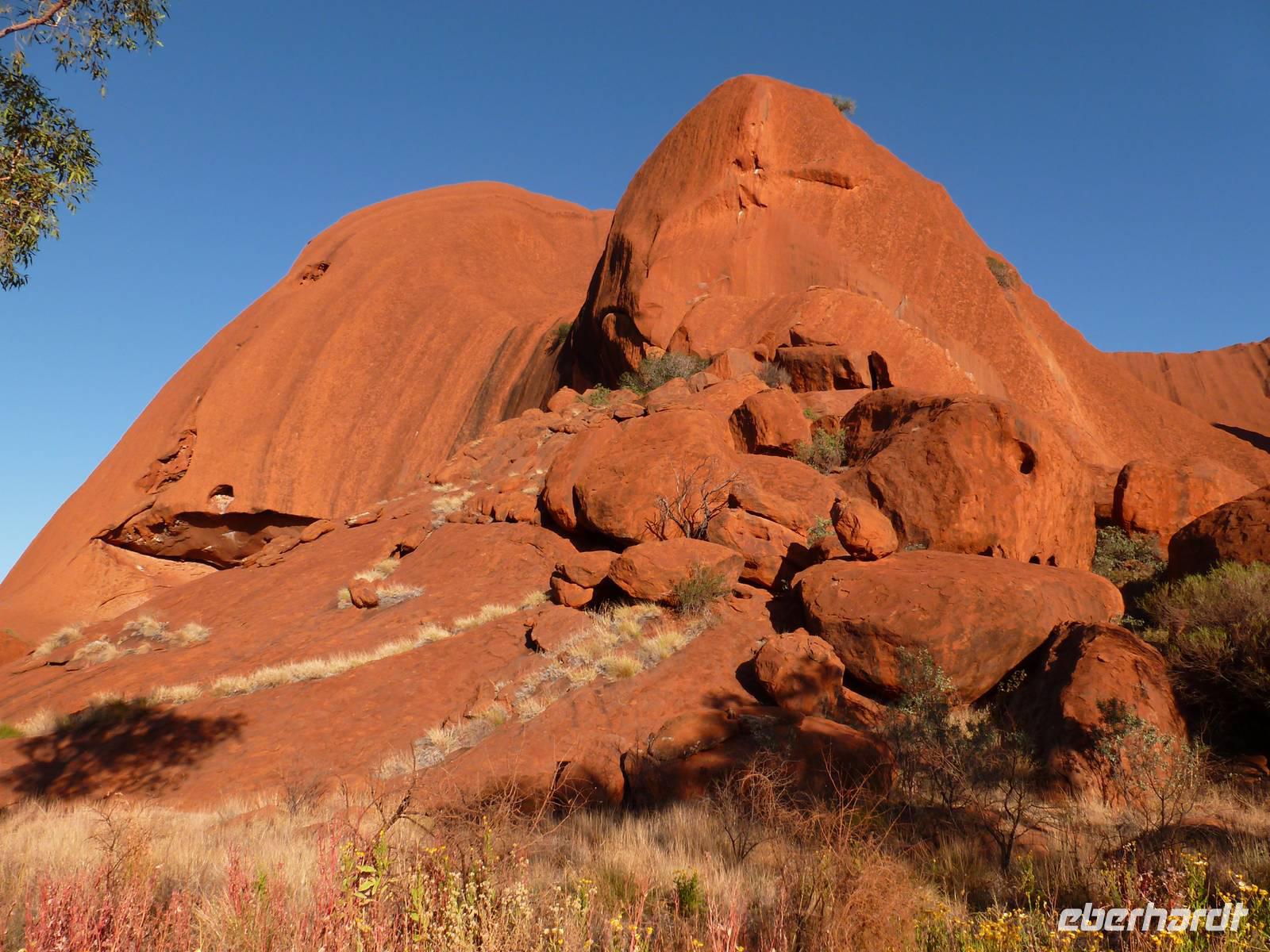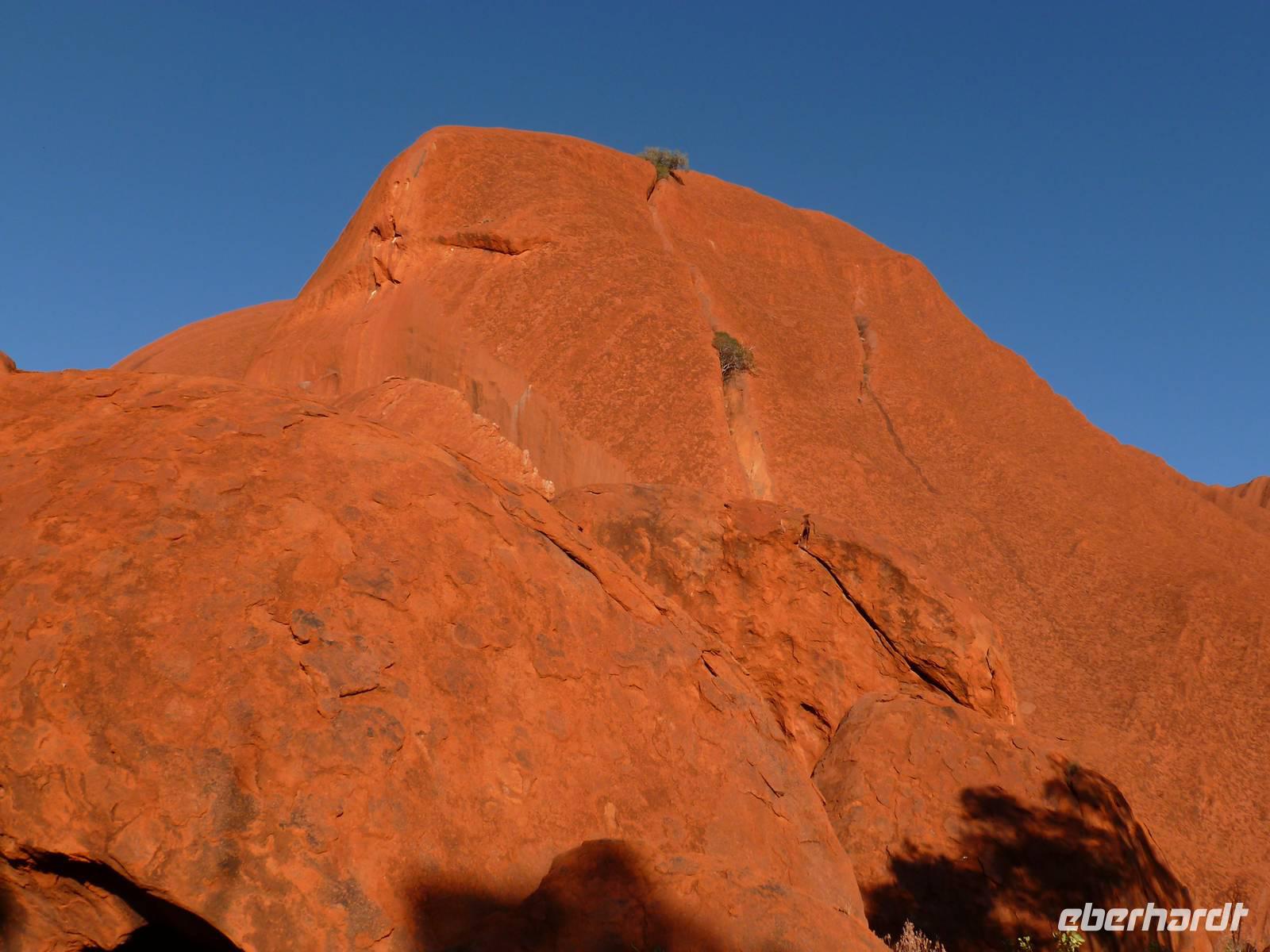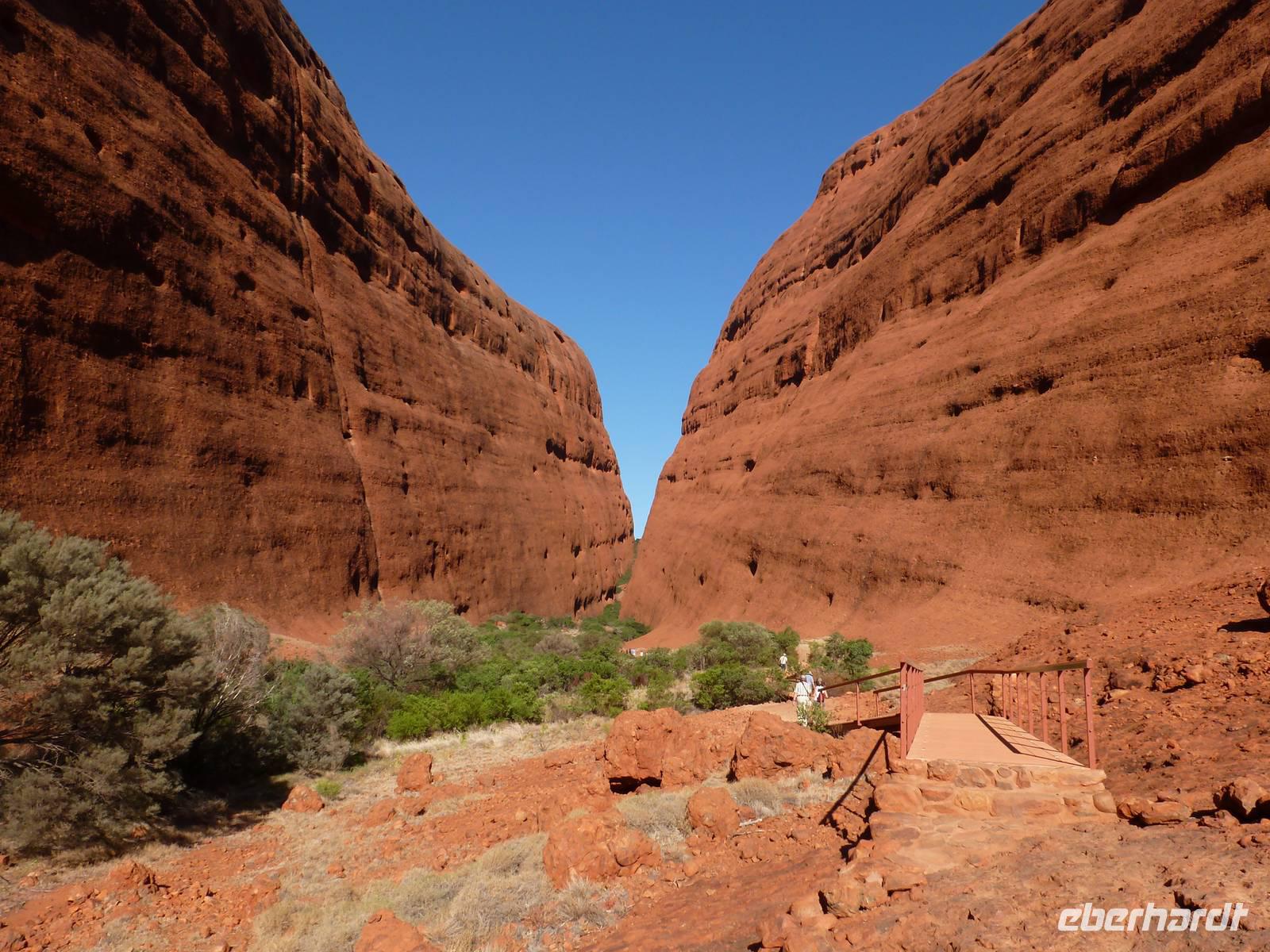 Heute war es soweit: wir verließen Victoria und reisten voller Vorfreude ins Outback. Über Sydney flogen wir mit Virgin australia auf 2 sehr angenehmen Flügen nach Ayers Rock ins Nördliche Territorium. Schon von oben sahen wir die rote Erde, die Salzseen und die unendliche Wüste „Simpson Dessert". In Yulara am berühmten Uluru angekommen, erwartete uns schon unser Reiseleiter Marcel Ponti. Und noch etwas erwartete uns: die Hitze der Würste, 39 Grad Celcius! Aber das gehört nun einmal dazu dachten wir uns und so machten wir uns auf den Weg: Erst einmal in unser Hotel Outback Pioneer, welches sich in der Nähe des Nationalpark „Kata Tjuta Uluru" befindet. Wir waren sehr glücklich, dass wir unsere Zimmer gleich beziehen konnten und so hatten wir vor unserem Nachmittagsausflug noch genügend Zeit, um die Beine hochzulegen oder den kleinen Ort Yulara zu erkunden. Nach der Mittagssonne fuhren wir mit unserem Buschauffeur John uns Marcel zu Kata Tjuta, eine beeindruckende Feldformation in der Nähe des Uluru. Es war wunderschön - rote Erde, rote Felsen, und drumherum unendliche Outbackwüste. Wir spazierten in das Tal der Winde "Valley of the Winds" - ein Wanderweg, welcher uns einen ersten sehr guten Eindruck der gigantischen Landschaft hier draußen und den harten Lebensbedingungen der Ureinwohner bei dieser extremen Hitze verschaffte. Und dann kam ein weiterer, großartiger Höhepunkt unserer Reise: der Sonnenuntergang am Uluru. Wir fuhren auf den großen Parkplatz und natürlich waren dort auch viele andere Gäste, mit welchen wir gemeinsam dieses Naturschauspiel erleben wollten. Kalter Sekt, Orangensaft und leckere Häppchen waren schon für uns vorbereitet. Wir nahmen uns Zeit, um die verschiedenen Farbtöne des für die Ureinwohner so bedeutenden Steines beim Sonnenuntergang zu genießen. Nach schönen Fotoaufnahmen, einer sehr tollen Atmosphäre und viel Freude fuhren wir gegen 19 Uhr zurück ins Hotel. Den Abend ließen wir bei einem echten „Aussie Barbie" ausklingen - wir grillten uns bei einem kühlen Bierchen Steaks, Büffelwurst oder Känguru auf dem Grill - auch wieder ein neues, witziges Erlebnis!