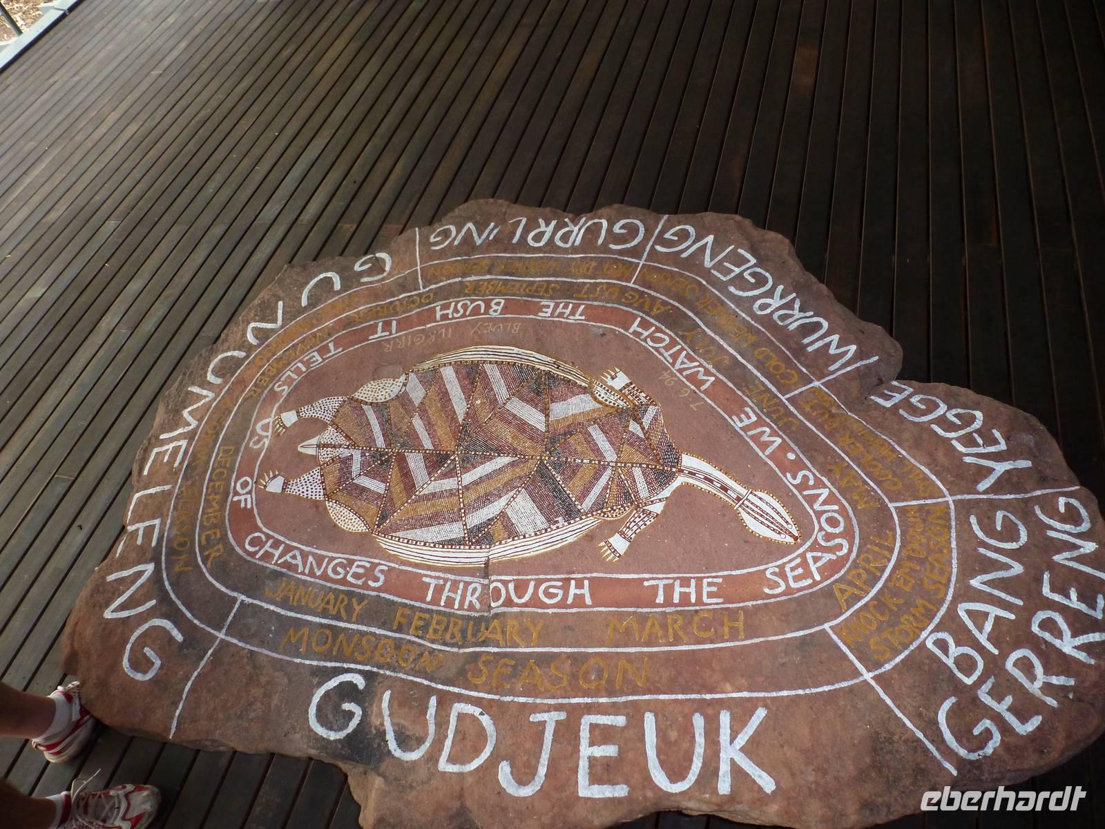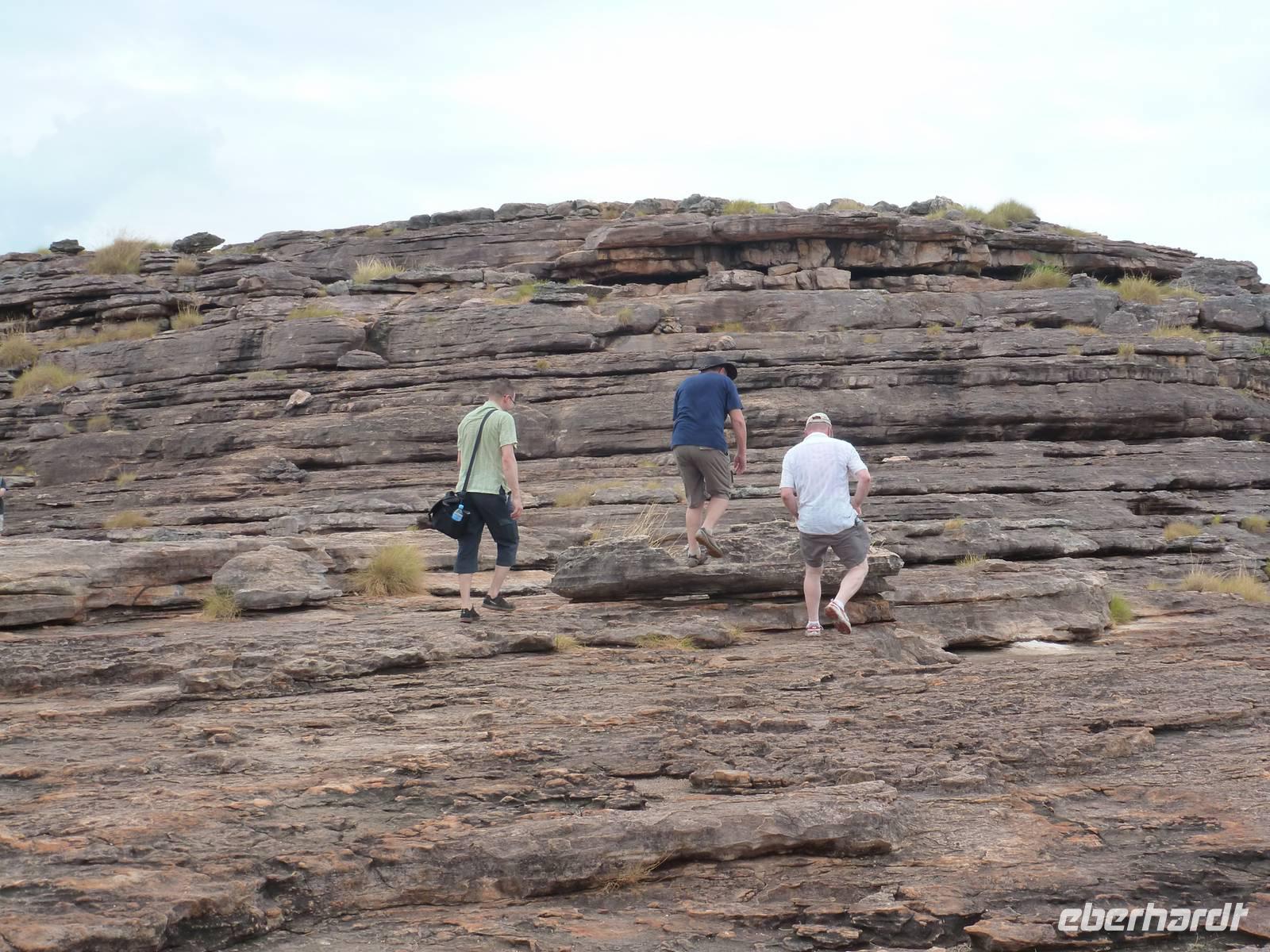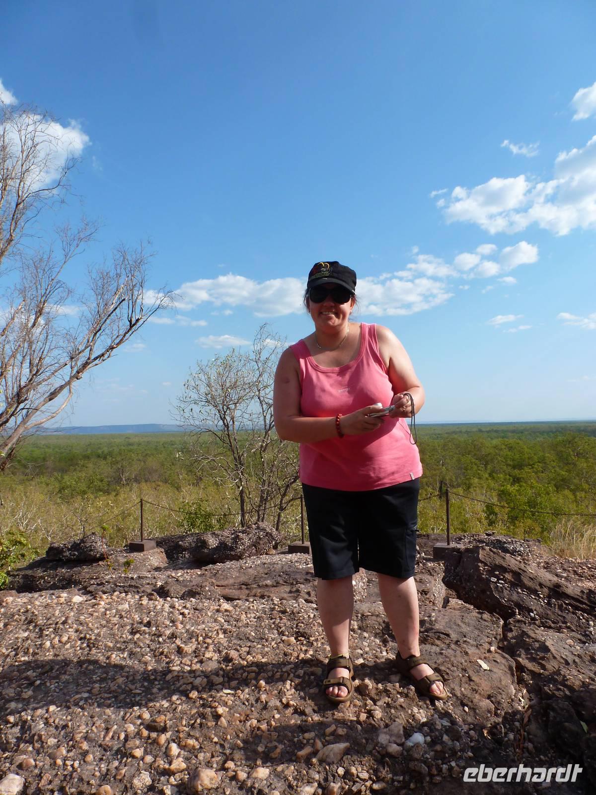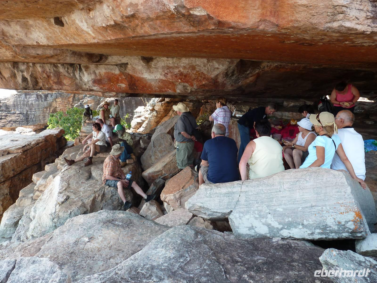 Ein großer Wochenendausflug lag vor uns: Noch vor Sonnenaufgang machten wir uns in zwei Kleinbussen auf den Weg gen Osten - in den 20000km² großen, ursprünglichen Kakadu Nationalpark und ins 4x so große Land der Ureinwohner - Arnhemland! Unsere Guides Robin und Donna fuhren uns sicher in diese tolle Landschaft. Und sogar einen weiteren runden Geburtstag durften wir heute in unserer Reisegruppe feiern. Wir fuhren über den Arnhem Highway durch den Nationalpark und erreichten bald den East Alligator Fluss, welchen wir zwar auf einer Überführung, jedoch durch Wasser mit unseren Bussen überquerten. Und wir sahen unser erstes Krokodil, welches gleich neben der Überführung im Wasser schwamm. Und schon waren wir im Arnhemland - ein fast 100000km² großes, fast unberührtes Gebiet, in dem seit tausenden Jahren Australiens Ureinwohner leben. Wir fuhren auf einer Naturpiste weiter und besuchten die Aborigine Gemeinde Oenpelli mit deren Kunstzentrum. Dor werden nach traditioneller Art tolle Bilder gemalt und Körbe von den Ureinwohnern geflochten. Ein hier lebender Mann führte uns durch das Zentrum. Und dann wanderten wir auf den für die Ureinwohner wichtigen und heiligen Berg Injalak. Die zwei Aborigine Führer Thomas und Nelson begleiteten uns auf der doch recht anspruchsvollen Tour hinauf auf den „heiligen Berg". Unterwegs zeigten sie uns bis zu 20.000 Jahre alte Felsmalereien ihrer Vorfahren. Und diese sind so toll erhalten, sehr beeindruckend. Nachdem wir auf allen vieren durch eine Felsspalte gekrabbelt sind, genossen wir ein tolles Picknick in einer Felshöhle mit gigantischem Ausblick über das Arnhemland. Wunderbar!!! Später fuhren wir zurück in den Kakadu Nationalpark, wo wir unser Hotel Aurora Kakadu Resort bezogen. Eine wunderschöne Anlage mit Bungalows, vielen Kakadus und Wildgänsen und einem tollen Pool. Den Geburtstagsabend ließen wir nach einem schönen Nachmittag im Pool gemütlich an der Bar ausklingen, wo wir Knoblauchbrot und Chips genossen.